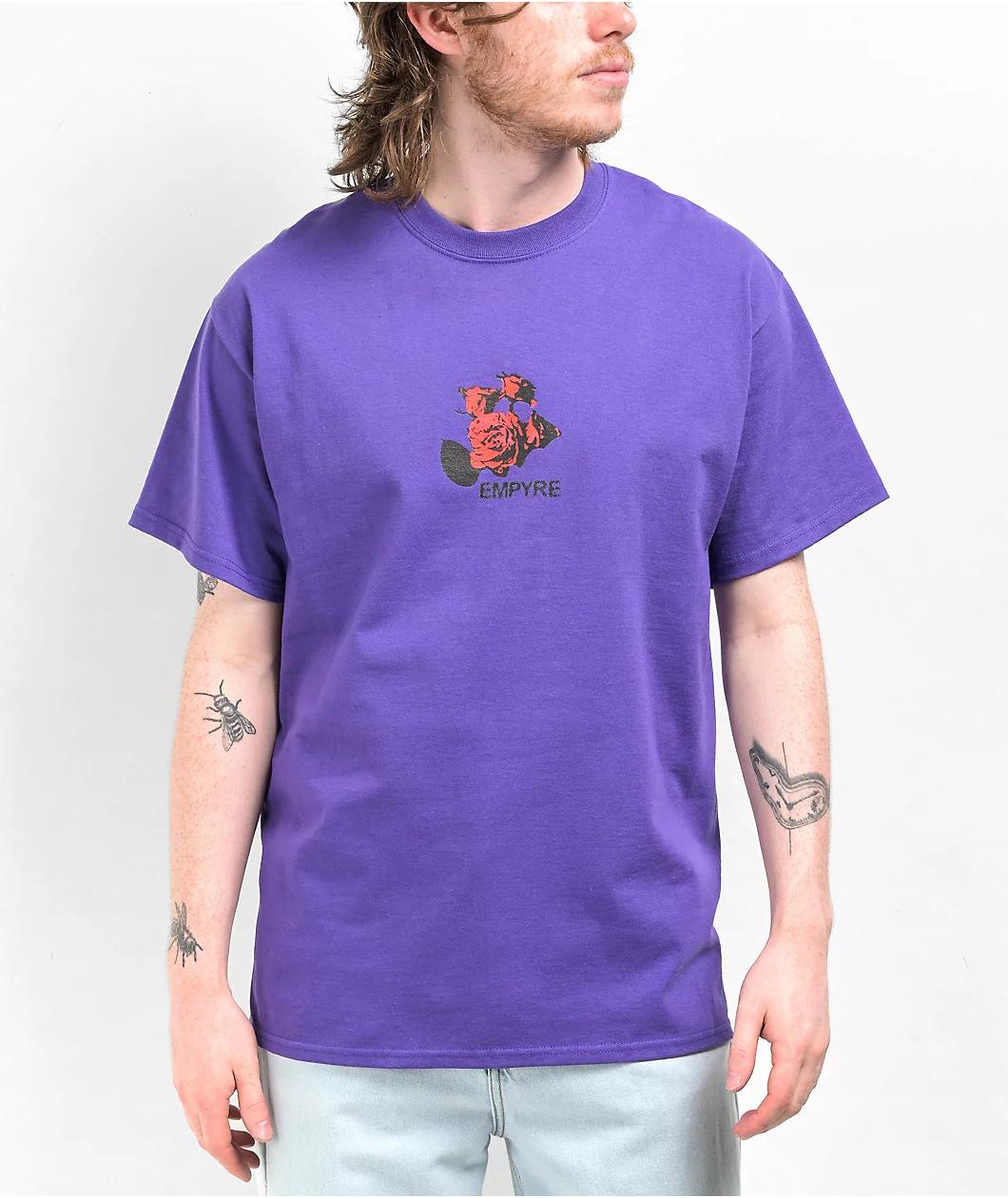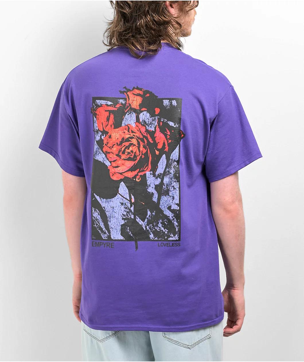 The Loveless t-shirt from Empyre Apparel comes in a vibrant purple colorway, and features a dual screen-printed graphic at the left chest and back of a bundle of roses.