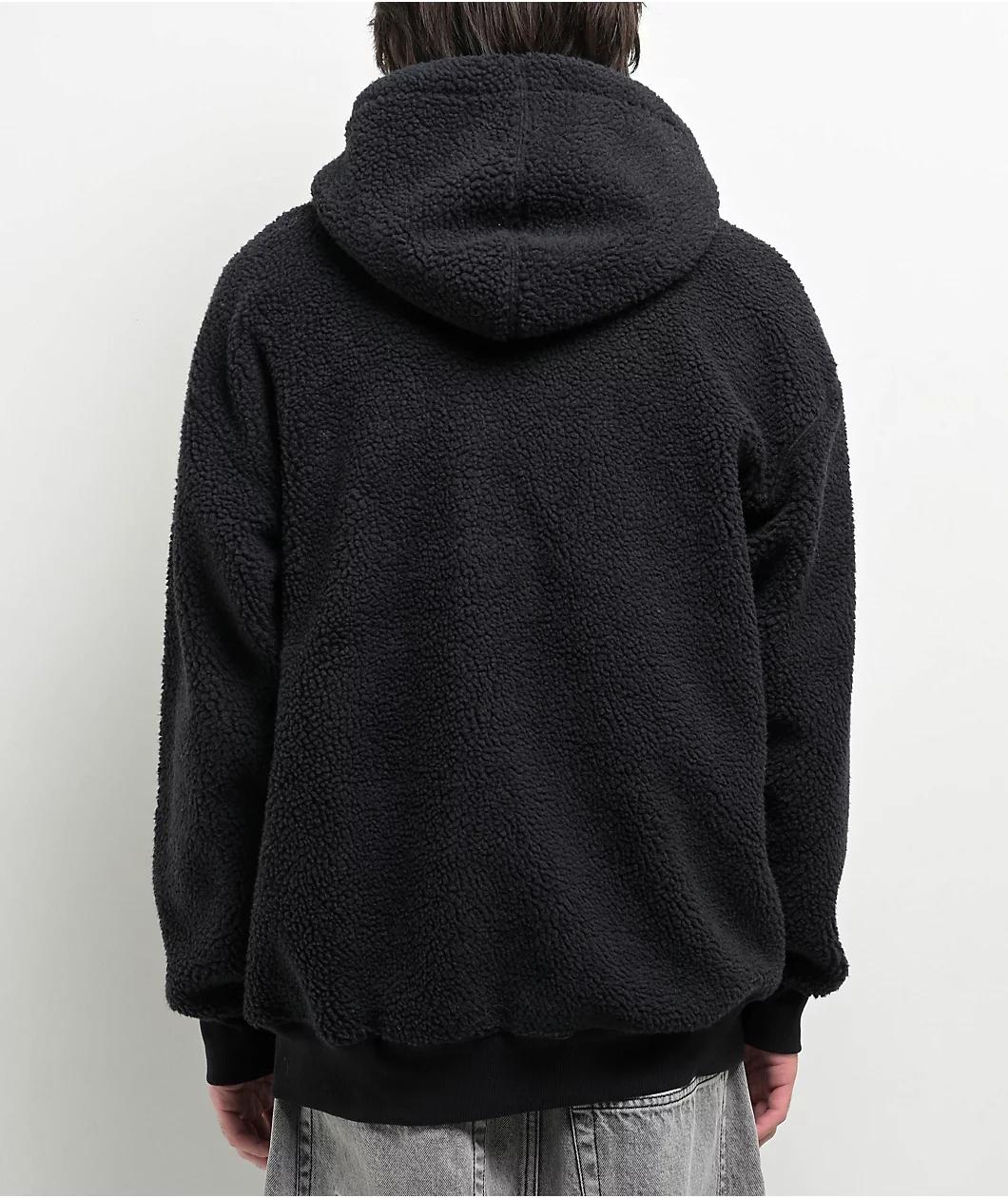 Empyre presents the Sherpa hoodie in a black colorway with grey embroidered branding across the chest in a graffiti bubble letter font. Made with a cozy Sherpa fabric, this sweatshirt is finished with an adjustable drawstring hood, a full zip closure