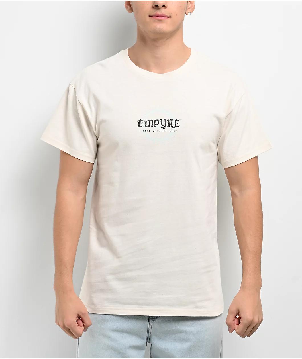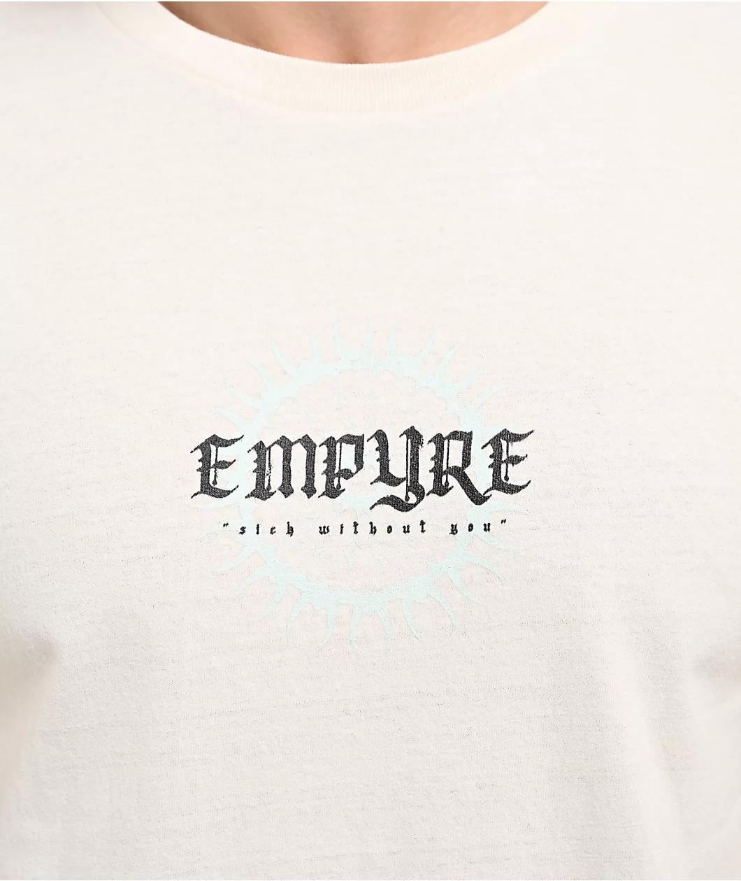 Empyre introduces the Sick Without You t-shirt in a natural off-white colorway. A large back graphic depicts art of a snake, cow skull, and rose alongside Old English text reading "Sick Without You" for a romantic yet alternative vibe. Black and ligh