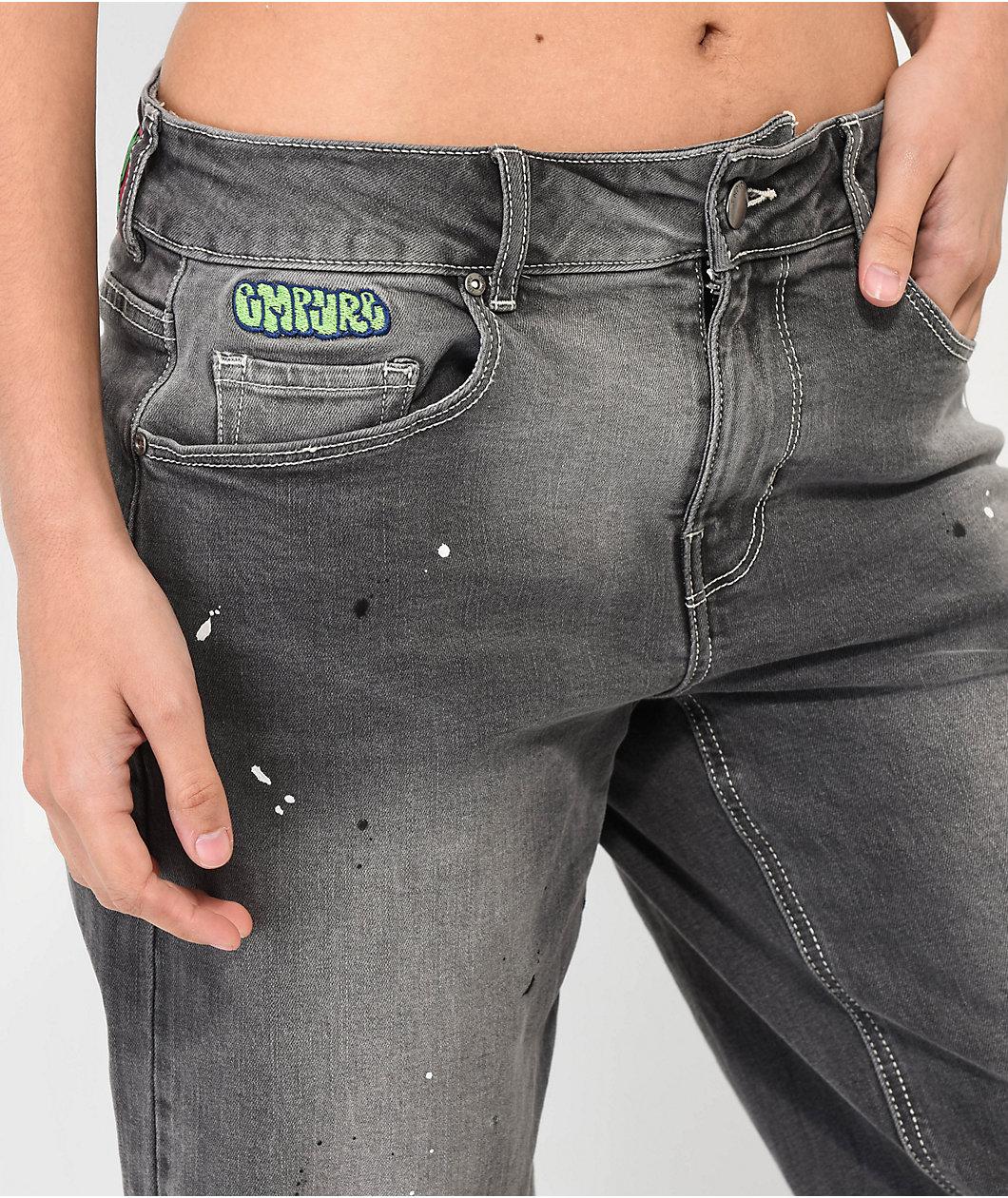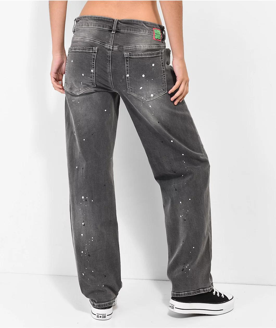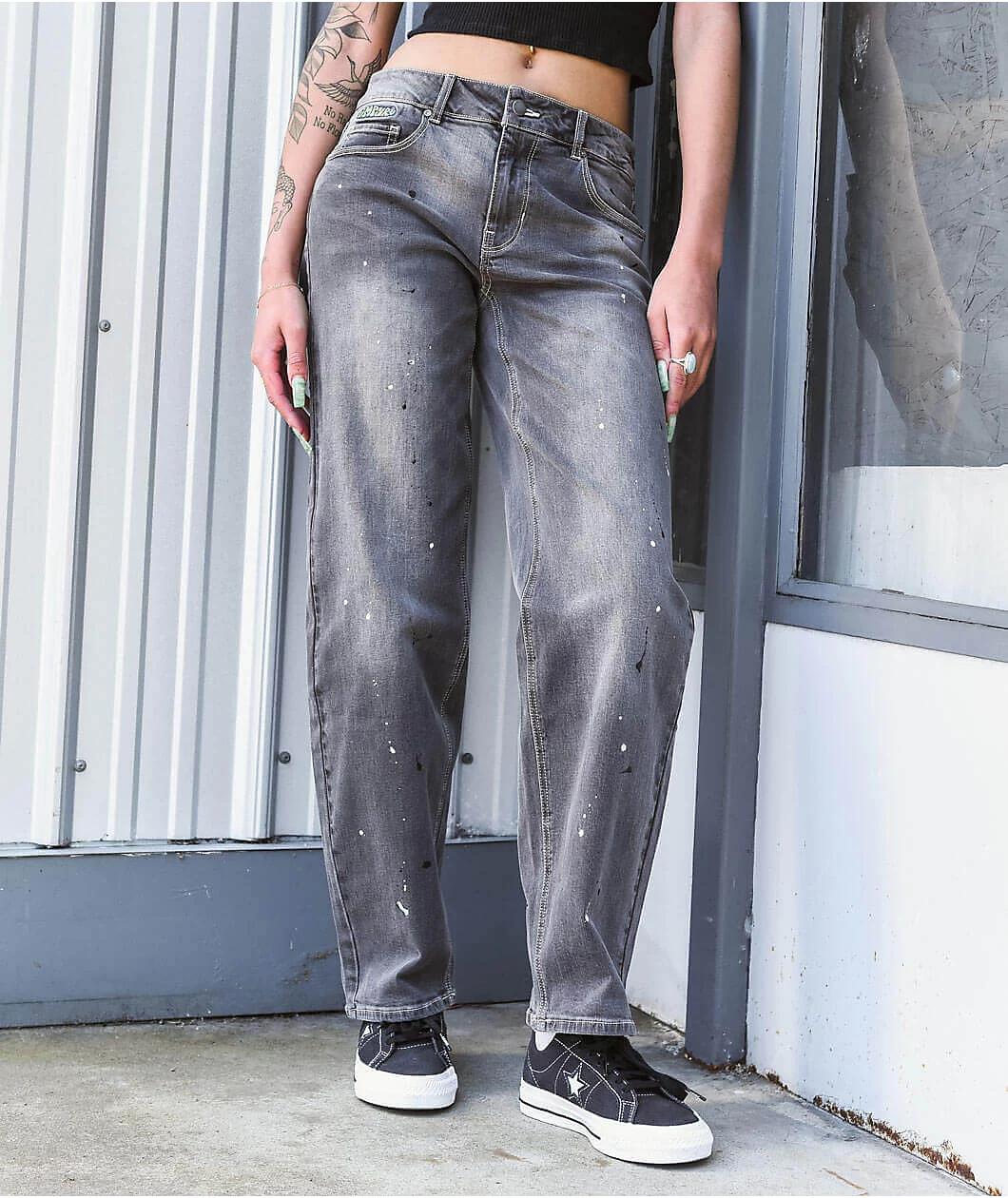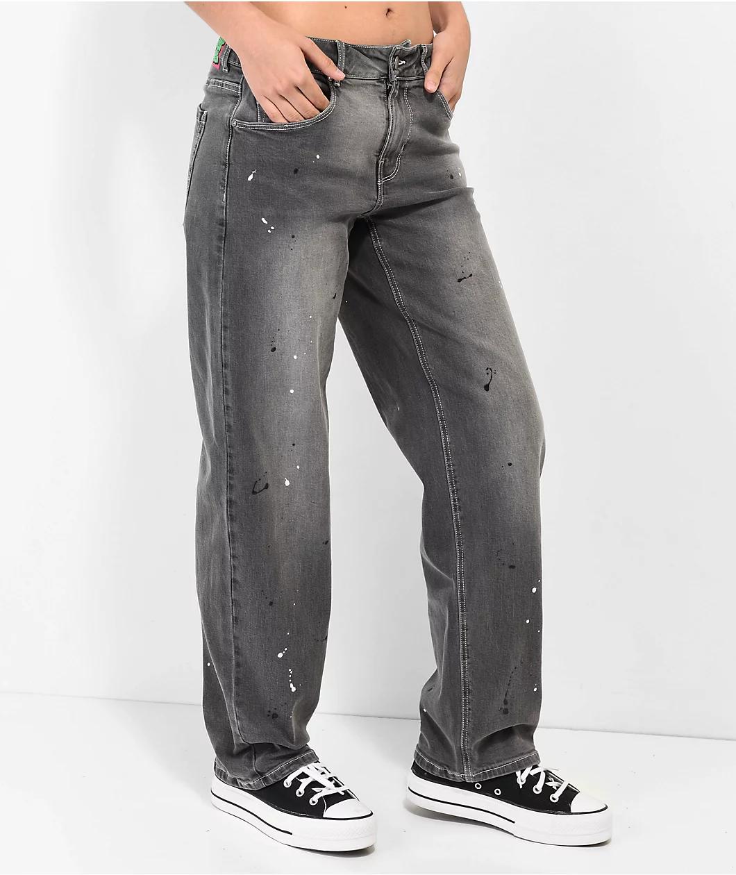 The Tara denim skate jeans from Empyre come in a grey colorway with white and black paint splatter throughout, adding a worn in look to these low rise bottoms. In classic jean fashion, this style features button-and-fly closure with a five pocket configur