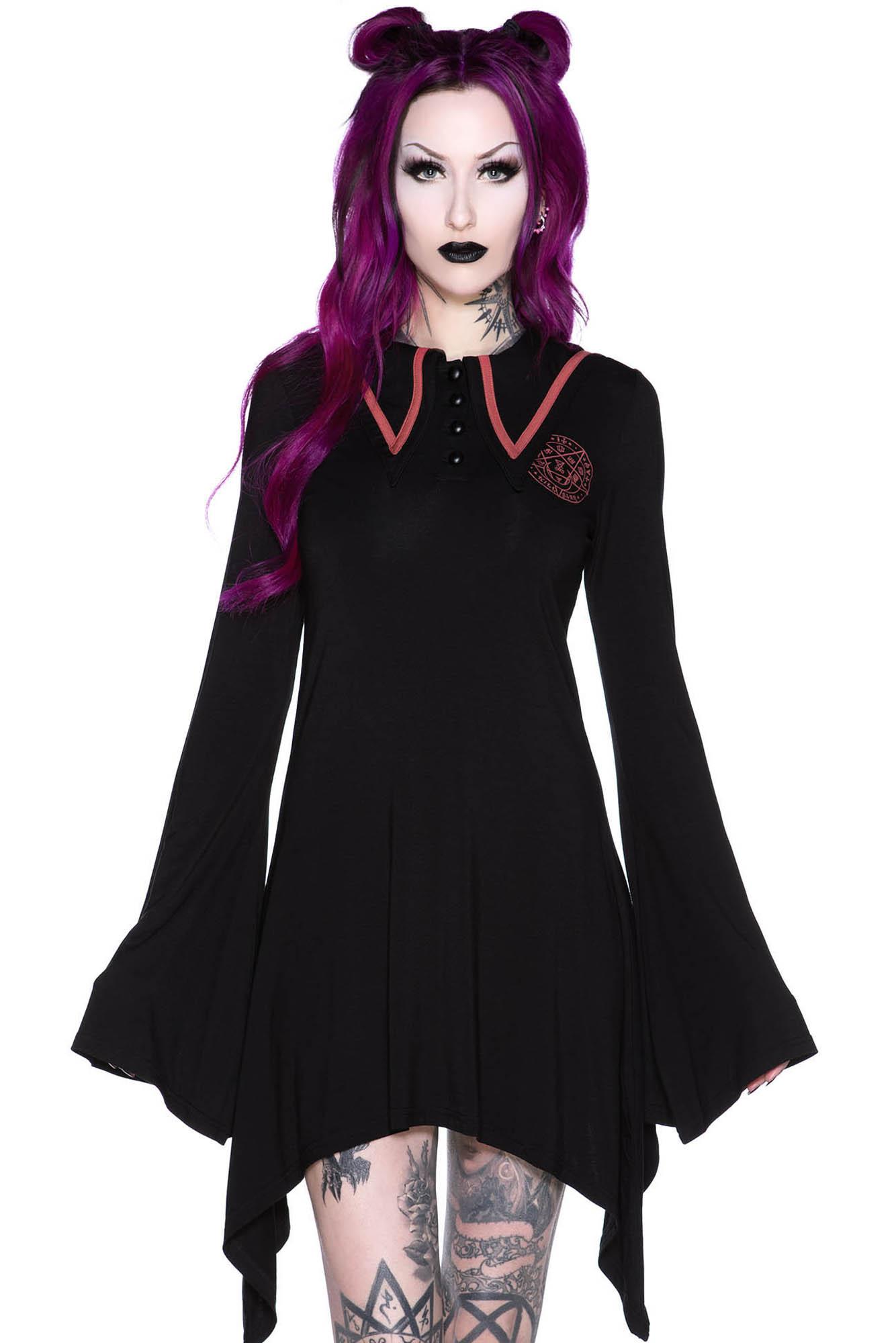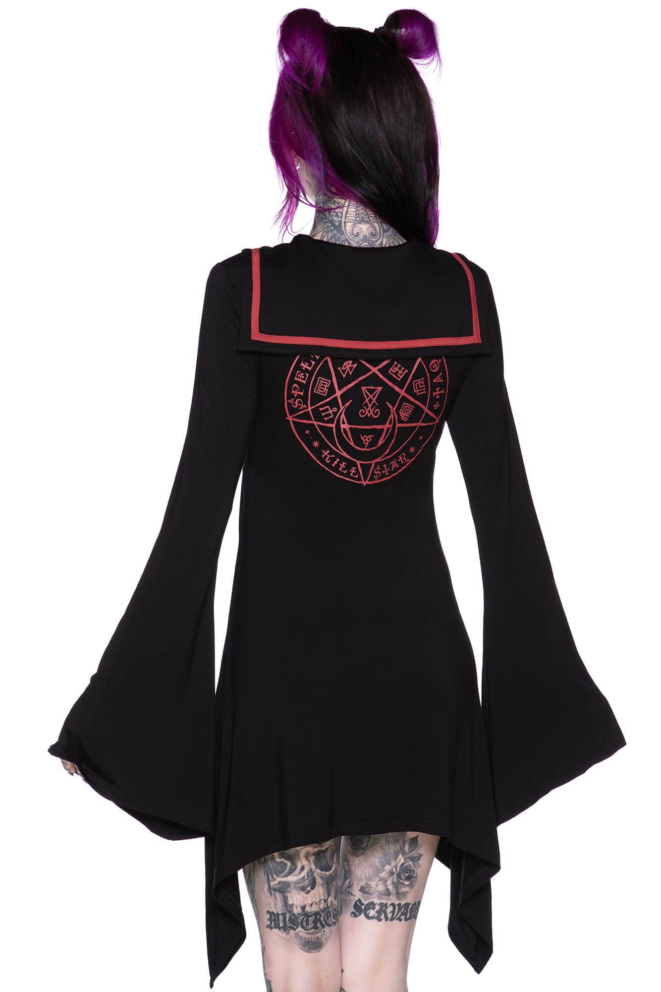EN-CRYPTED. It's a world of freedom and power that few have seen.- Super-soft Jersey.- Sailor Collar.- Button Plaquet. - Contrasting Graphics. - Hanky Hem. - Bell Sleeves.- Relaxed.Never let your fear decide your fate. The 'En-crypted' collar dress in a super-soft stretch jersey - for ultimate comfort and fit. Features a sailor collar, button plaquet, contrasting graphics, hanky hem and dramatic bell sleeves. This statement piece is a dream to style - perfect for days out with yer fav hacktivists or night decoding the dark web!Looks great with an oh-so-big witch brim and statement boots! Complete yer look perfectly with a spiky statement handbag!Wash Cold - Gentle Cycle.With KILLSTAR branding, 95% Rayon, 5% Elastane.
