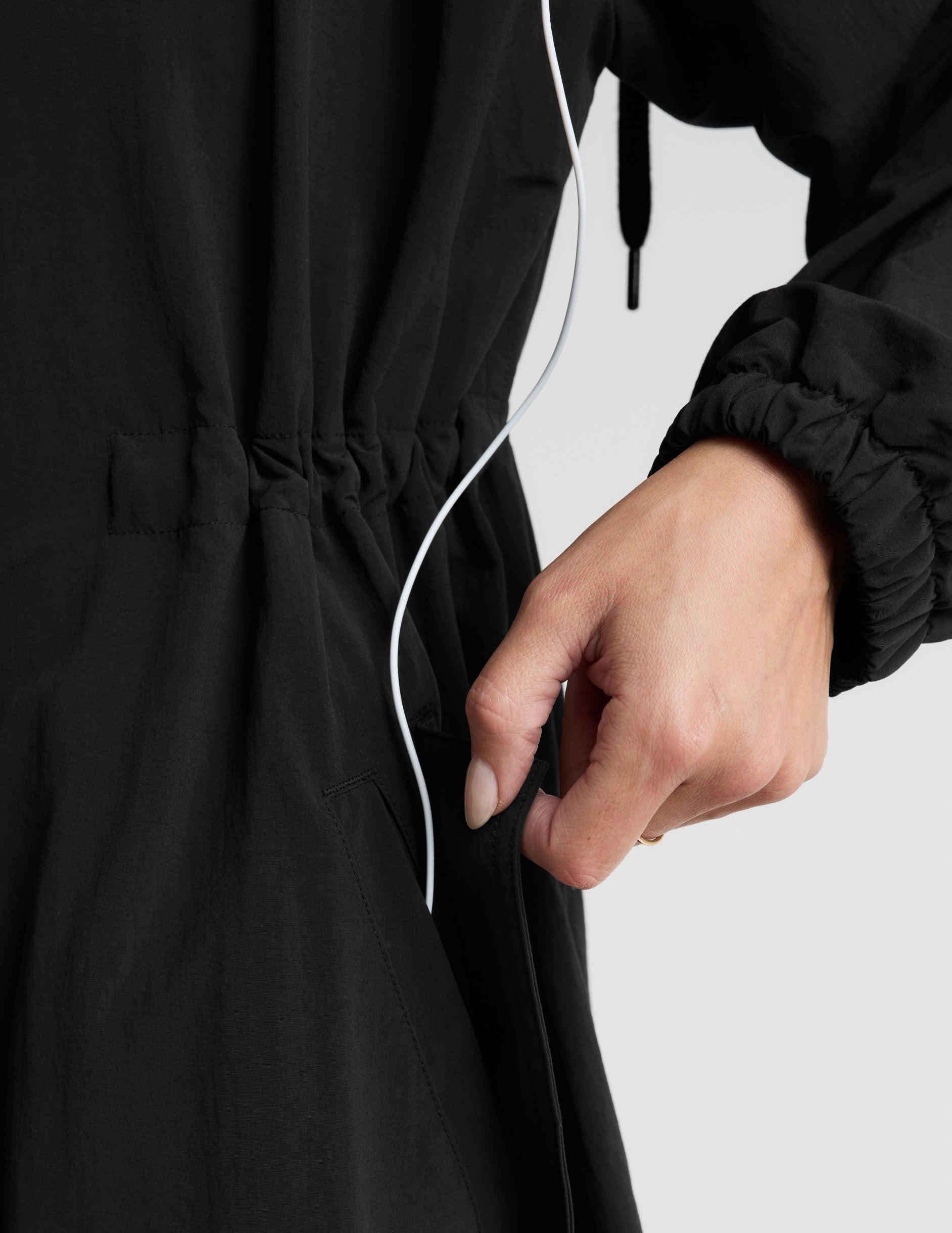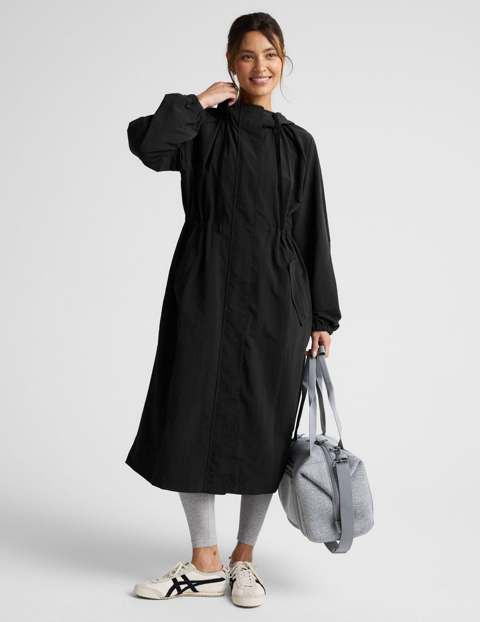 You're on your way. The En Route Long Jacket is a chic outer layer with an adjustable bungee cord at your waist for your perfect fit from the studio to the office, and everywhere in between. Two-way front zipper Neckline shirring detail Dual entry hand pockets Adjustable drawcord at hood Loose fit Long length