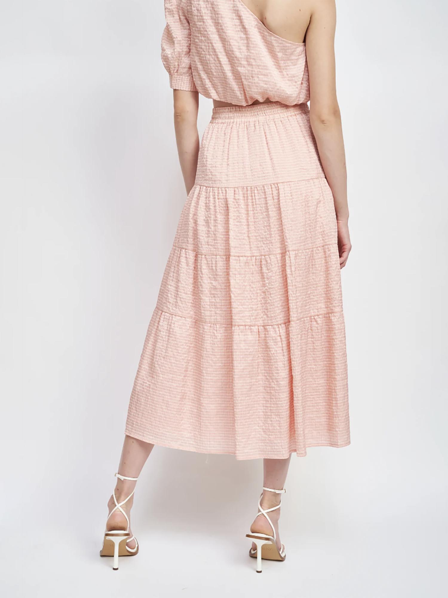 •LOOK: NEW at Pink Orchid!! What a lovely skirt this is from En Saison . It’s a midi tiered skirt in a soft peach color with white micro limes making it a softly plaid skirt. The fabric is a dressy shimmery material. Can be dressed up with a pretty white blouse or dress it down with a white tee with puffed sleeves.