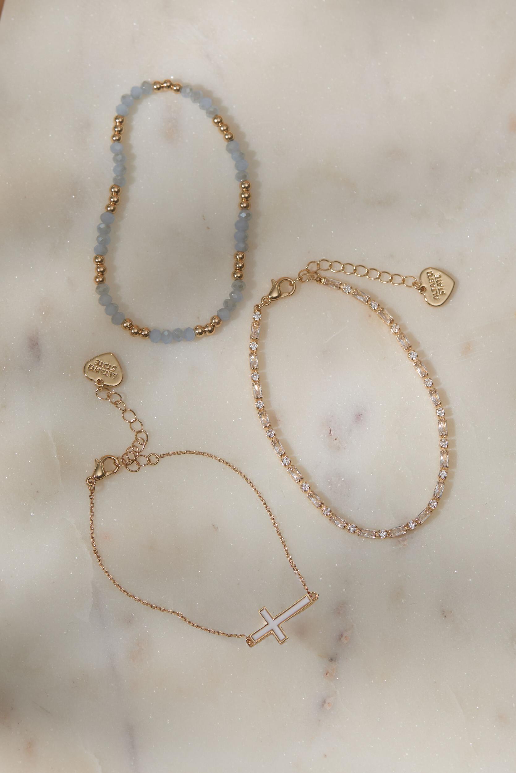 Water Resistant Set of 4 Gold and Pearl Textured Beaded and White Crosses Stretch Bracelets