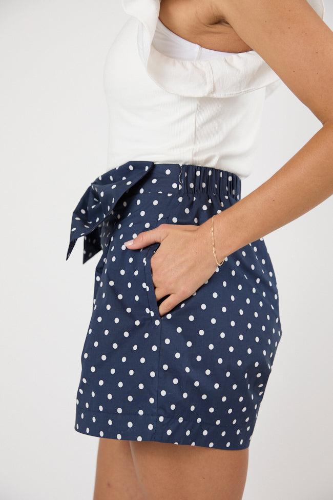 Details Polka Dot Bow Shorts Navy Fabric has no stretch besides in elastic Elastic waistband, back zipper closure, functional pockets, front bow detail Lined Size small inseam: 3.5" Material and Care Self: 100% cotton lining: 100% polyester Hand wash cold, line dry Patterns may vary Materials may have natural variations Colors may vary from different viewing devices.