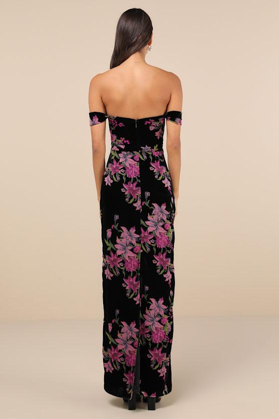 Cast a spell on the crowd when you make an entrance in the Lulus Enchanting You Black Burnout Velvet Off-the-Shoulder Maxi Dress! Plush velvet, with a romantic floral burnout design throughout, shapes a notched, off-the-shoulder neckline (with hidden no-slip strips and an internal V-bar) and a seamed bodice framed by wide straps. High, fitted waist tops figure-skimming column skirt with a maxi hem and a kick pleat at the back. Hidden back zipper/clasp.