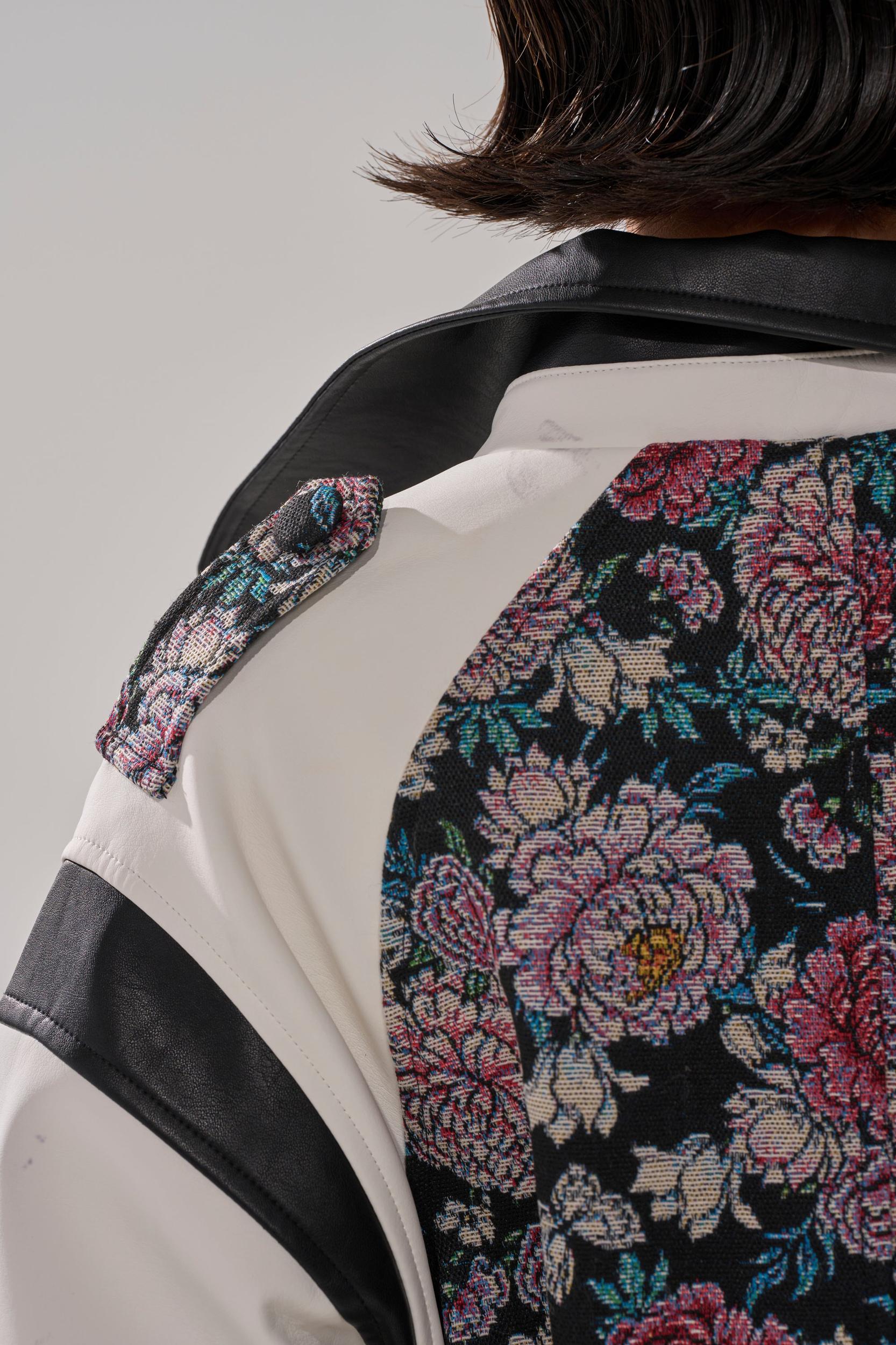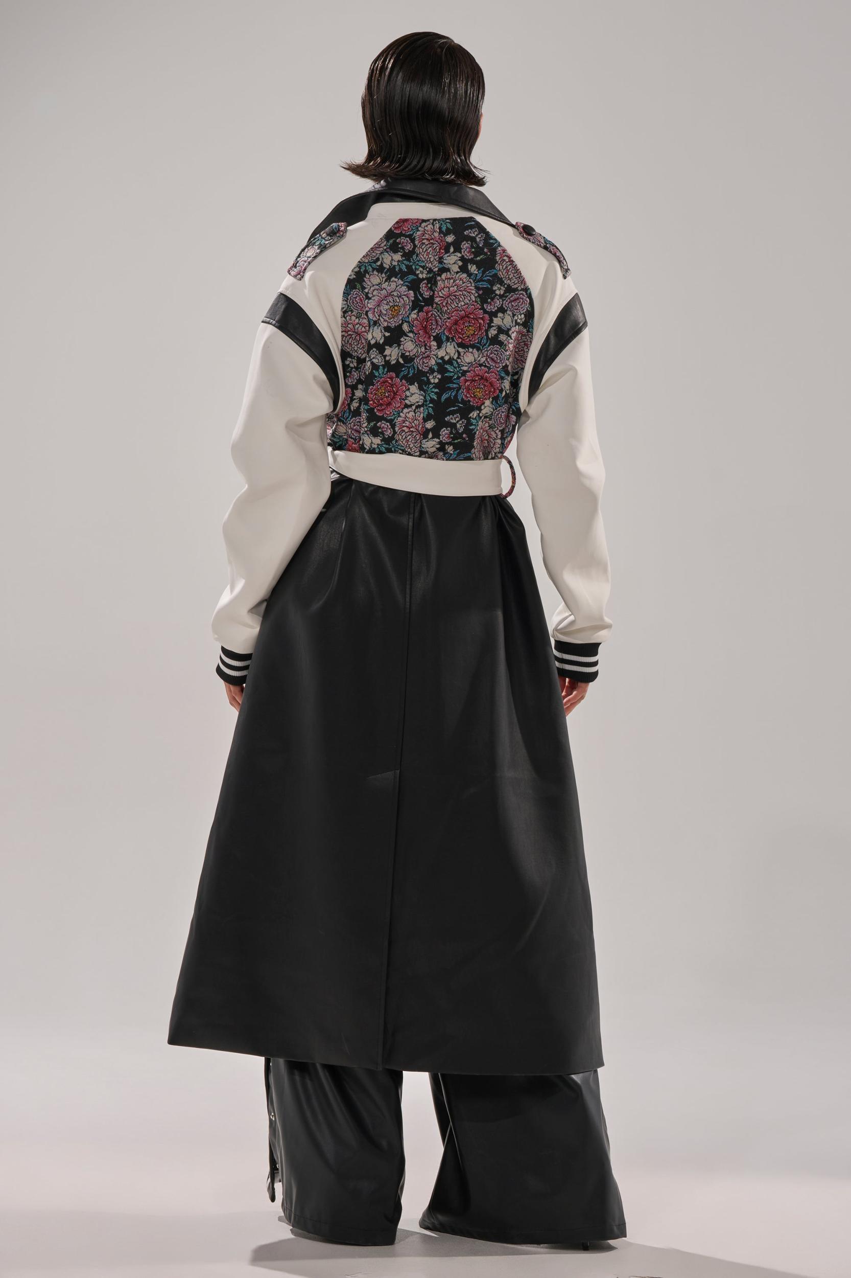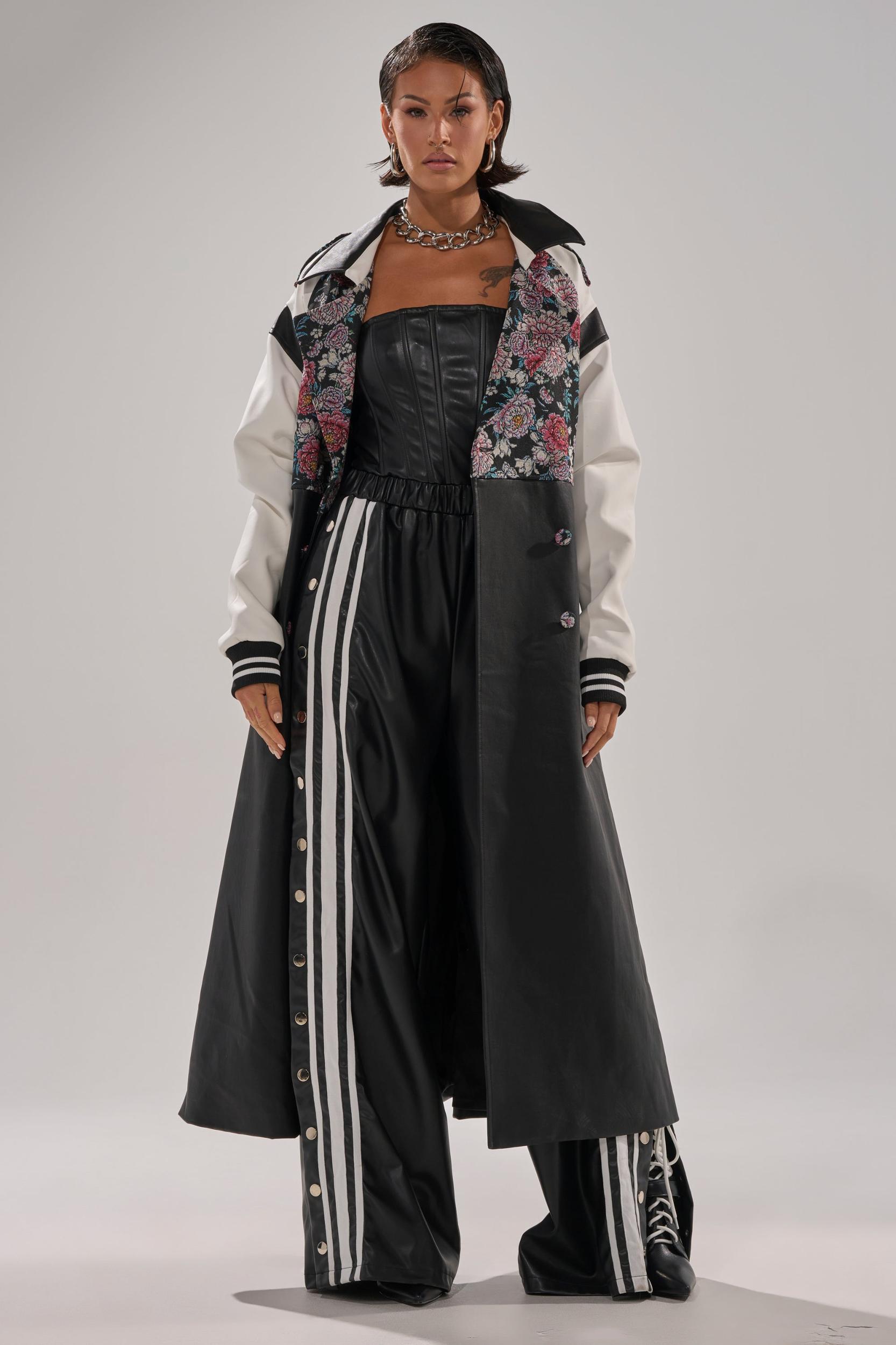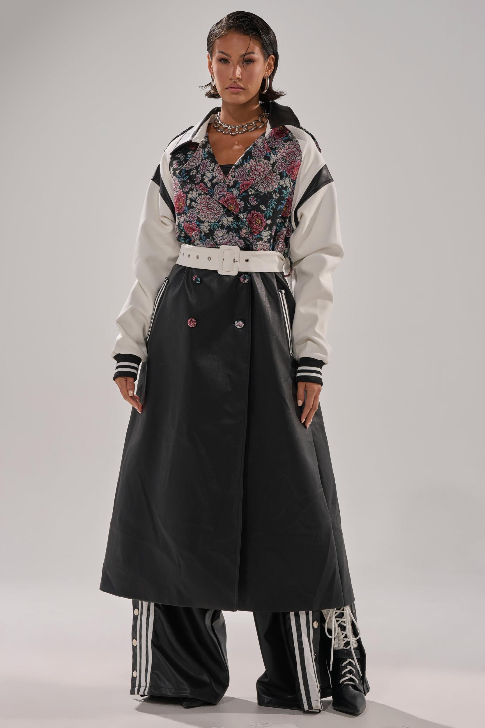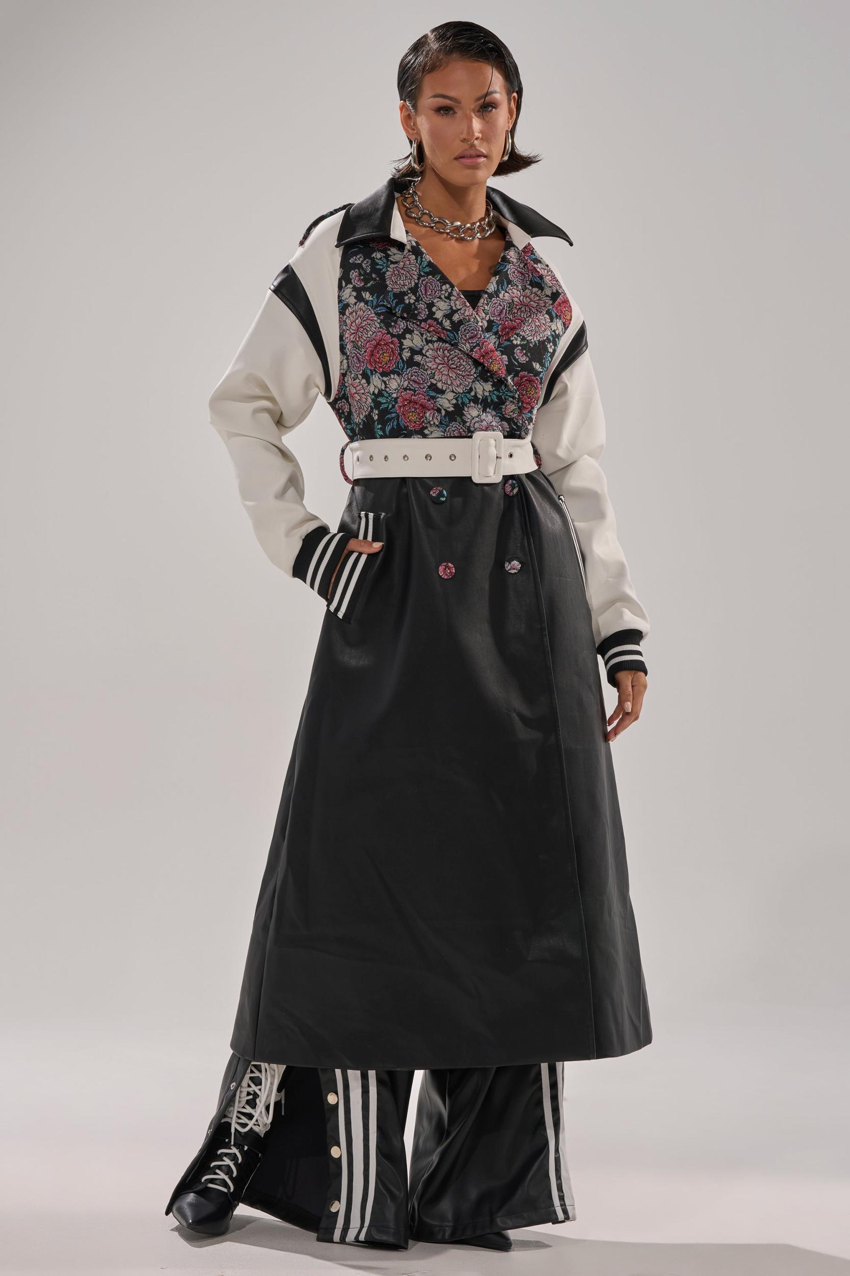 The AKIRA Label End Game Mixed Media Trench blends sporty edge with elevated sophistication. Designed with a floral jacquard bodice, faux leather skirt, and varsity-inspired striped cuffs, this coat delivers a statement-making contrast of textures. The piece features faux leather shoulder accents, floral-covered buttons, a wide belt to define the waist, and structured epaulets for a tailored touch. Finished with side slit pockets and a sleek, full-length silhouette, it’s a bold reimagining of the classic trench. (all measurements approximate from size small)- 51” Shoulder to Hem- 18.5” Shoulder to Shoulder- 24” Sleeves- Model is 5’7” and wearing a size smallProduct ID: 1074913
