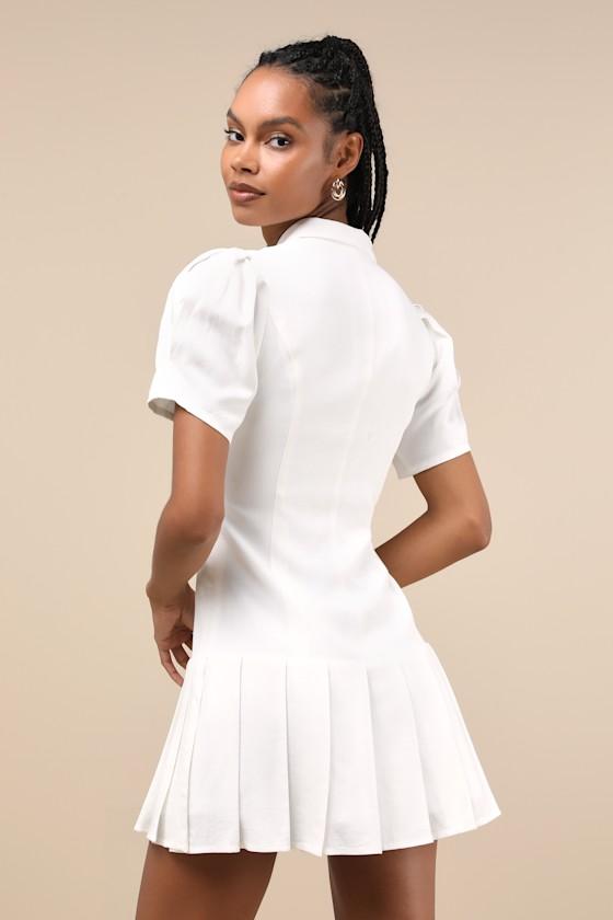 A top-tier cutie like you needs the Lulus Endearing Attitude Ivory Collared Pleated Drop Waist Mini Dress! Lightweight, cotton-linen blend woven fabric shapes this chic dress with a notched collared neckline and short sleeves with puff shoulders. Princess-seamed bodice boasts a functional button placket that continues through the waist, until it meets a pleated, drop waist-style mini hem. Decorative twin welt pockets at the front complete the look. Hidden side zipper.