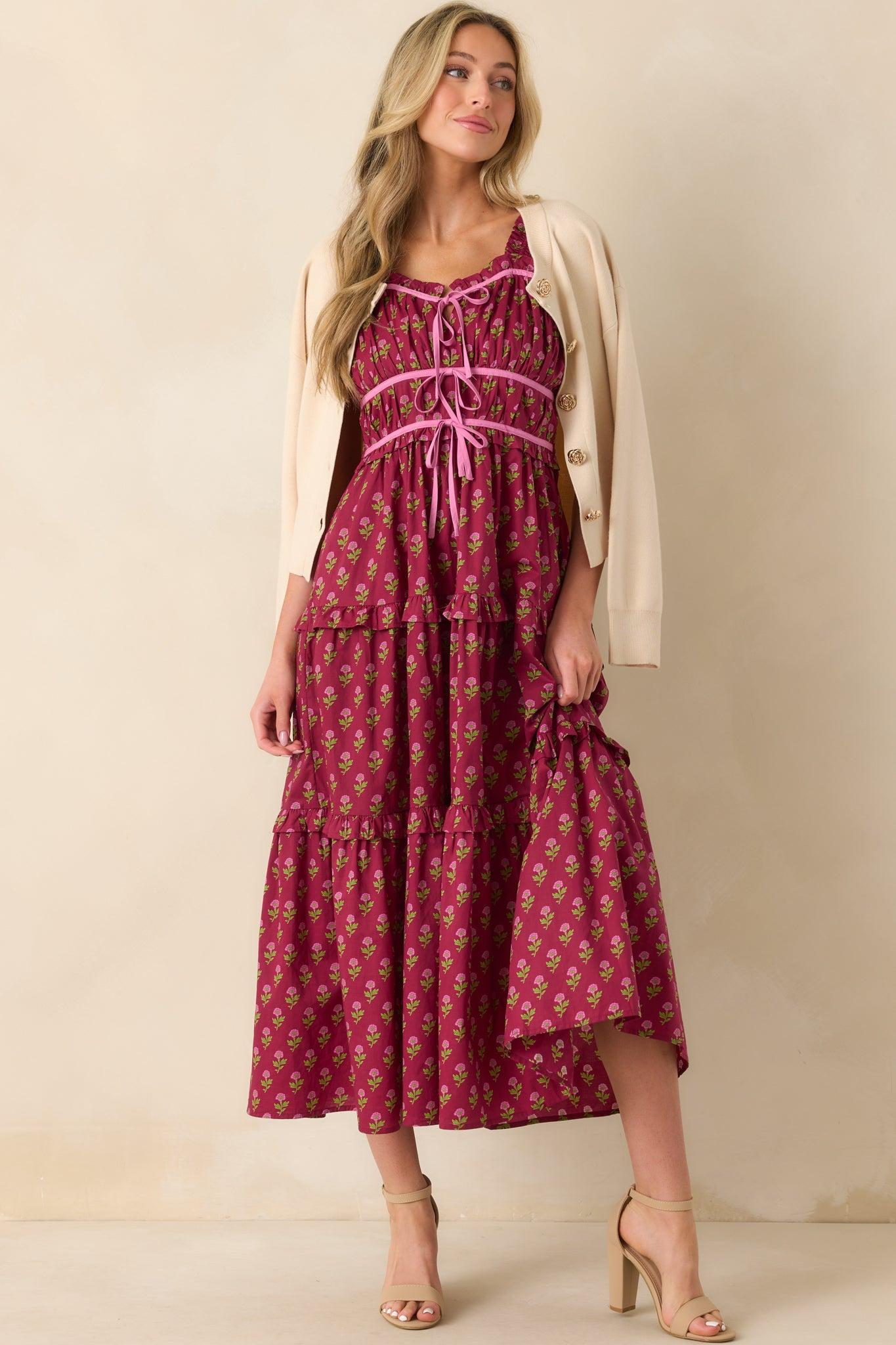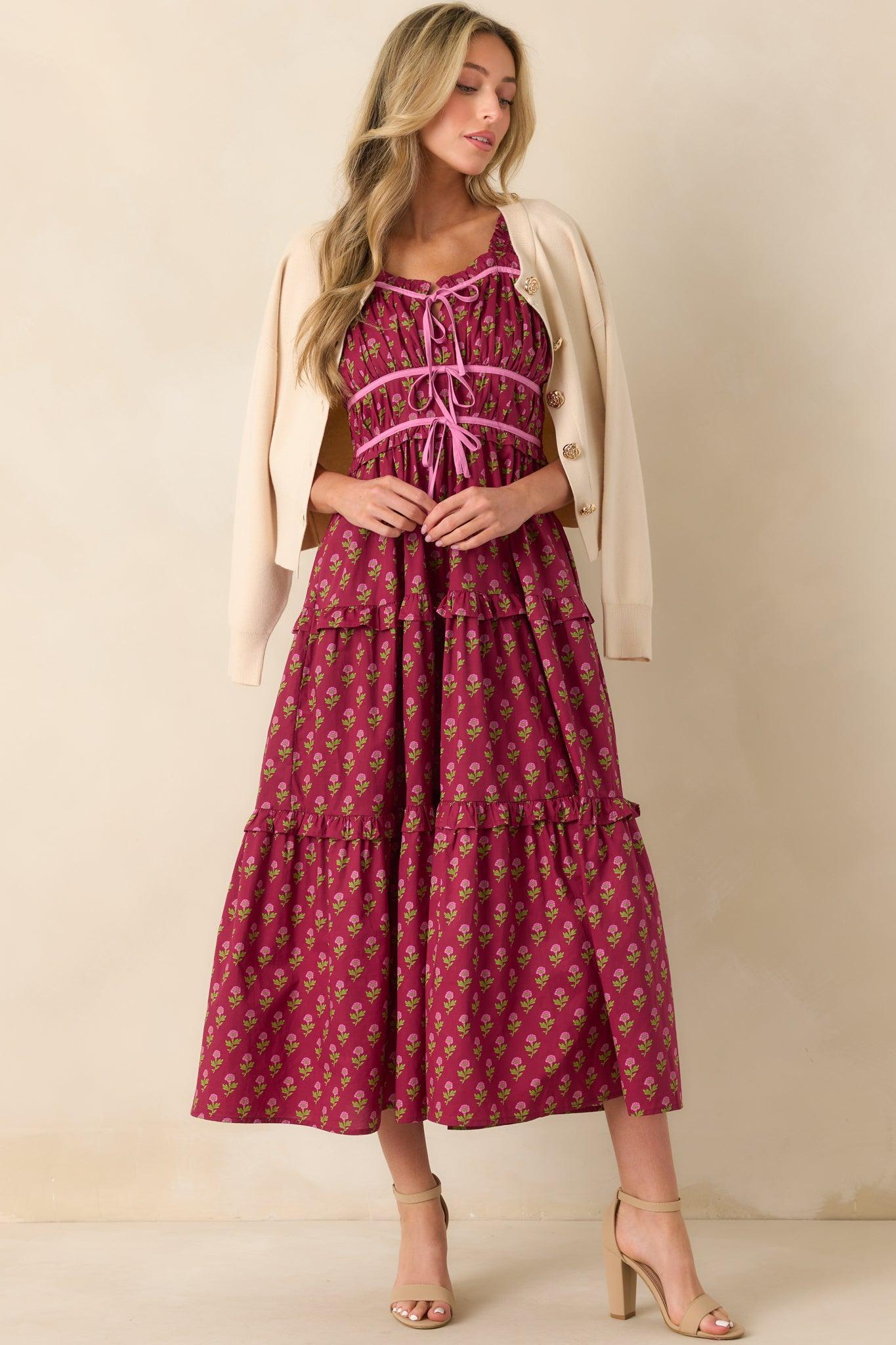 The Endless Compliments Burgundy Floral Print Cotton Maxi Dress lives up to its name without even trying. It’s one of those pieces that turns heads, sparks conversations, and leaves you feeling completely put together. This burgundy maxi dress features a pink multicolor floral print, smocked elastic wide straps, sweetheart neckline, ruffle trim details, ruched bust fabric, elastic back inserts, pink trim details, and functional pockets.