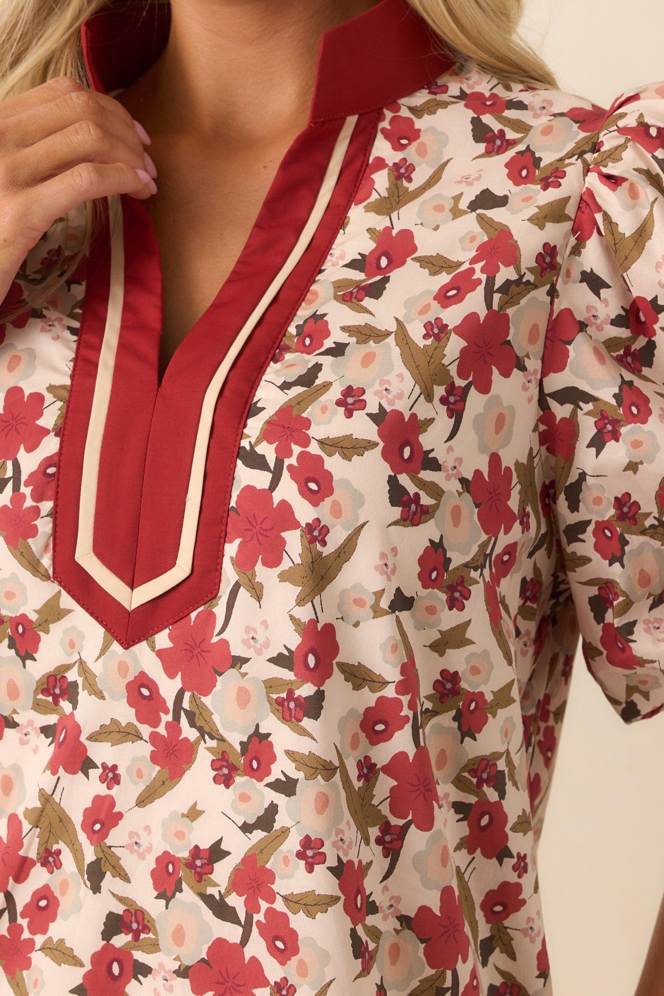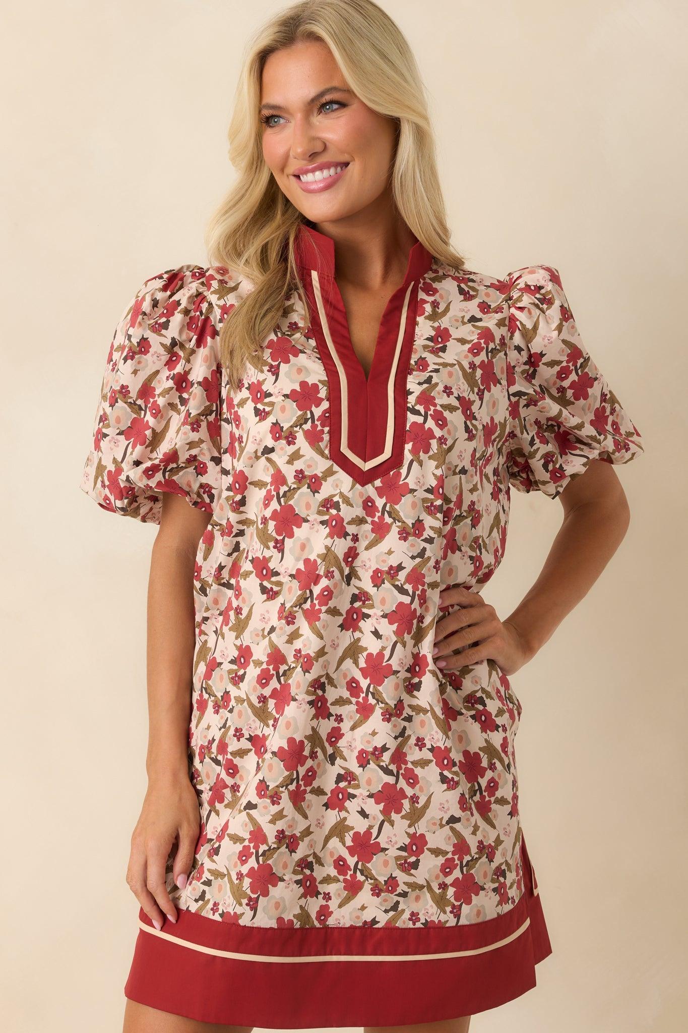 Embrace effortless elegance with the Endless Daydreaming Dark Rust Floral Cotton Puff Sleeve Mini Dress. Crafted from soft cotton, this dress features charming puff sleeves and a flattering mini length, perfect for warm days and casual outings. The rich dark rust floral pattern adds a touch of vintage-inspired beauty, making it a versatile piece for your wardrobe. Whether you're strolling through the city or enjoying a weekend brunch, this dress combines comfort and style to keep you looking effortlessly chic. This dark rust dress features a floral print throughout, solid rust trim, a notch v-neckline, beige trim details, puff sleeves, and two functional side pockets.