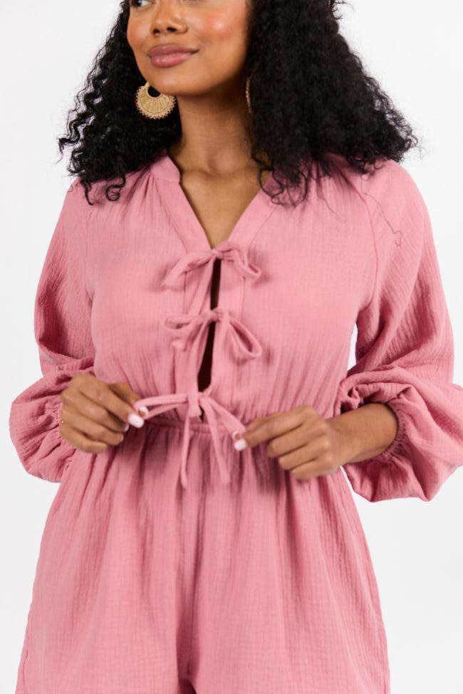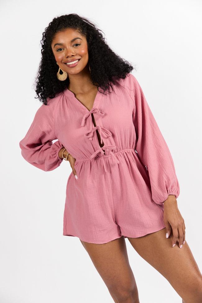 Details Pink Tie Front Long Sleeve Romper Fabric has no stretch besides in the elastic waistband Crew neckline, bow tie up closure, elastic waistband, long bishop sleeves Unlined Size small inseam: 2.5" Material and Care 100% cotton Machine wash cold, no drum drying Patterns may vary Materials may have natural variations Colors may vary from different viewing devices.