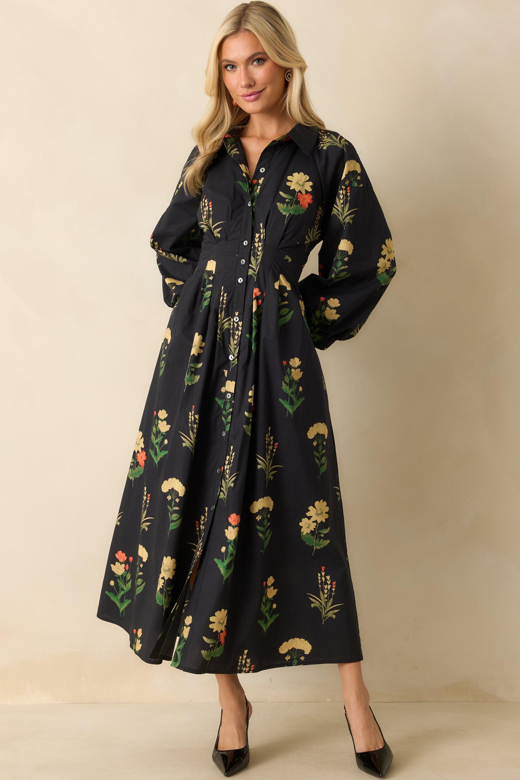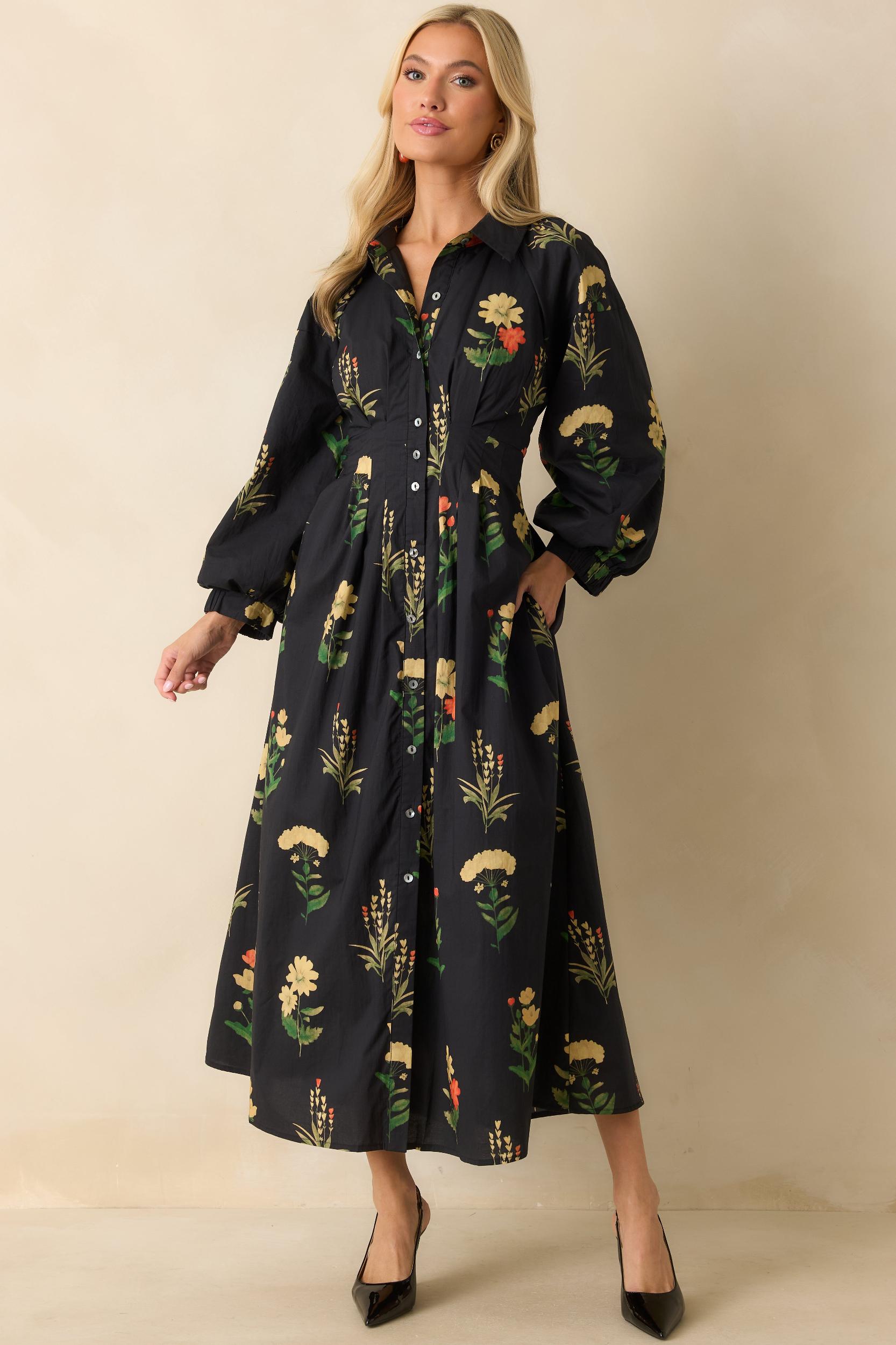 The Endlessly Charmed Black Multi Floral Print Cotton Button Front Maxi Dress brings an air of timeless charm to your day. With its flowing silhouette, romantic floral print, and softly structured shape, this piece feels as effortless as it is refined - perfect for moments that call for something beautifully put together. This black woven dress features a collared neckline, button-front closure, long bishop sleeves with buttoned cuffs, a pleated waist for shape, side pockets, and an allover floral print. 100% Cotton Lined: 100% Polyester Hand Wash Cold Manufactured in China Designed in The USA Model is 5'8" and Wearing a Size Small, Clipped, Model is a True X-Small