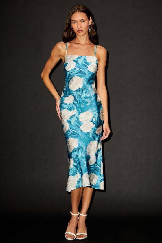 Throw on your heels and head to the party looking perfect in the Lulus Endlessly Effortless Blue Floral Abstract Satin Slip Midi Dress! Lightweight woven satin, with an abstract floral print throughout, shapes adjustable spaghetti straps and a sleek bodice with a subtle cowl neckline and bust darts. Slip-style silhouette continues with a fitted waist and a lightly flaring skirt that finishes at a midi hem. Hidden zipper/clasp at side.