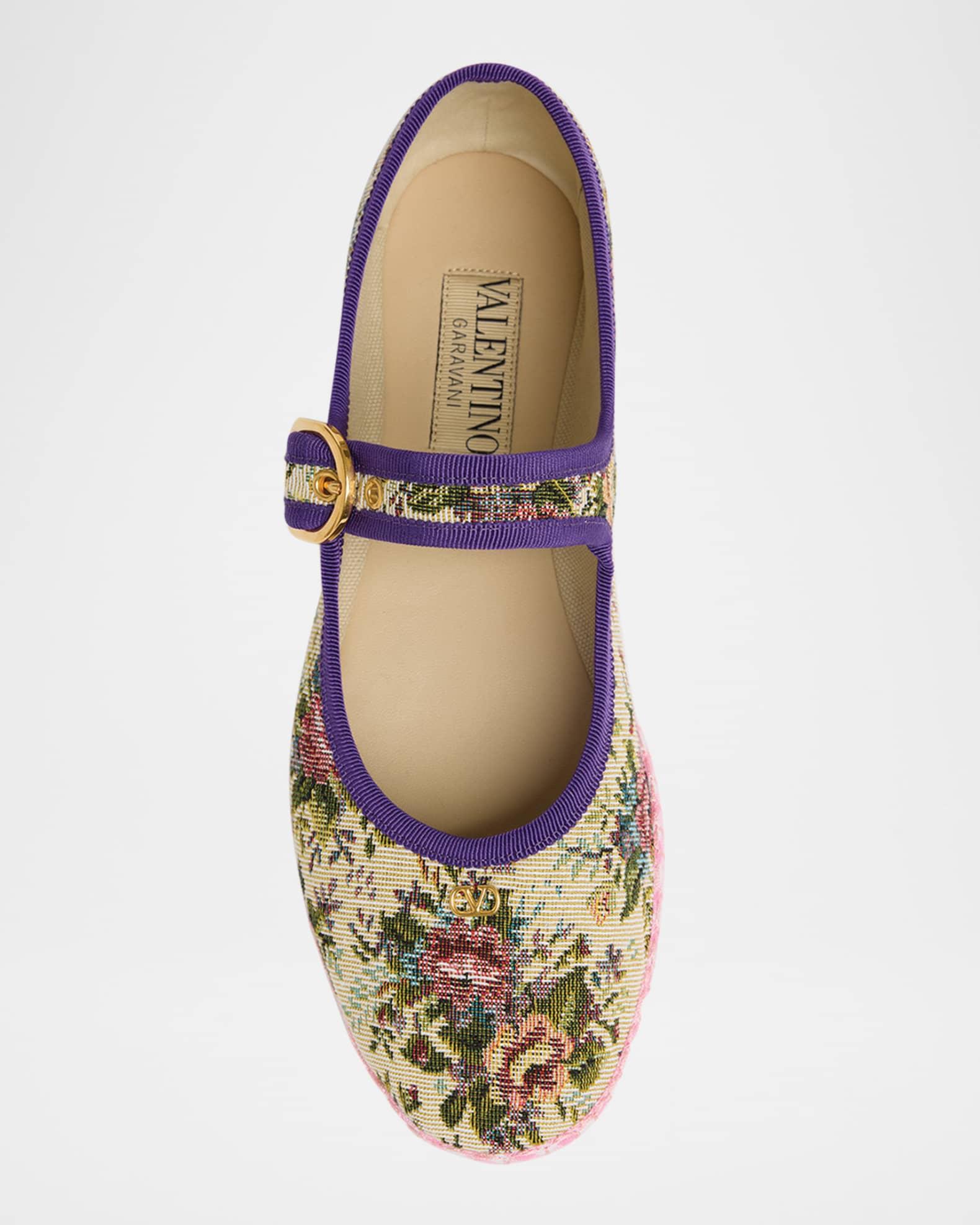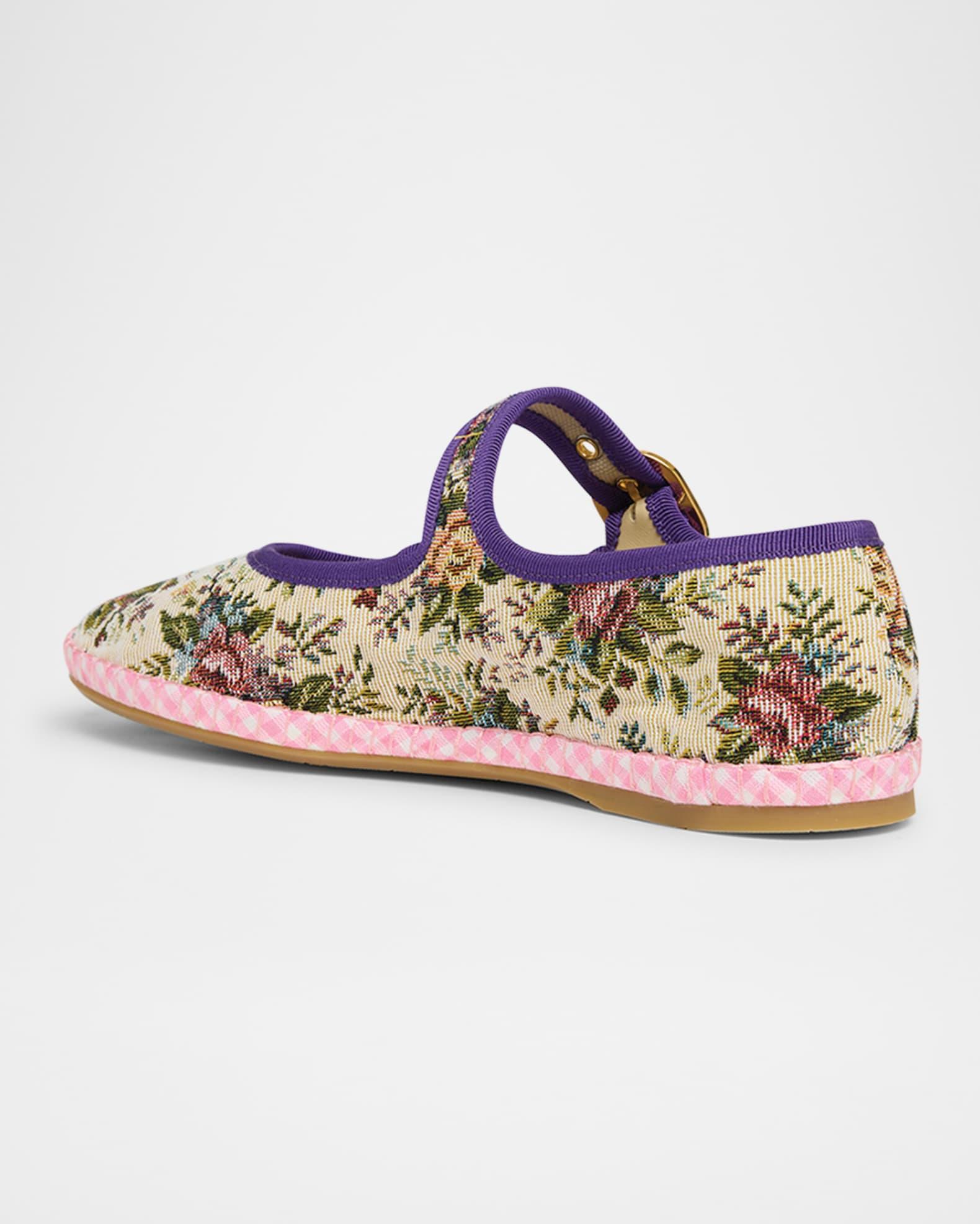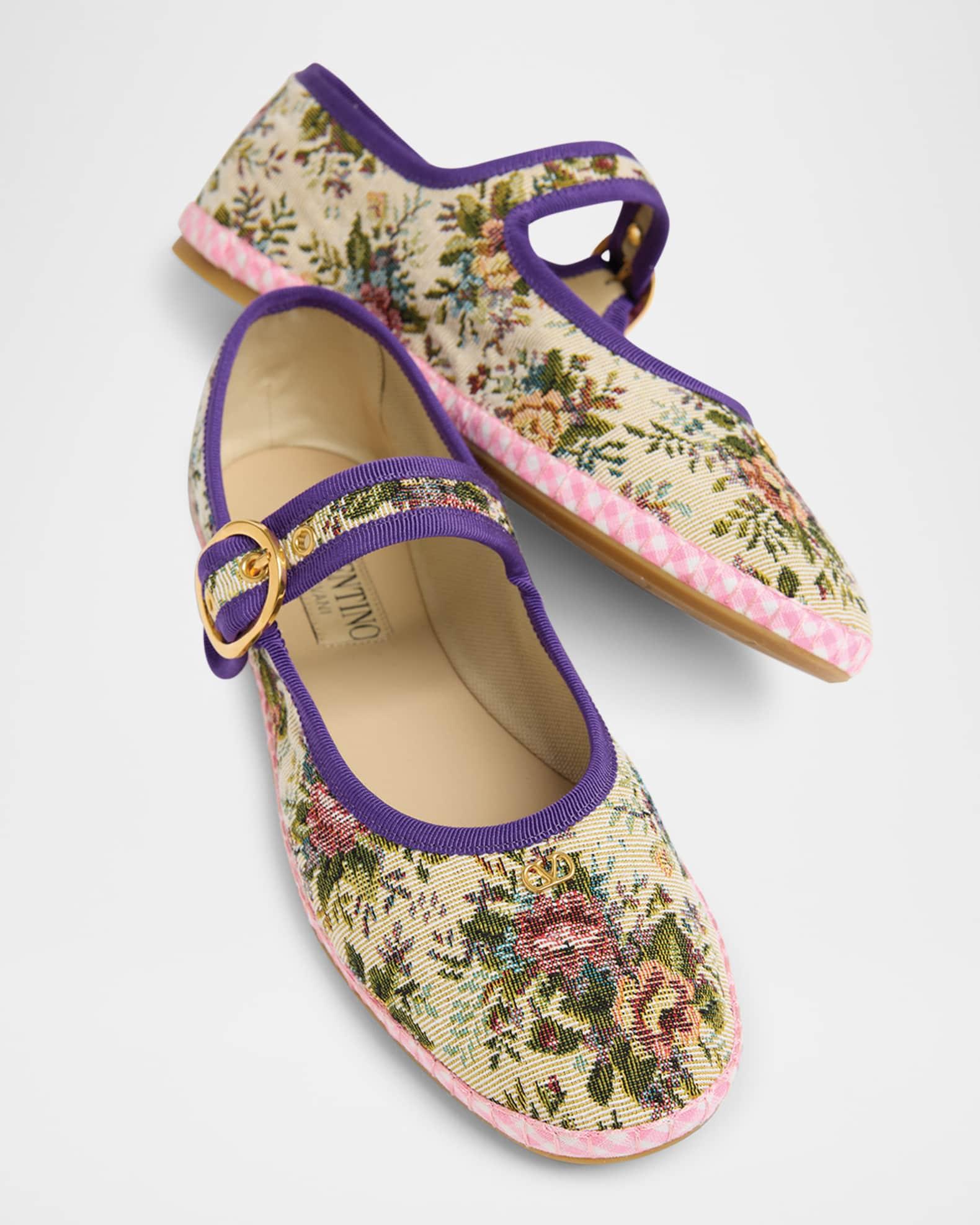 Valentino Garavani "Endouce" ballet flats in brocade floral fabric (cotton/viscose) 0.17 in / 5 mm flat heel Round toe Adjustable buckle strap mid-vamp Slip-on style Contrast plaid mid-sole Leather outsole Lining: Leather Made in Italy Size Note: Valentino Garavani shoes run small. Please order a 1/2 size larger than you typically wear.