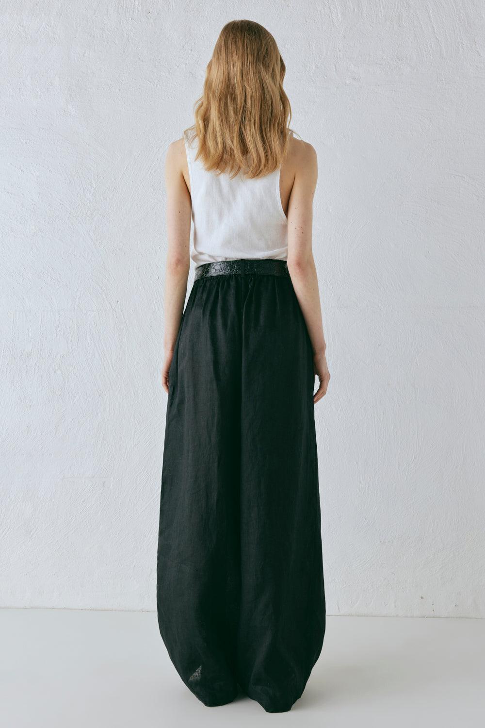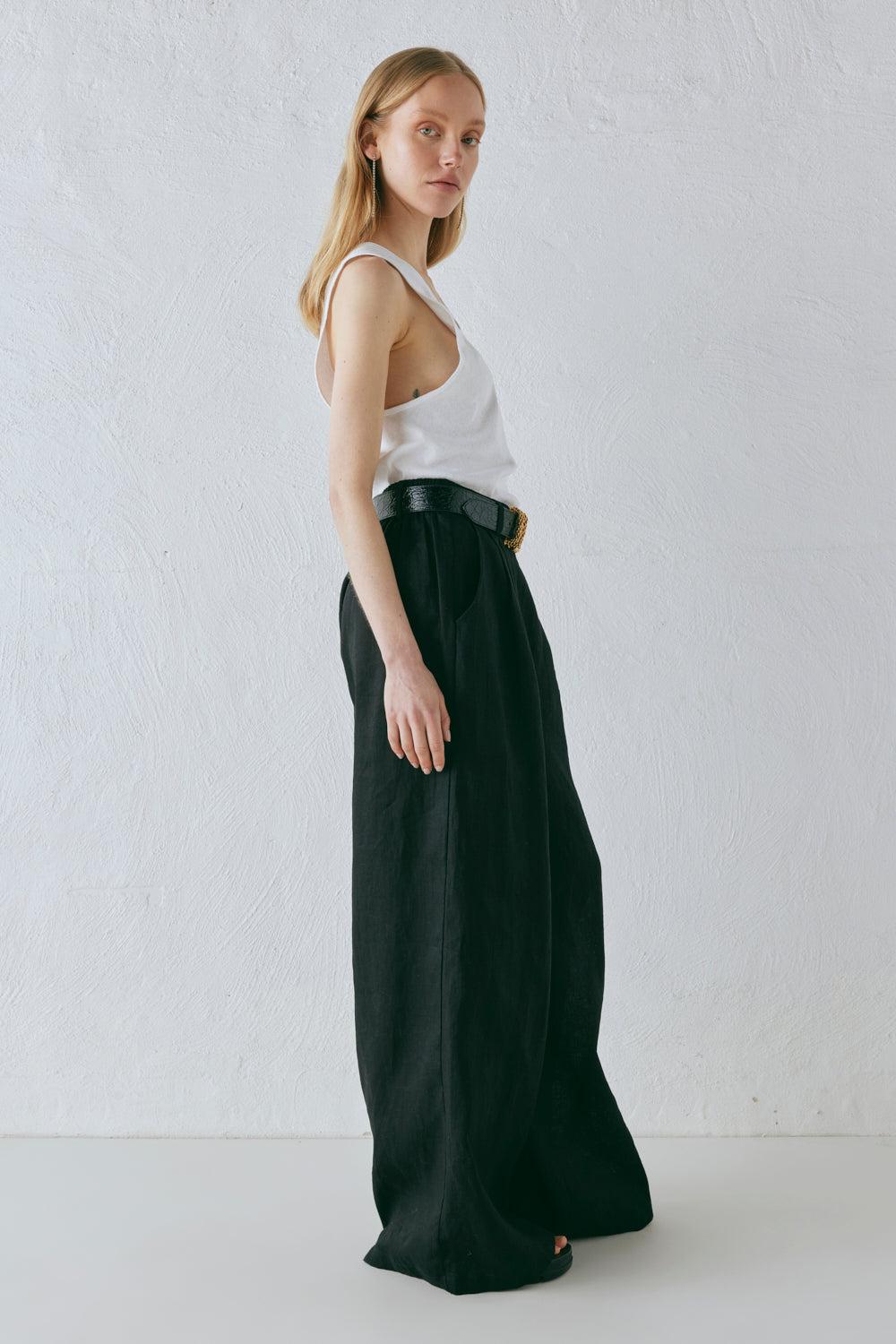 Details 100% Linen Belt loops Side pockets Front pleats Elastic back waist Inner leg length 77cm / 31in (taken from a size AU 8, measured flat) Please note belt is not included Cold Hand Wash / Cool Iron On Reverse Designed in Australia Size & Fit Jeske is 173cm / 5ft 8in - wearing size AU 8 View our size guide for more information