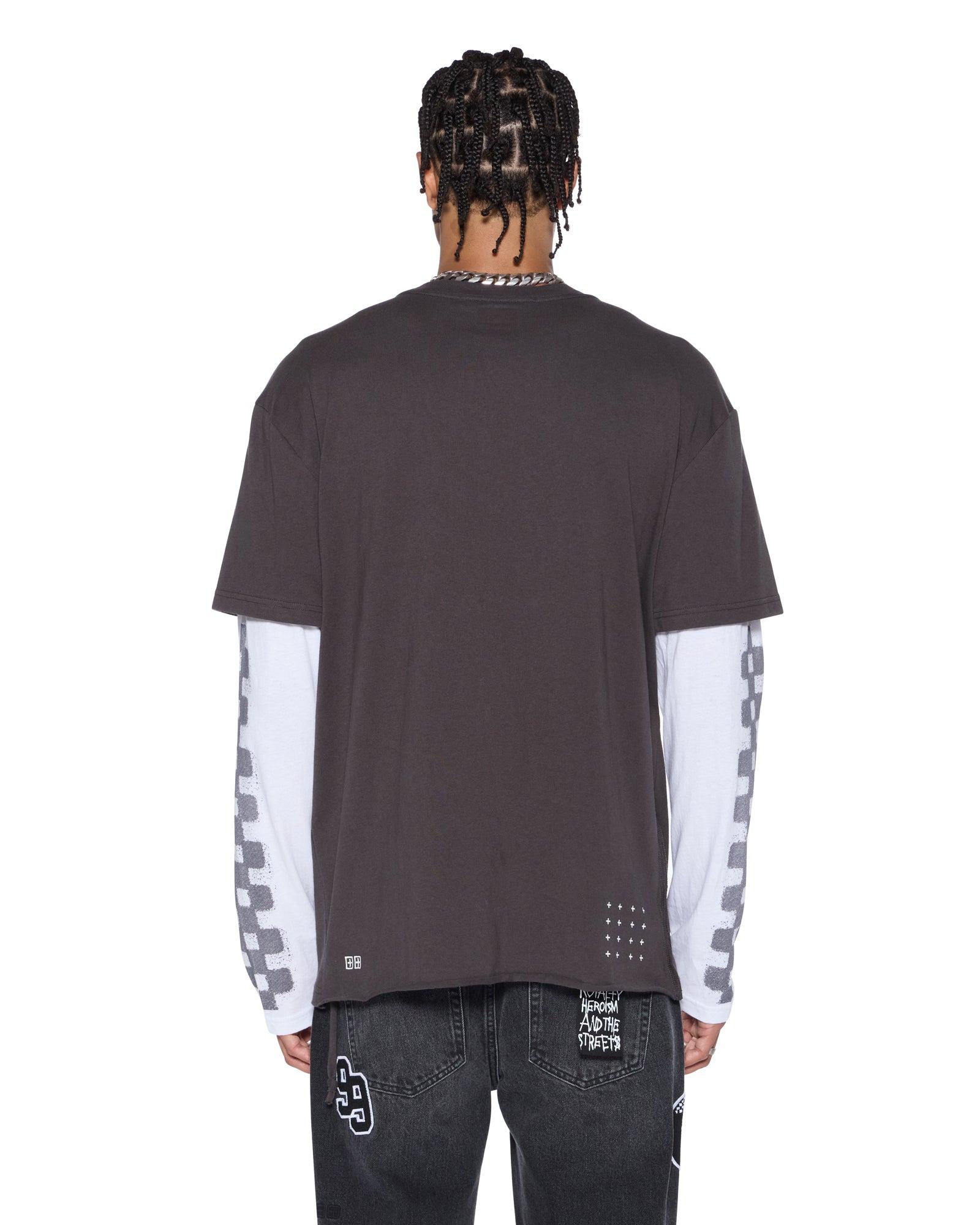 The Engine LS Layer Tee Faded Black is a boxy, oversized double-layered t-shirt with a crew neckline, reverse overlocked side seam, signature rats tail, and a cuffless long sleeve underlayer. Cut from cotton jersey in an overdyed faded black with an aged wash, it features seasonal screen-printed artwork on the front and sleeves, finished with signature T-box and 4x4 embroidery branding.