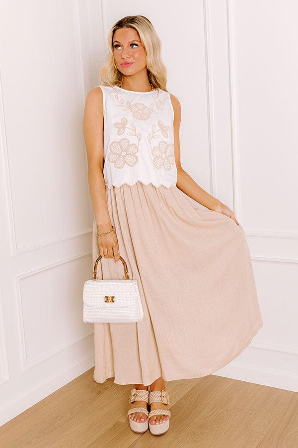 - A soft, white bodice overlay that is stitched on at the shoulders featuring iced latte colored floral embroidery on the front and along a scalloped hem