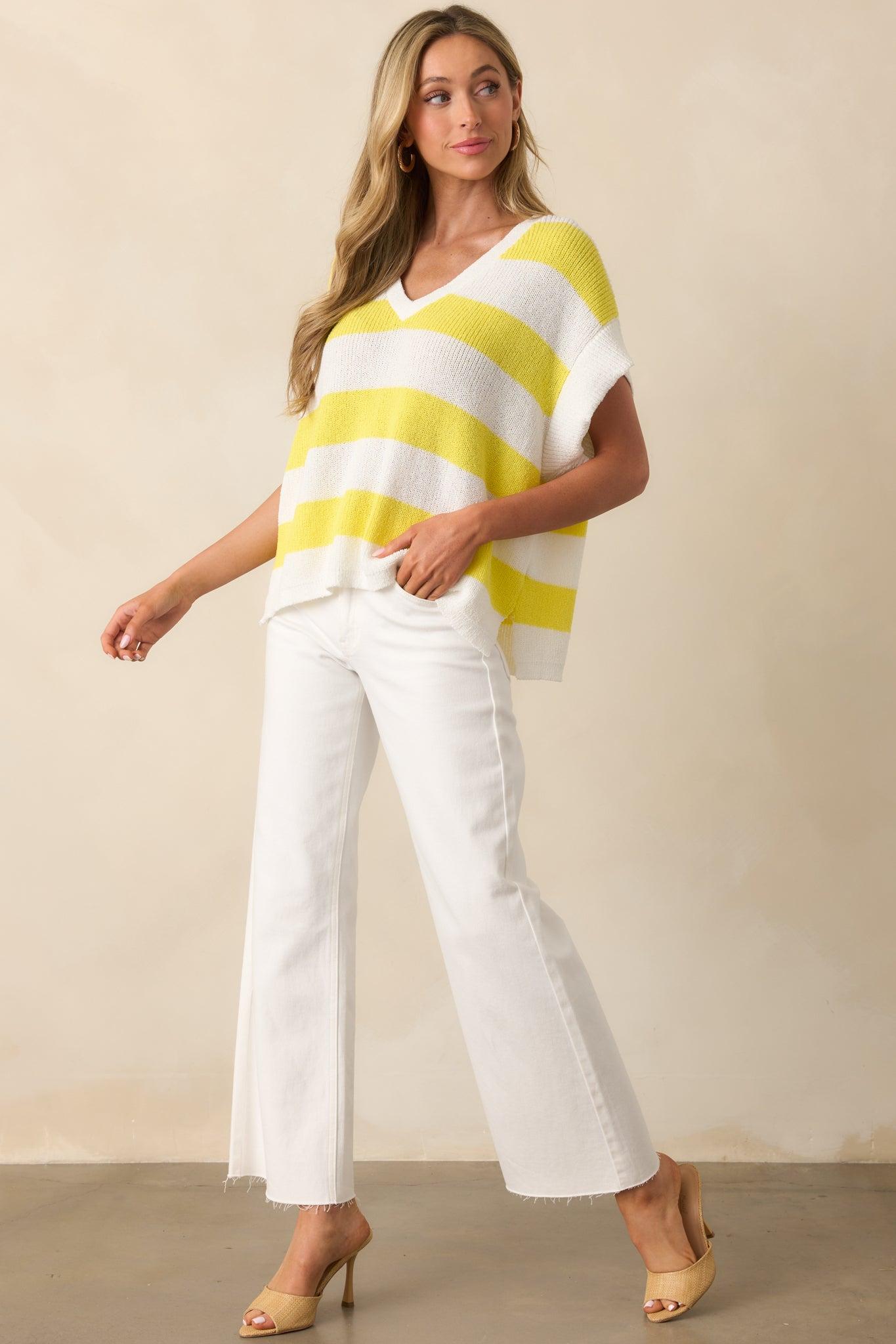 The Enjoy The Ride Yellow Stripe Oversized Loose Knit Top is for those days when you want to bring a little sunshine wherever you go. Its laid-back, playful spirit makes it perfect for spontaneous adventures, creative afternoons, or simply embracing the joy of taking things slow and savoring the moment. This top features a yellow & white stripe pattern, loose knit fabric, short cap sleeves, v-neckline, oversized fit, and side hem vent slits.