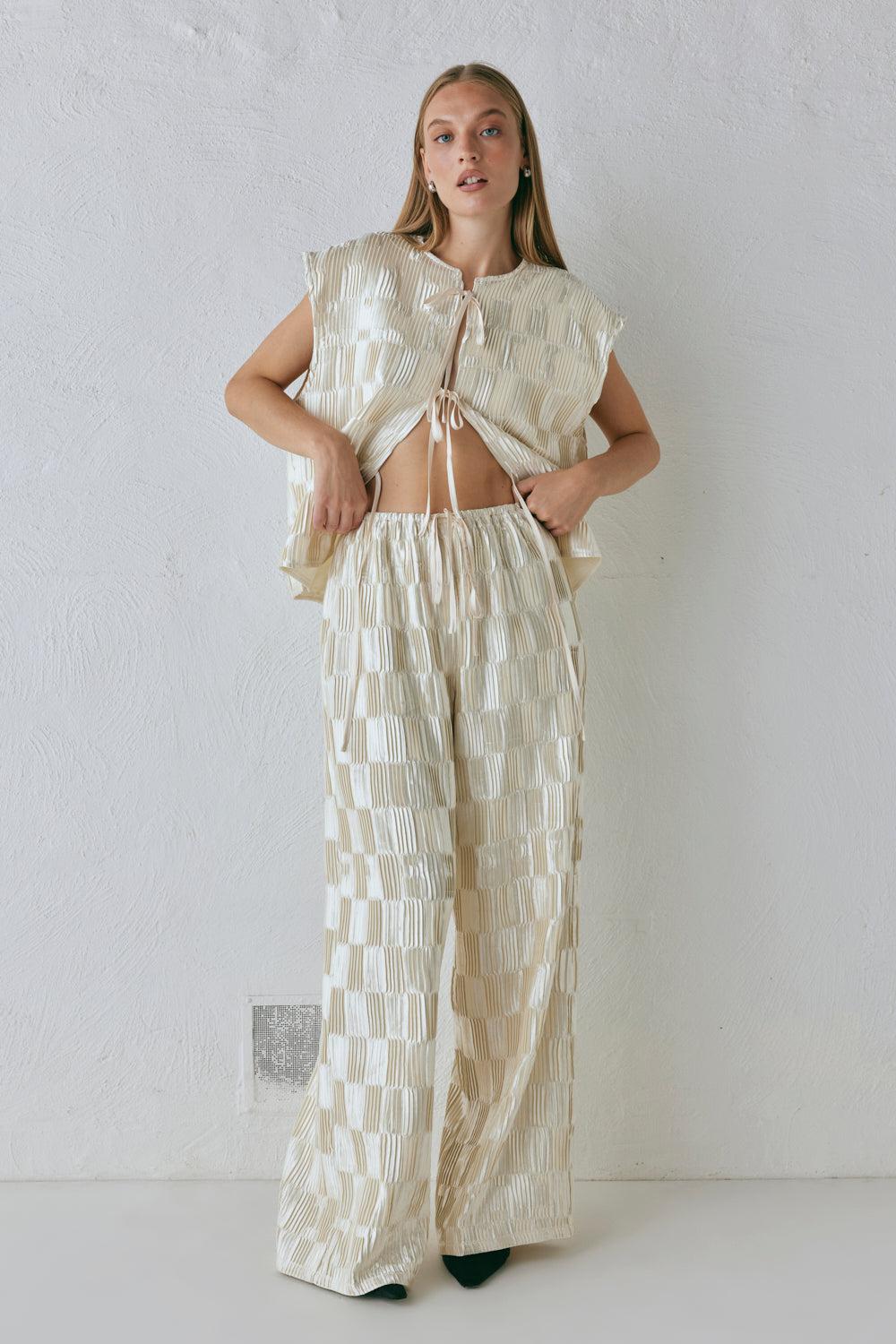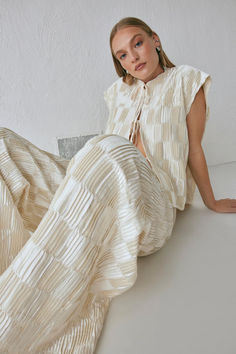 100% Polyester. Non-stretch fabric. Pleated fabric. Elastic drawstring waist. Cold Hand Wash / Cool Iron On Reverse. Designed in Australia.