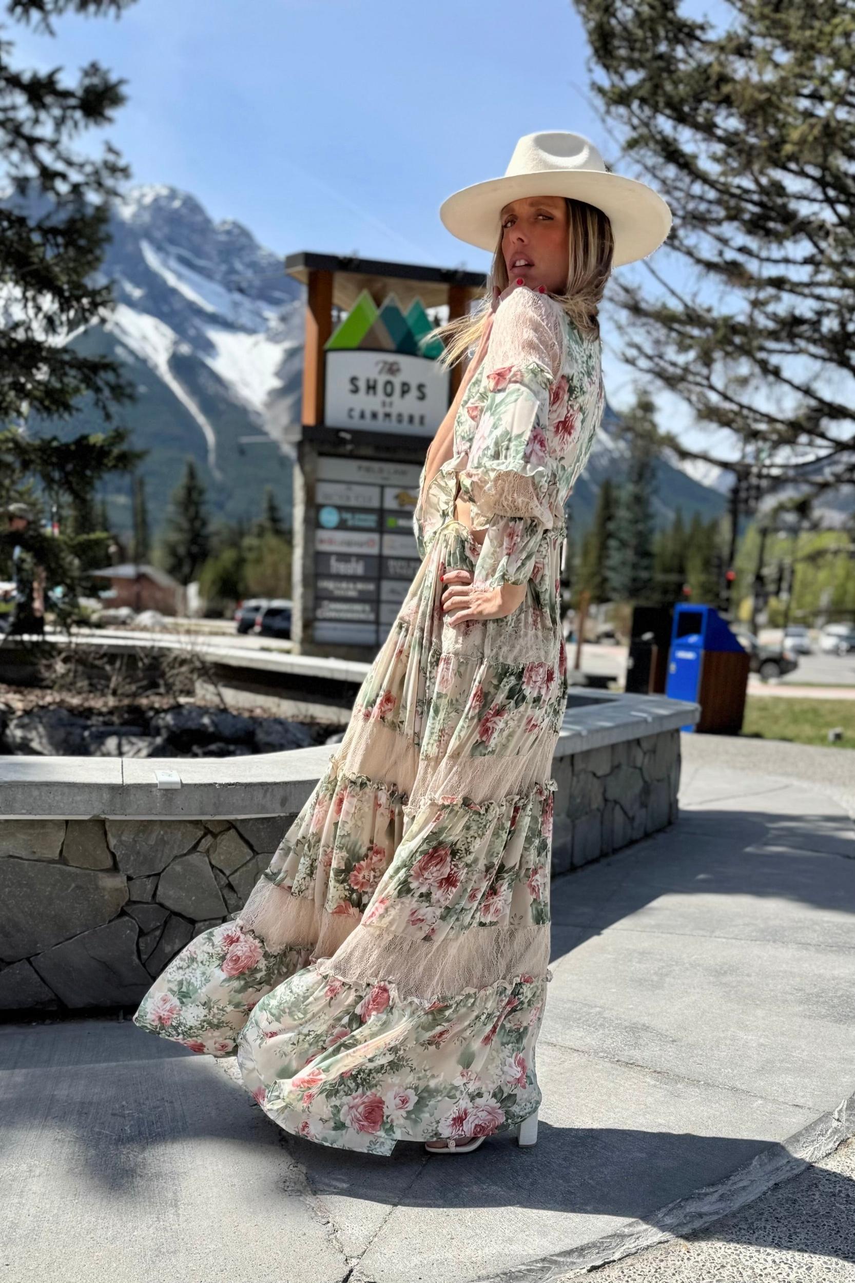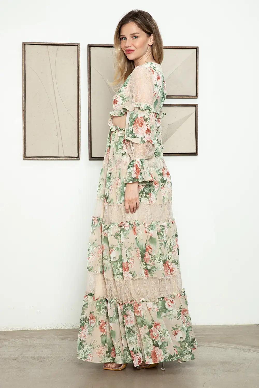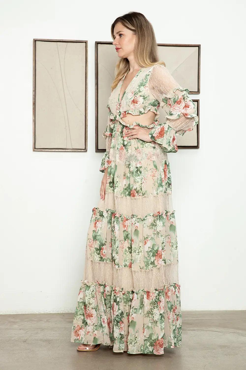 Be the epitome of elegance and sophistication in this dress! Featuring intricate floral lace detailing and a flattering tiered design, it offers the perfect blend of style and comfort. The sheer lace accents add allure, while the long sleeves provide a graceful silhouette suitable for any occasion. Whether a special gathering or an evening event, this maxi dress will make you stand out with its unique charm and timeless appeal. Elevate your wardrobe with this stunning piece that promises to turn heads.For an effortlessly boho-luxe vibe, pair with statement boho jewelry and strappy sandals. For a versatile day-to-night look, layer with a long black cardigan. And to elevate the look, add a statement belt to accentuate the waistline. This dress features a floral pattern, cut out details, flowy maxi length, ruffle detail along the skirt, semi-sheer bottom layer, lace detail, front button, open back, v-neck, and is not see-through. It also has a tier