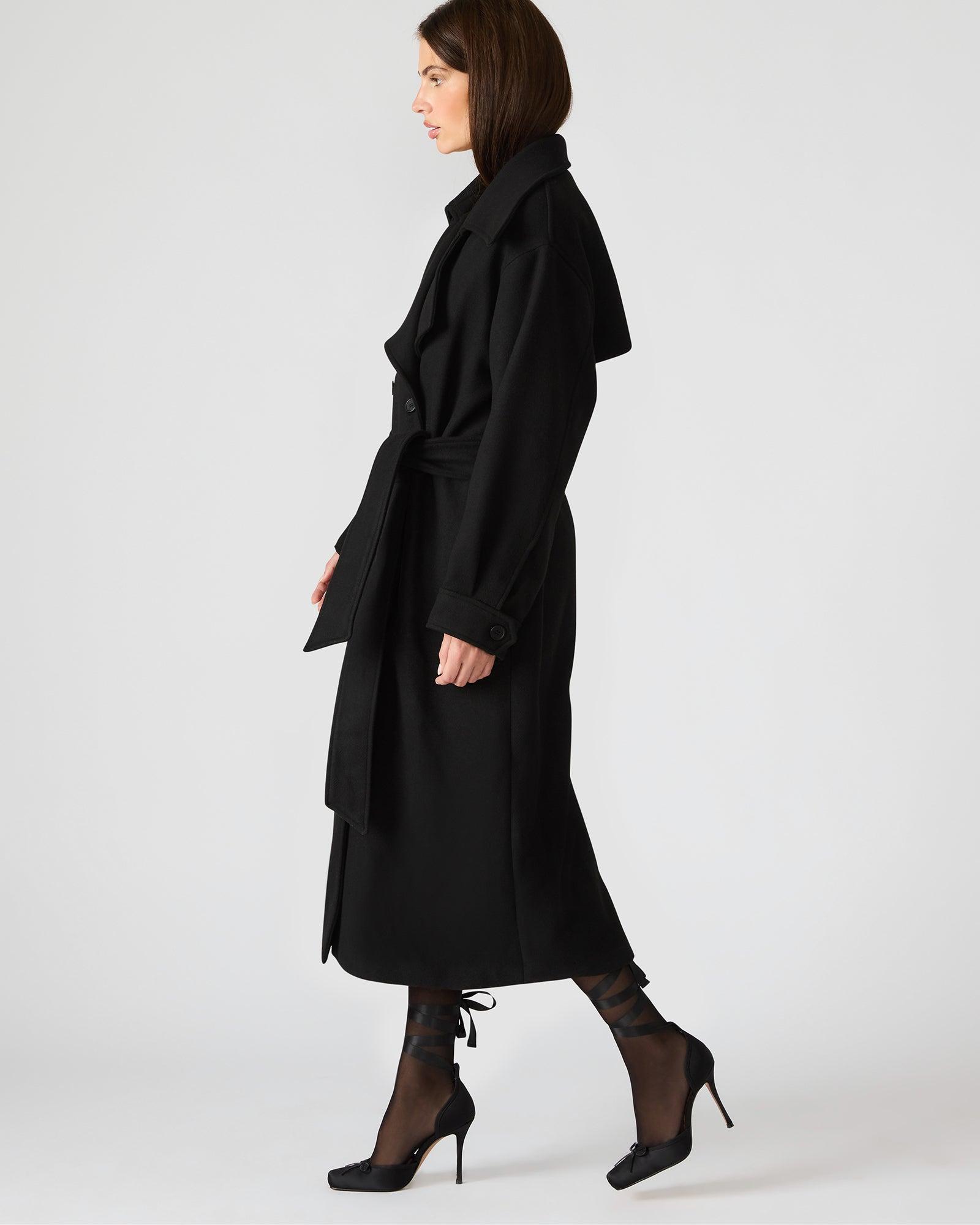The ENORA COAT BLACK is a sophisticated trench coat featuring a long-sleeved, button-up design with a classic collared neckline. Crafted to provide structured elegance and versatile layering, this coat offers both timeless style and practical coverage. Its tailored silhouette and refined details make it an essential piece for polished, professional wardrobes. Long-sleeved coat Button-up closure Collared neckline Two functional front pockets 95% polyester 5% wool Hand wash Ashtyn is 5ft 9in and is wearing a size small Imported