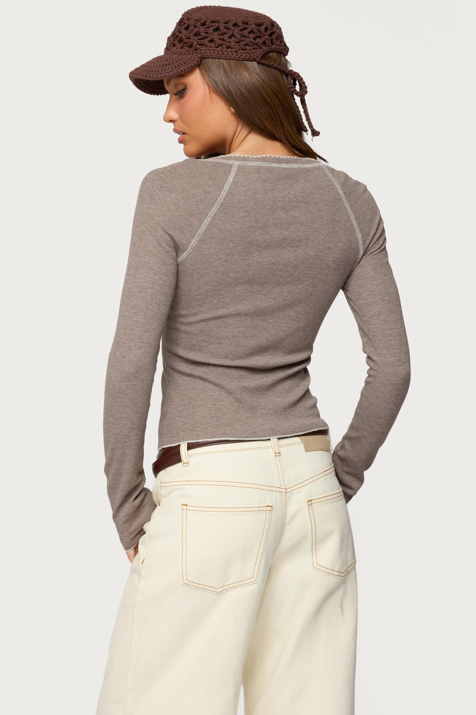 Top Long sleeves Henley design Contrast stitching Frill trim Polyester, Rayon, Spandex Model wears size S Model height is 5'8 Item care: Machine wash at maximum 30ºC, wash with similar colors, do not bleach, do not tumble dry, iron at a maximum of 110ºC, do not dry clean