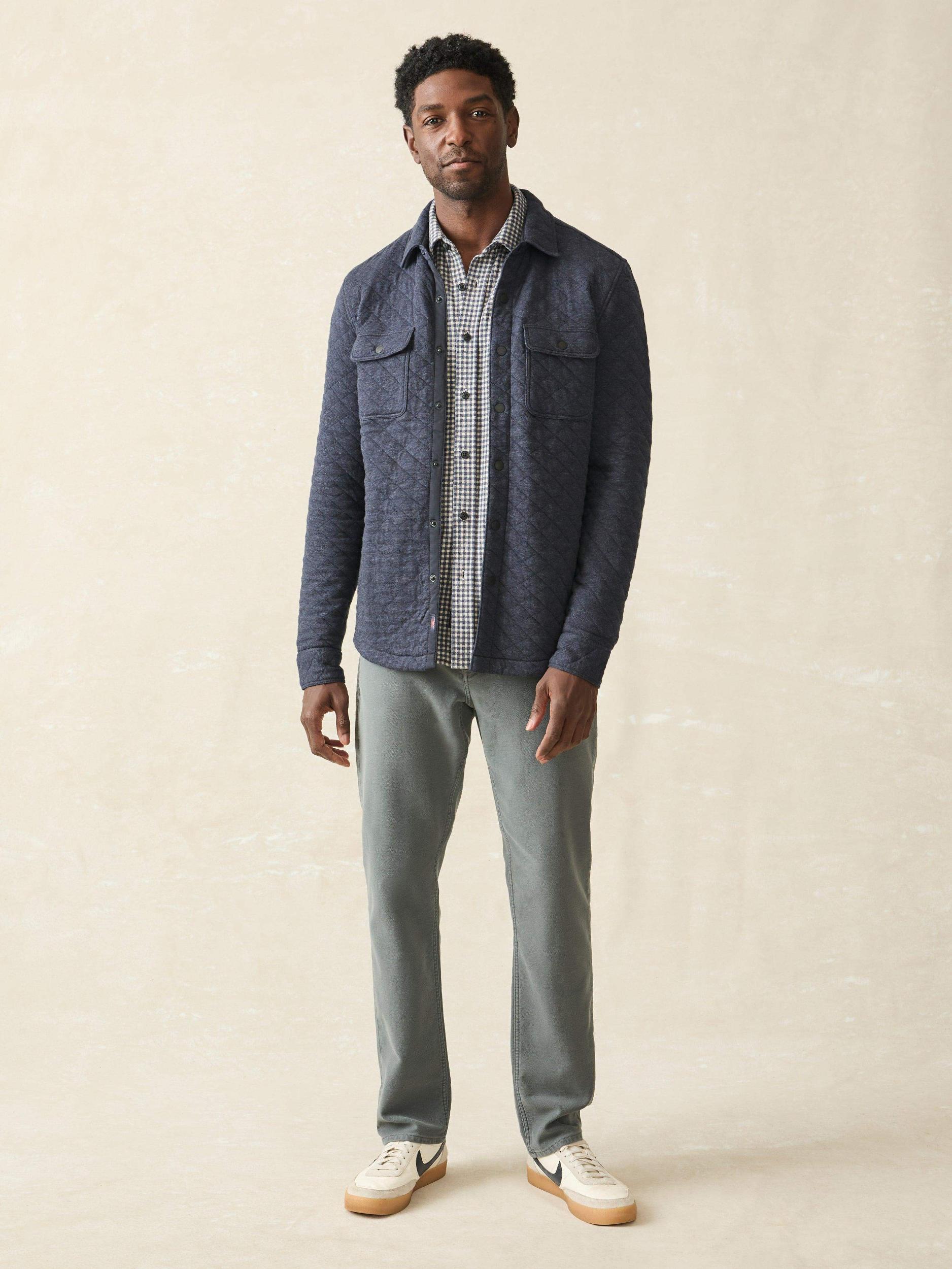 Quilted with three layers for structure, texture and warmth, this midweight fleece CPO is endlessly versatile with utility details, especially as a transition piece when the cooler months roll in. Fit: Relaxed shirt fit. Designed for layering or wearing on its own over a tee. Detail: Point collar. Snap front chest. Adjustable snap cuffs. Waist welt pockets. Material: 78% Cotton, 22% Polyester, Faherty MFG Enamel Snaps Model: Jamal is 6’2 wearing size Medium Care: Close all fastening before wash, turn inside out, machine wash cold with like colors Imported MOF2209-NYM
