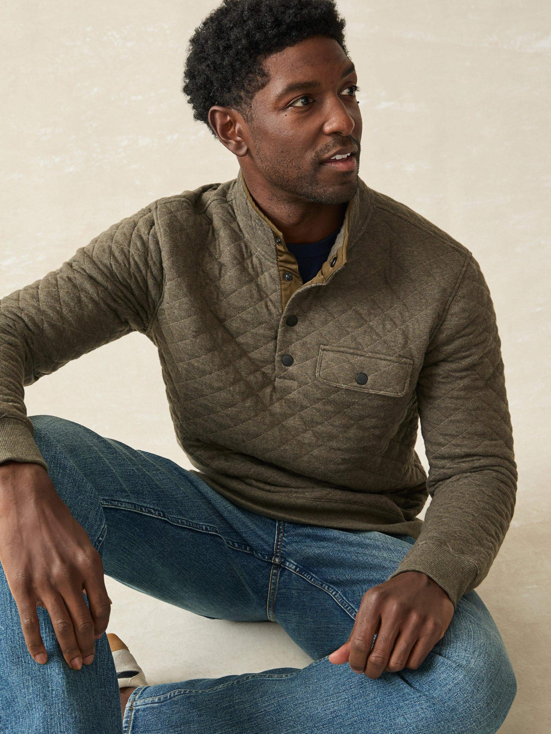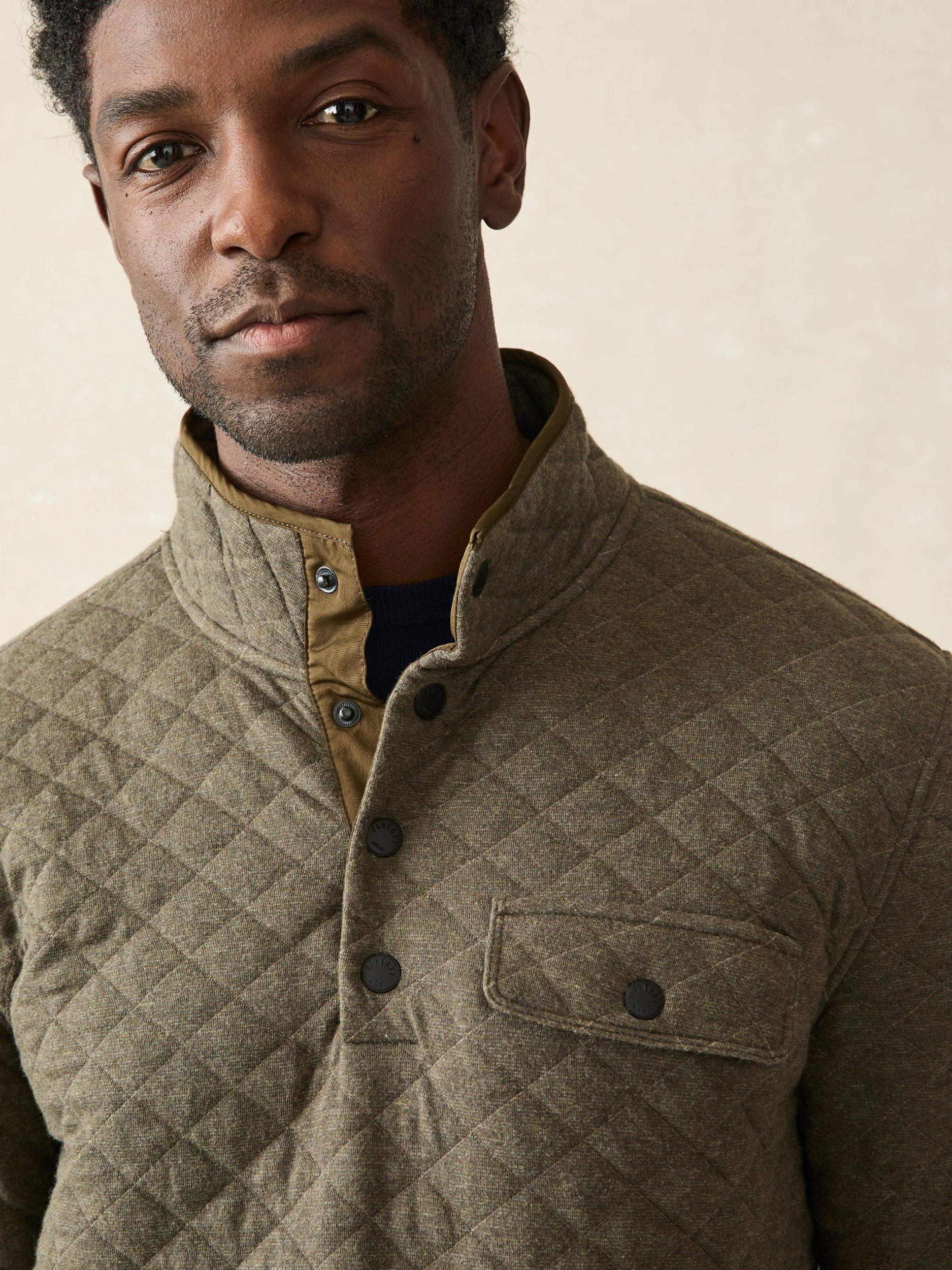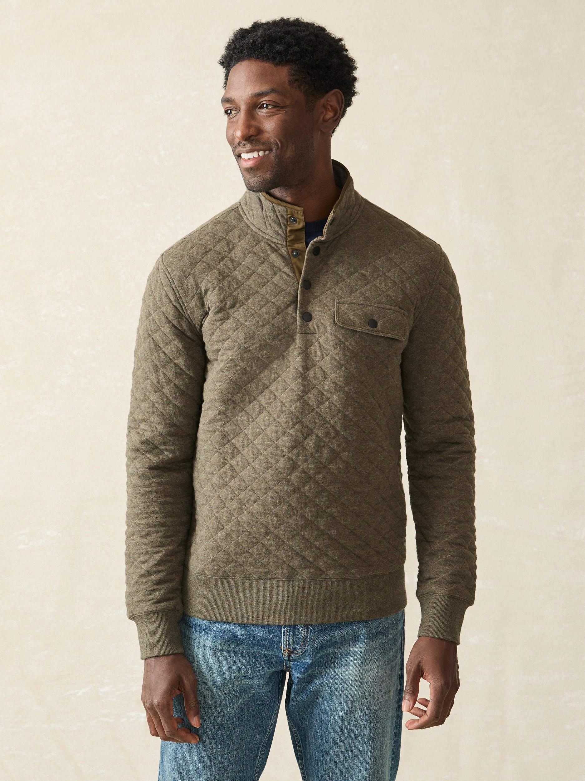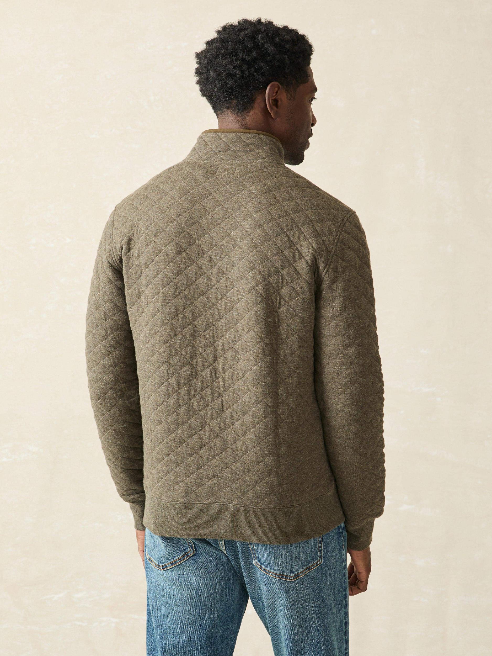 Half sweatshirt, half jacket – this casually rugged layer is our modern update to traditional quilted outerwear. Each diamond stitch pattern holds a just-warm-enough insulation between two layers of heathered fleece while still remaining light and allowing for mobility. The relaxed fit is ideal for layering over a button-down or tee. Fit: Classic crewneck sweater fit - designed for layering. Detail: Stand collar. Quarter length snap placket. Chest pocket with snap and flap closure. Knit rib at cuffs and hem. Woven Sun & Waves label at wearer's left hem. Material: 78% Organic Cotton, 22% Recycled Polyester; Ribbing at sleeve cuffs and bottom band; Matte Black Enamel Snaps at Center front and Wearer's Left Pocket Model: Jamal is 6’2 wearing size Medium Care: Close all fastening before wash. Turn inside out. Machine wash cold with like colors MOF2207-OLM