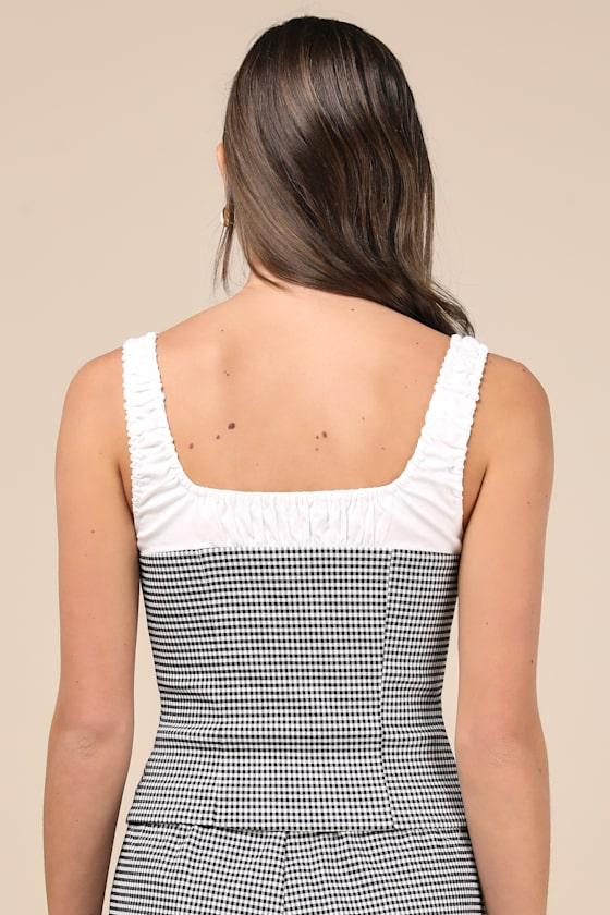 It's easy to be the cutest in any room with the Lulus Erica Black and White Gingham Button-Front Top! Lightweight woven fabric, with a chic gingham pattern throughout, shapes this bustier-inspired tank top with seamed cups and a functional button placket along the center of the fitted silhouette. White ruched straps and a square neckline with tying detail at the front complete the look. Pair with the matching pants for a complete look!