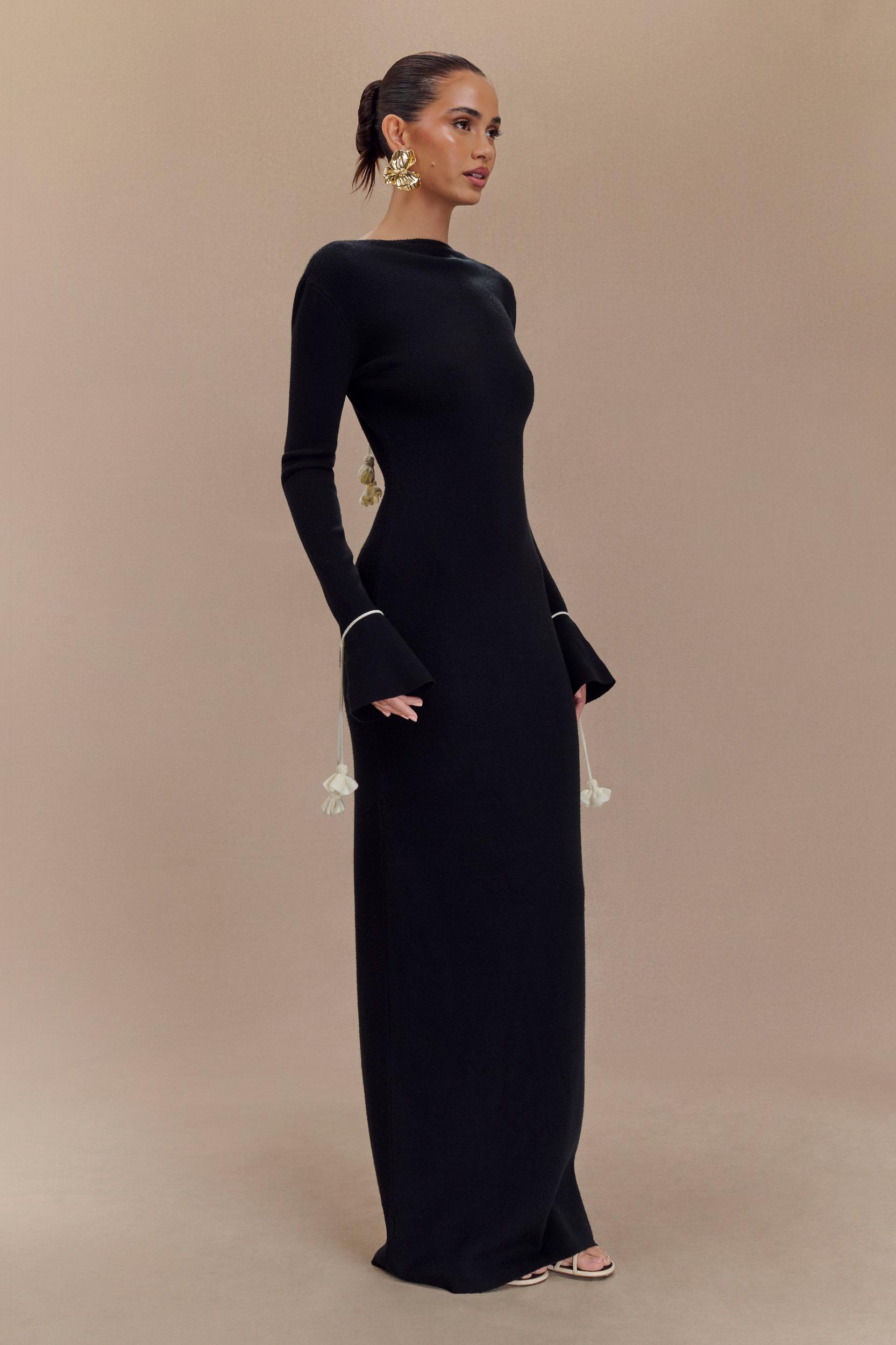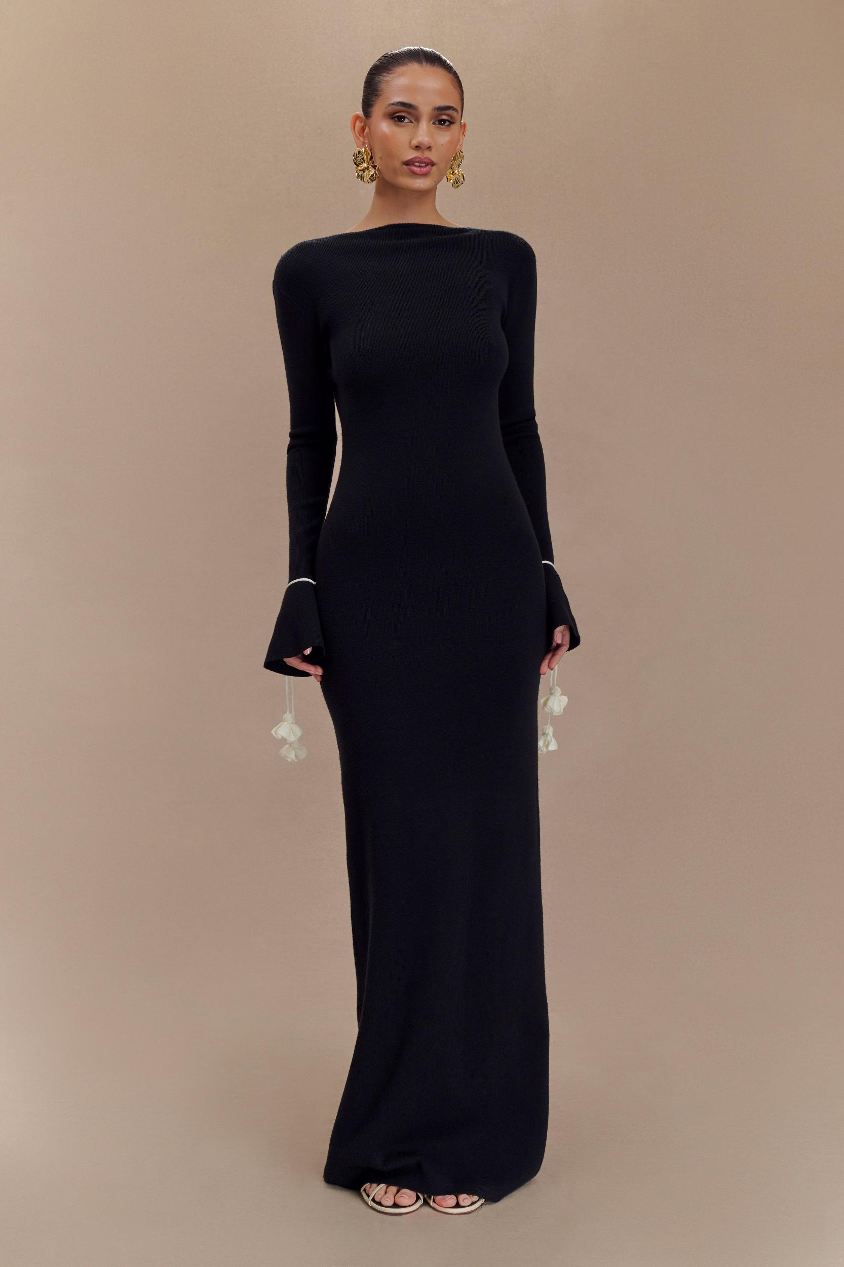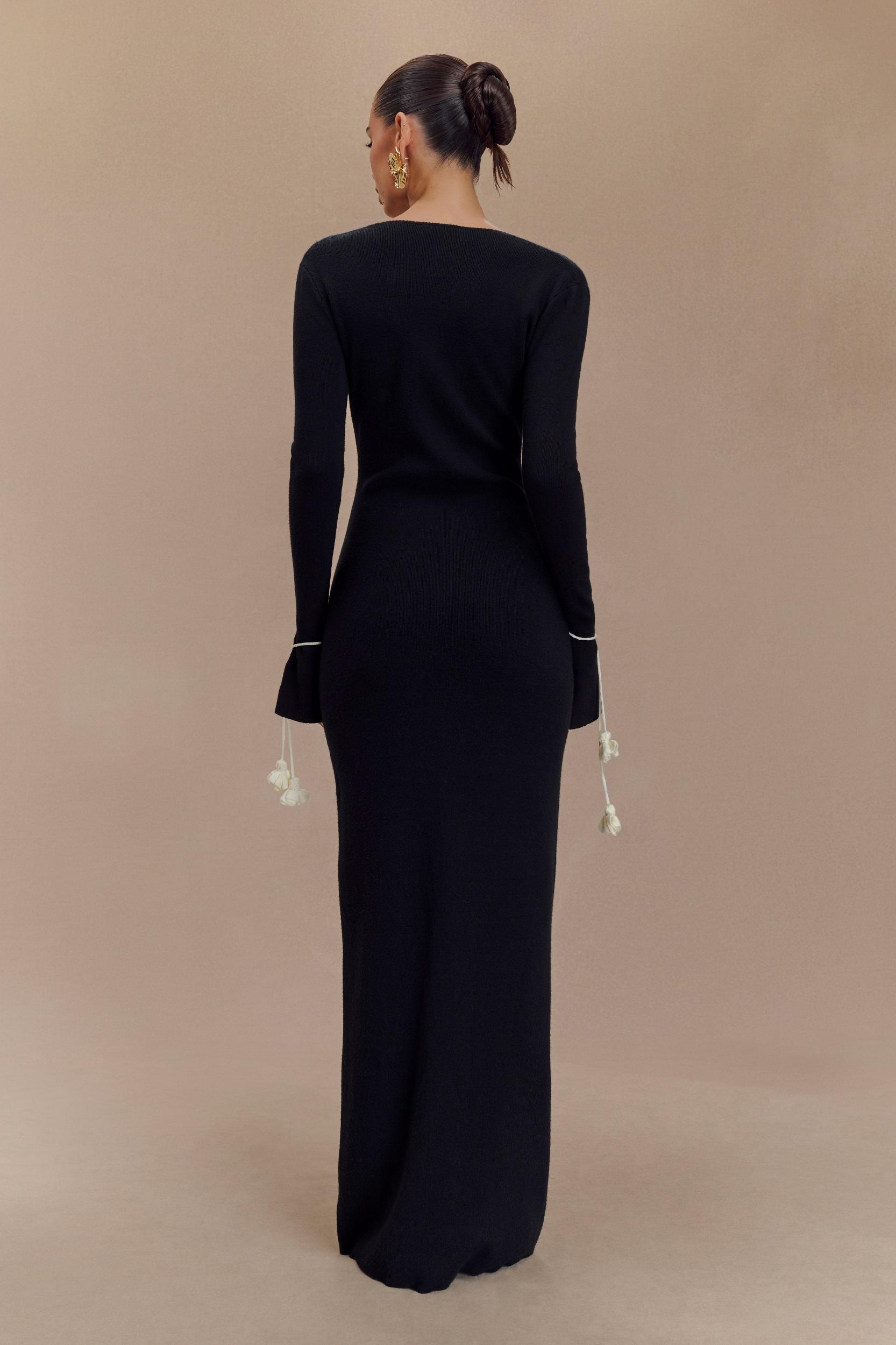 Chic versatility. Step into effortless elegance with the ERICA Knit Maxi Dress with Floral Ties. This stunning dress features a flattering V front neckline and long sleeves that create a sleek silhouette, while the bodycon design hugs your curves beautifully. The maxi length adds a touch of drama, making it perfect for both day and evening occasions. What sets this dress apart are the contrast straps adorned with delicate floral trim along the neckline and wrists, adding a playful, feminine touch. For added versatility, this dress can be worn backwards, showcasing a deep V at the back for a bold look. Unlined for a lightweight feel, this dress is a versatile wardrobe essential, ready to be styled for any occasion.