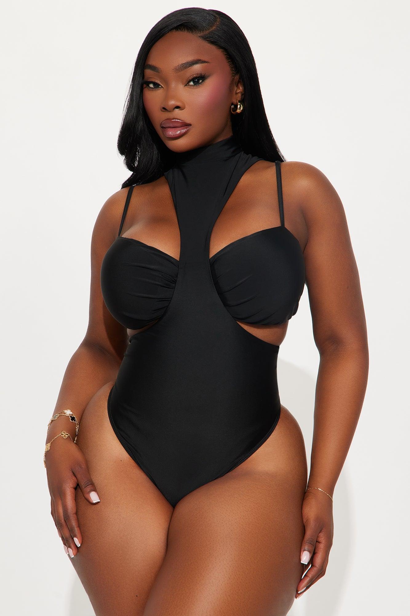 Available In Black And White. Bodysuit Stretch Adjustable Spaghetti Straps Turtle Neck Detail Cut Out Cheeky Bottom Snap Closure Padded Top Final Sale Shell: 82% Nylon 18% Spandex Lining: 82% Nylon 18% Spandex Imported