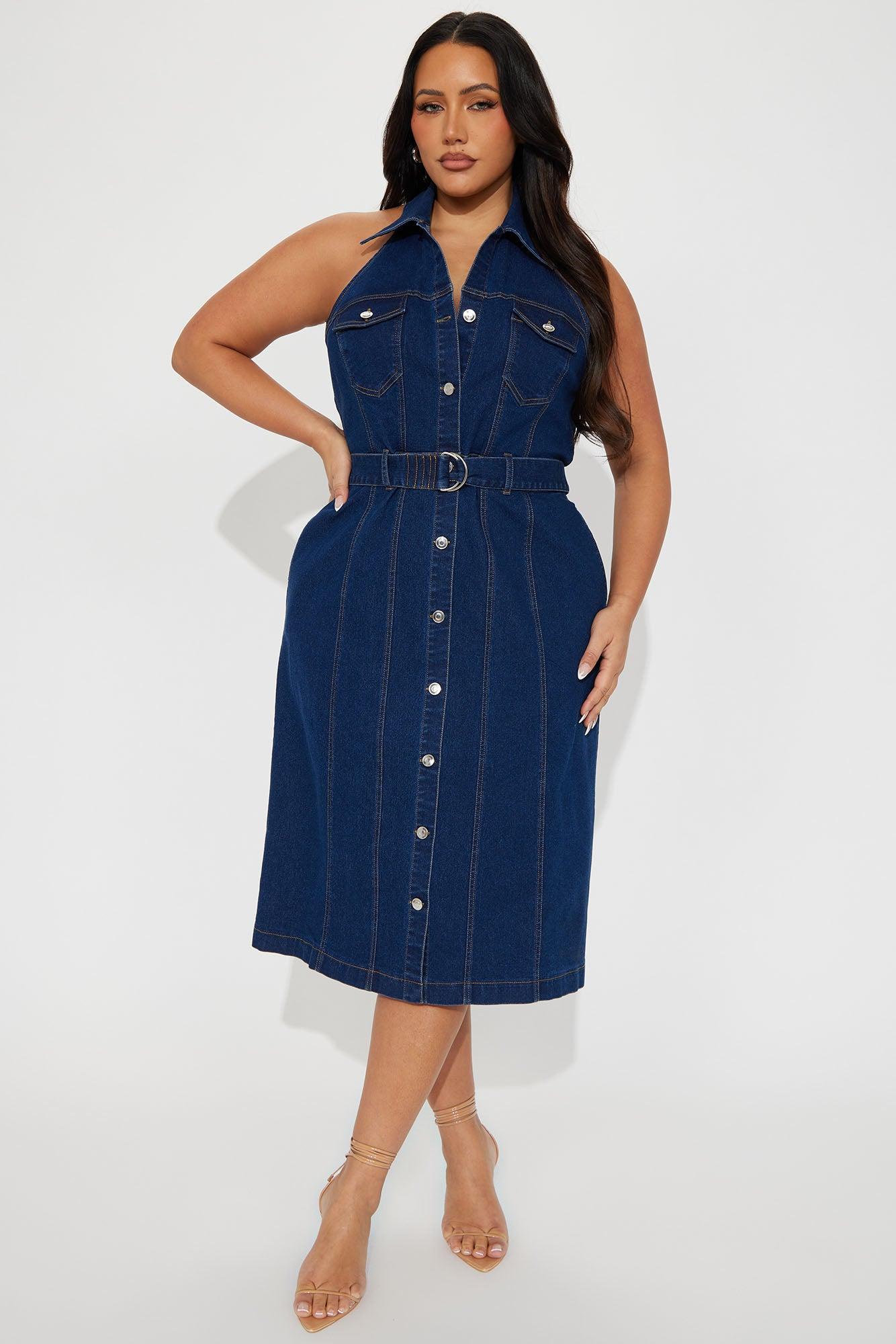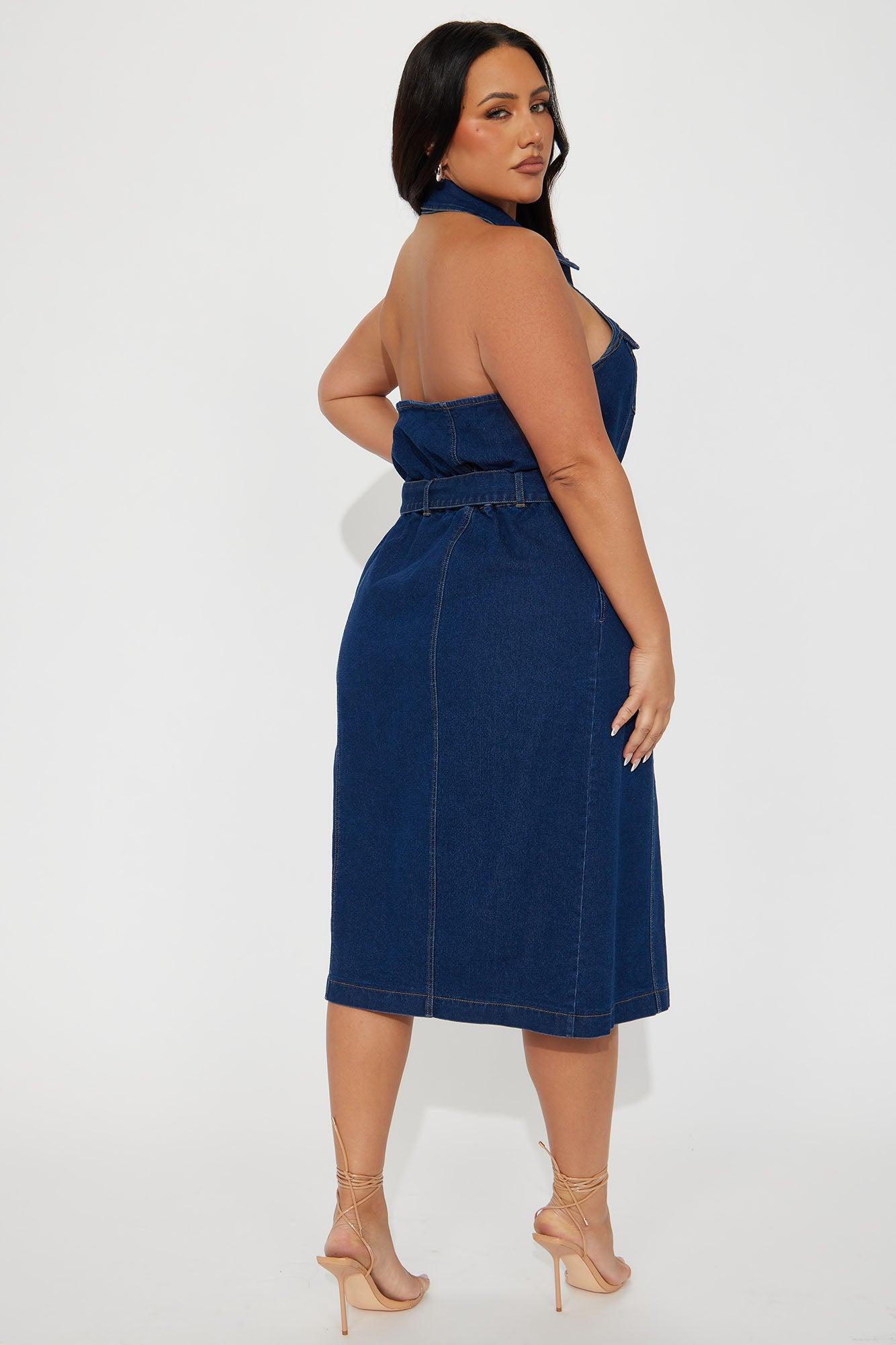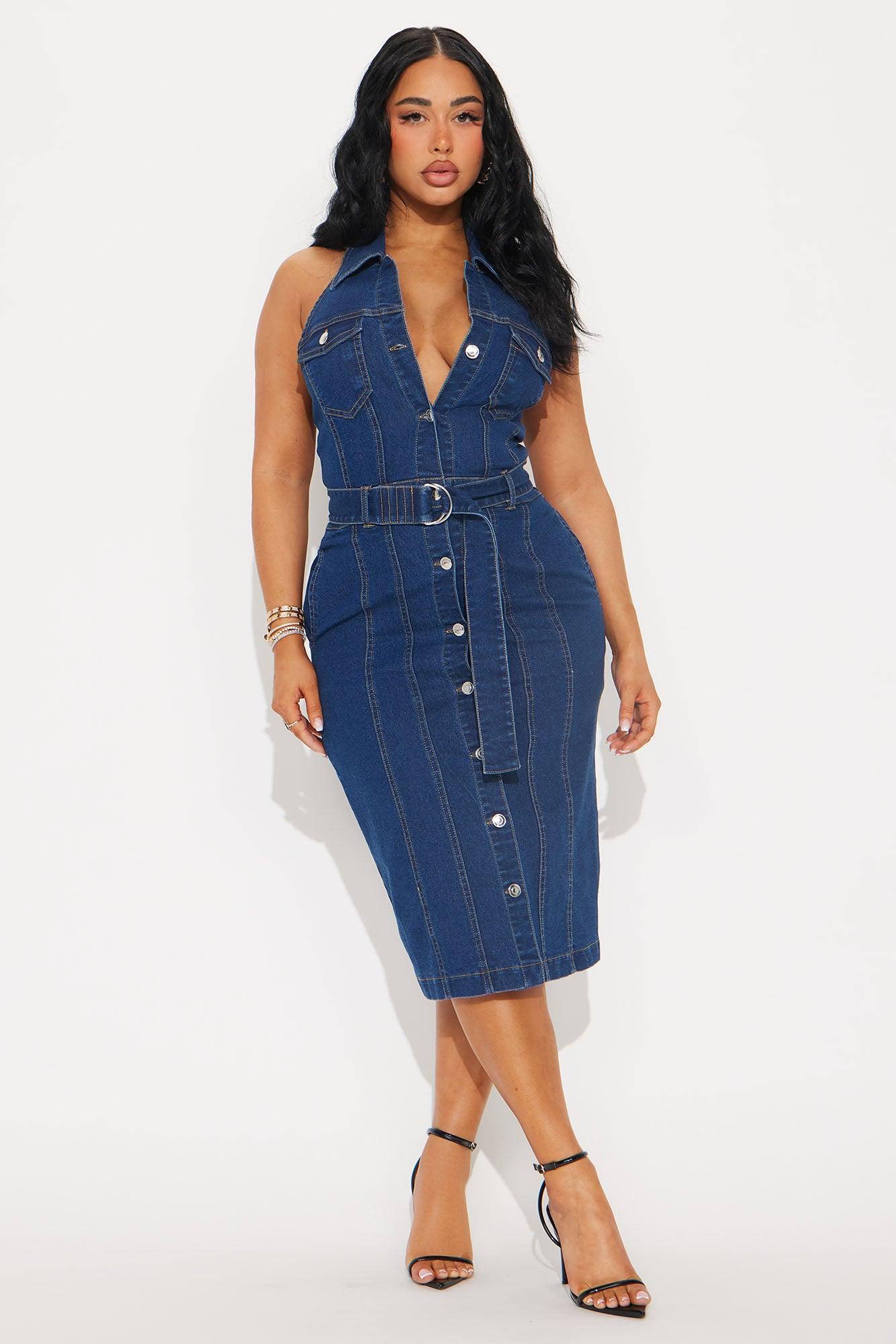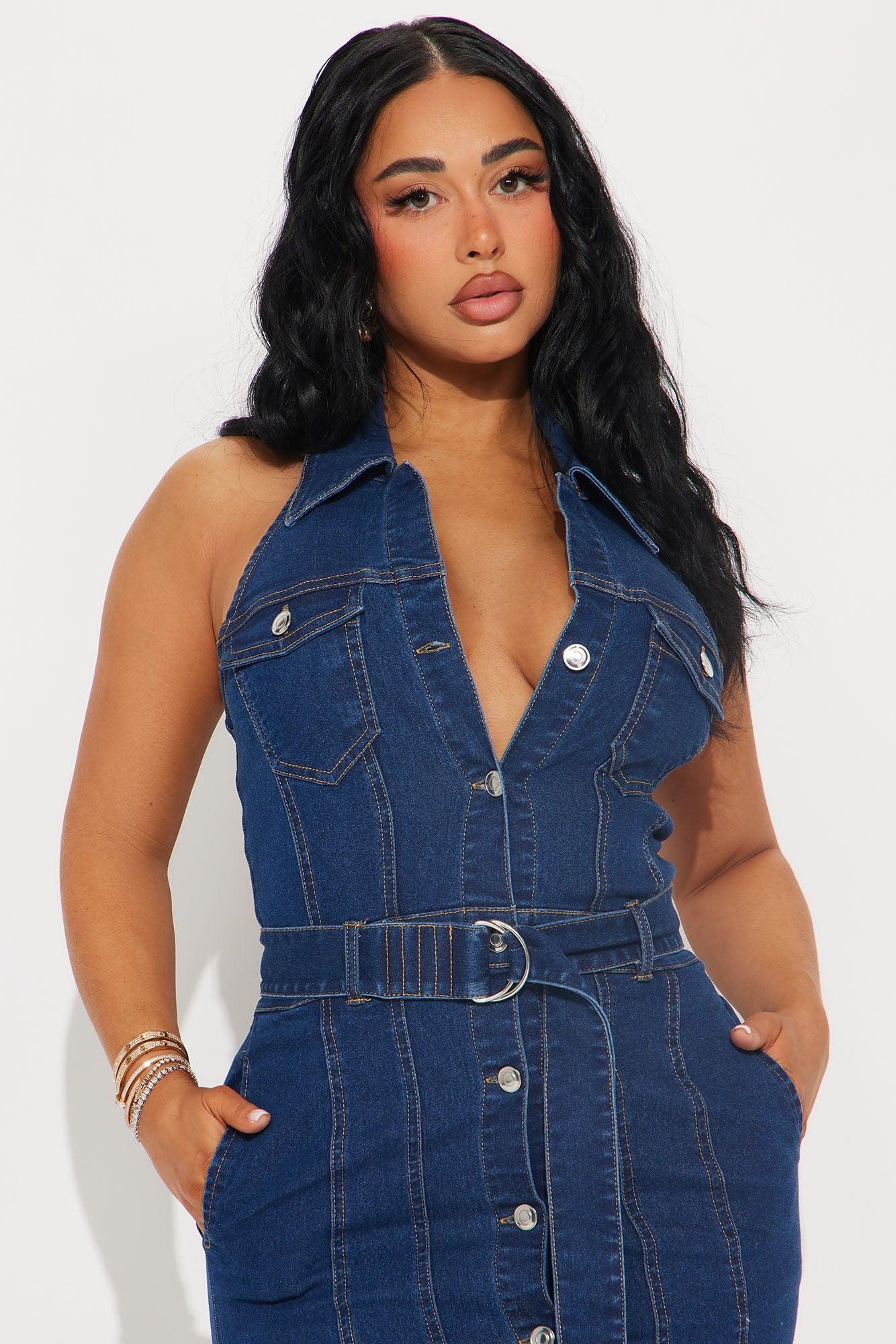 Available In Dark Wash And Light Wash. Denim Midi Dress Halter Collar Belted Button Front Backless Slight Stretch Disclaimer: Due To The Specialized Wash, Each Garment Is Unique. 70% Cotton 28% Polyester 2% Spandex Imported