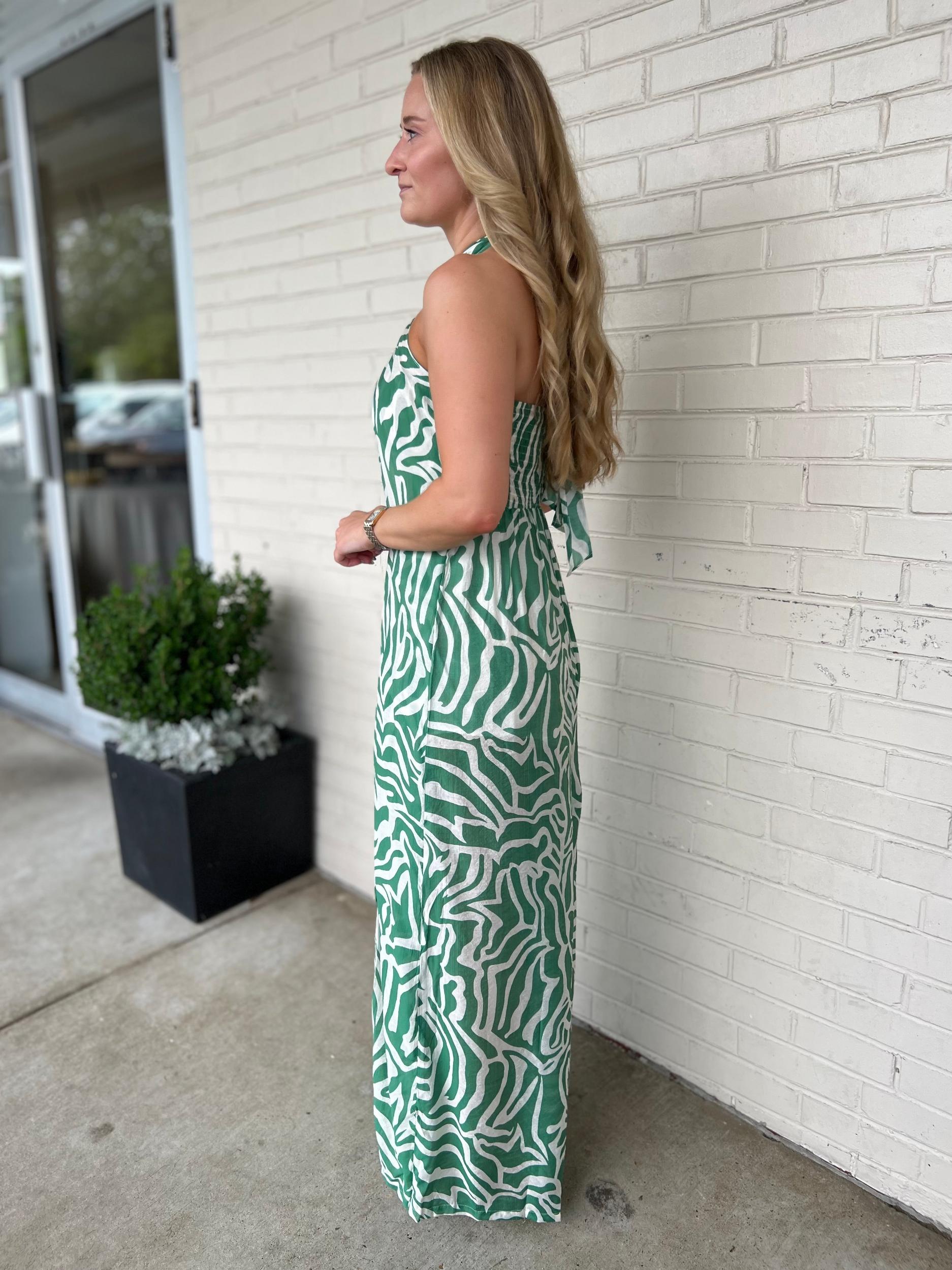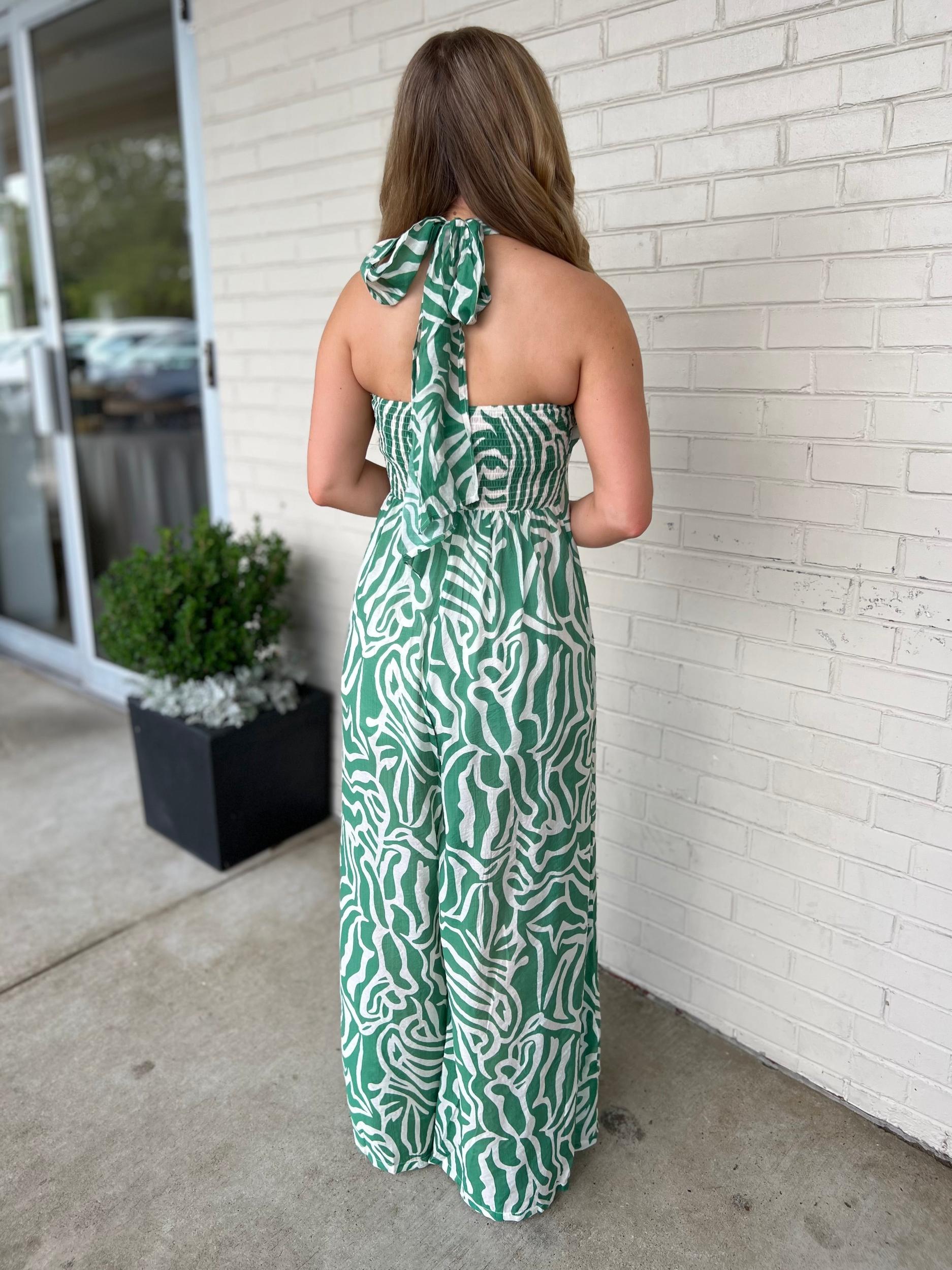 The Erin Jumpsuit brings a playful twist to your wardrobe with its abstract-print woven fabric and versatile design. Featuring a cross-front halter neckline that can be worn strapless, this sleeveless romper offers a relaxed fit and a high waist for flattering comfort. The low back with elastic smocking adds a touch of ease, while the wide-leg bottom with a wrapped tulip design creates a breezy, stylish silhouette. With a partial thigh-length lining, it’s perfect for sunny days and spontaneous adventures.