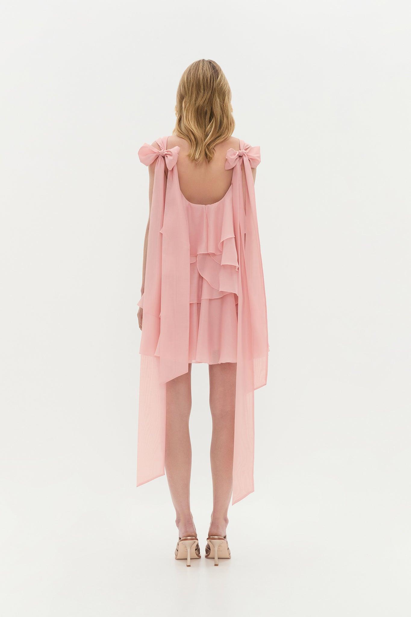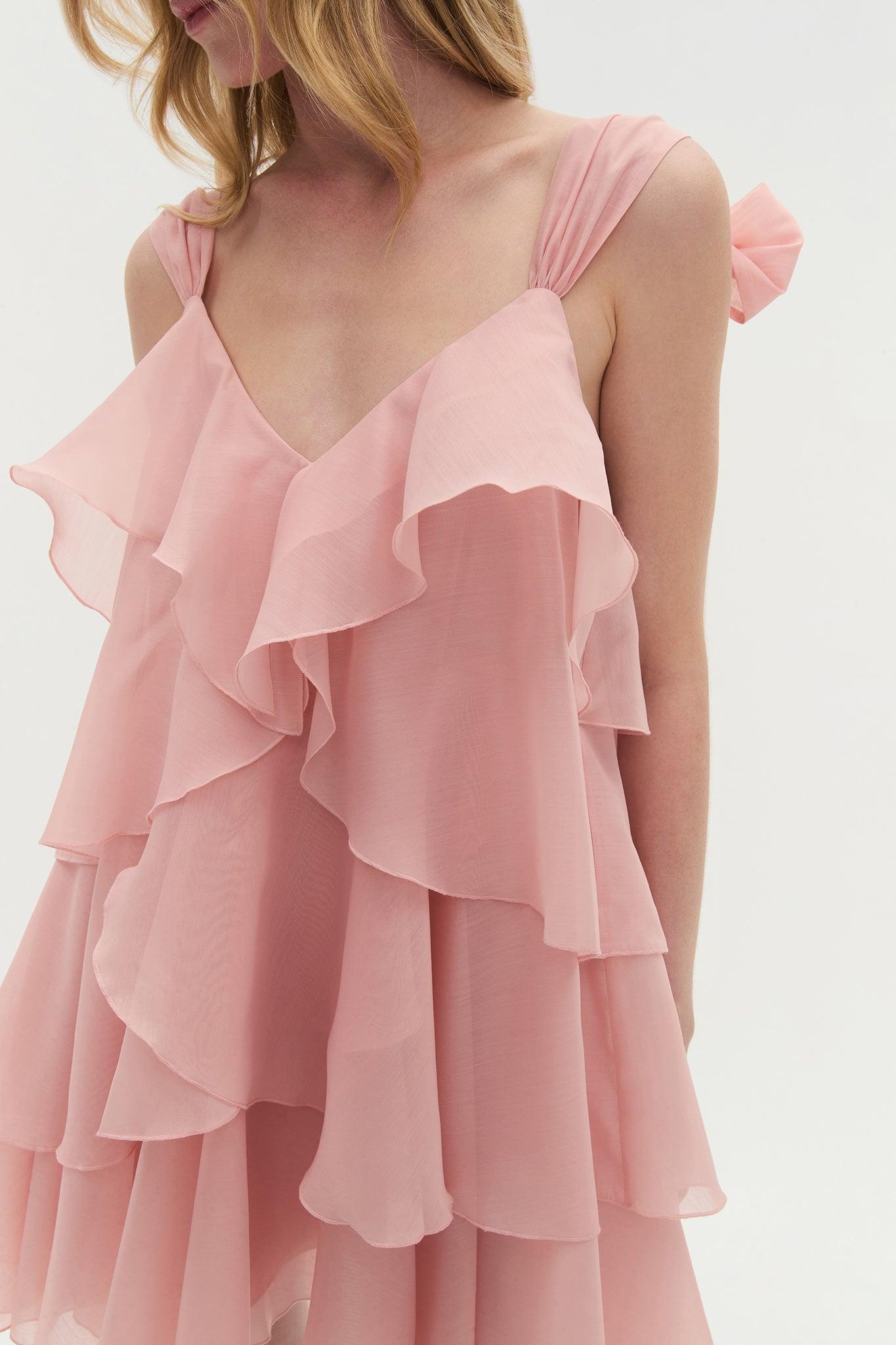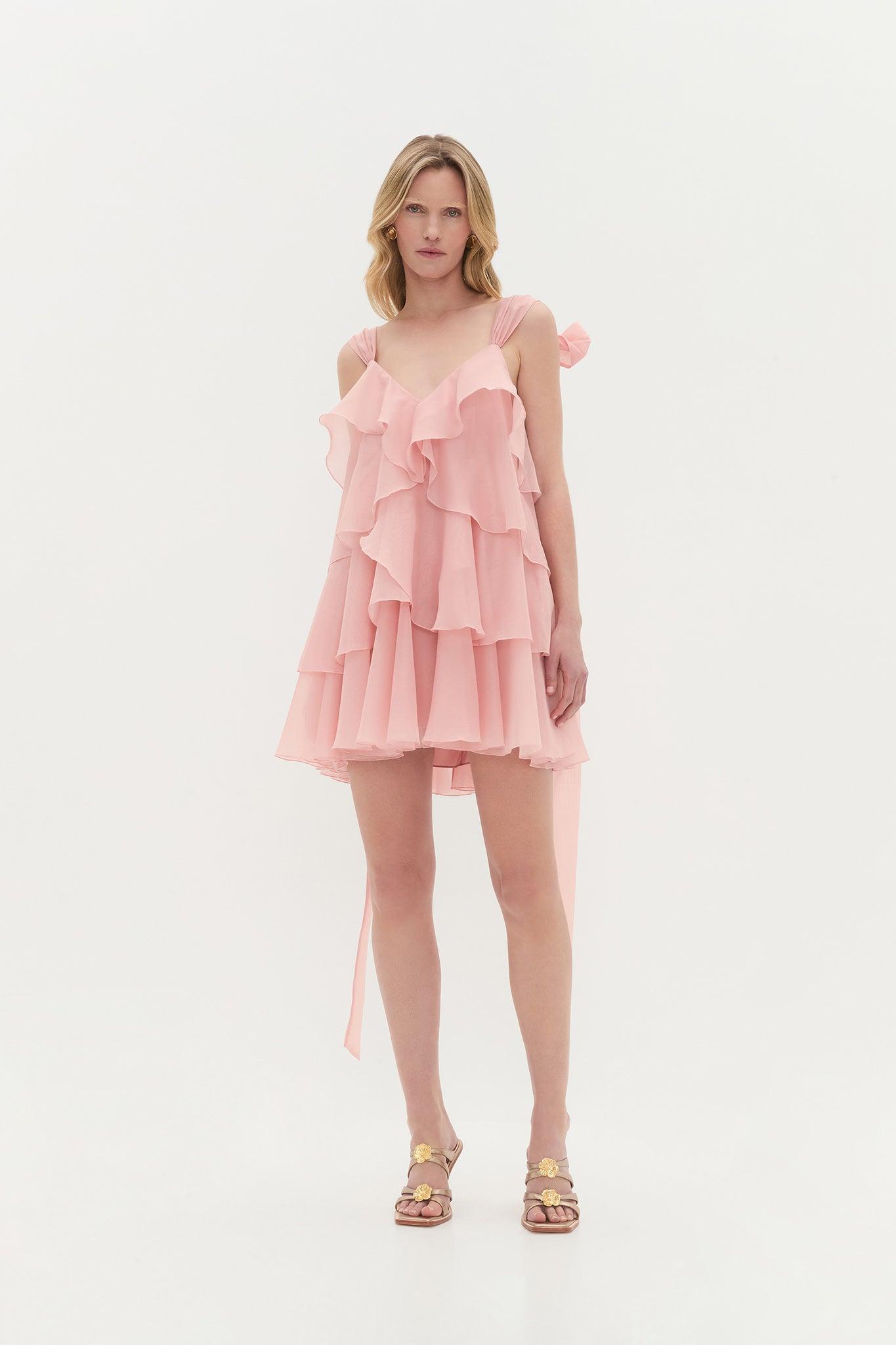 PRODUCT DETAILS Women's mini dress Voluminous silhouette Gathered tie straps Layered ruffles throughout Zip, hook and eye closure Lined style 100% Polyester Dry Clean Only Shop All Dresses SIZE AND FIT Model wears a size AU 8/S Height: 178cm/ 5’10 Bust: 76cm Waist: 65cm Hips: 90cm