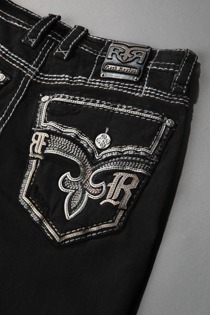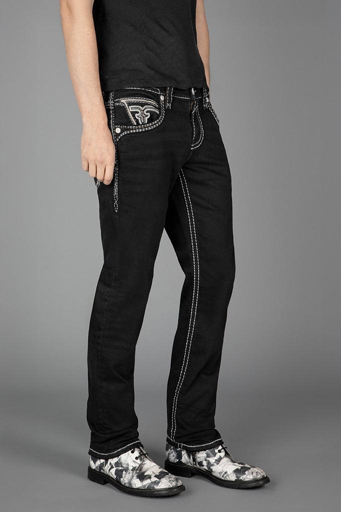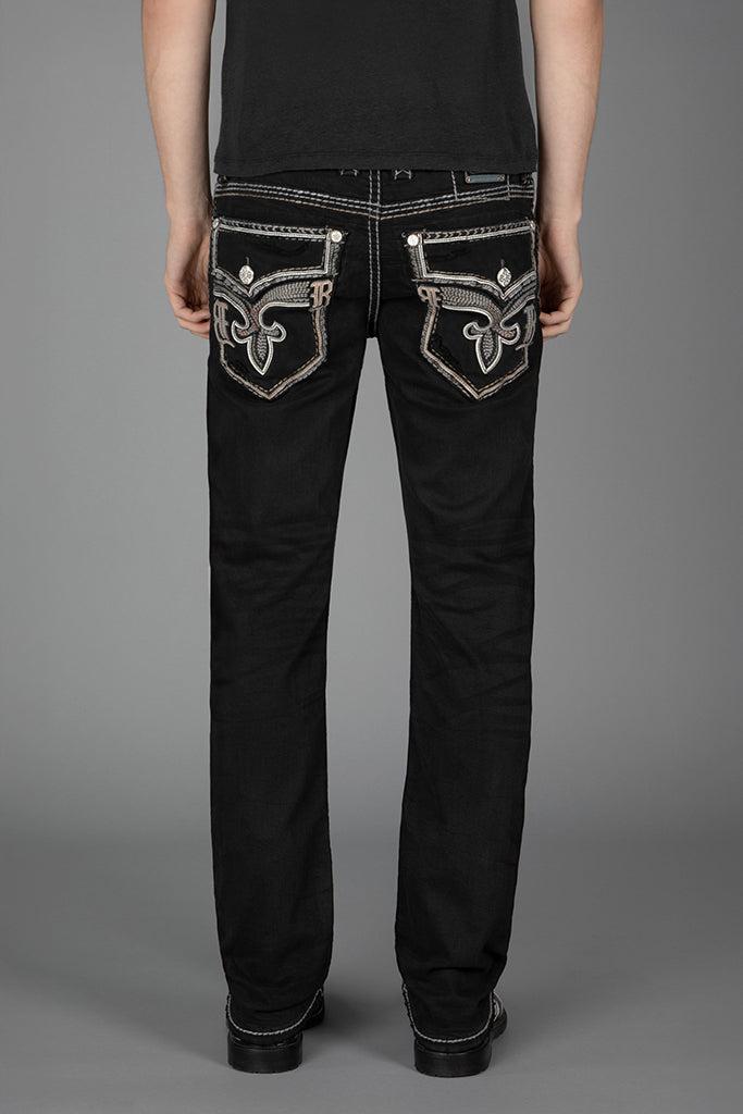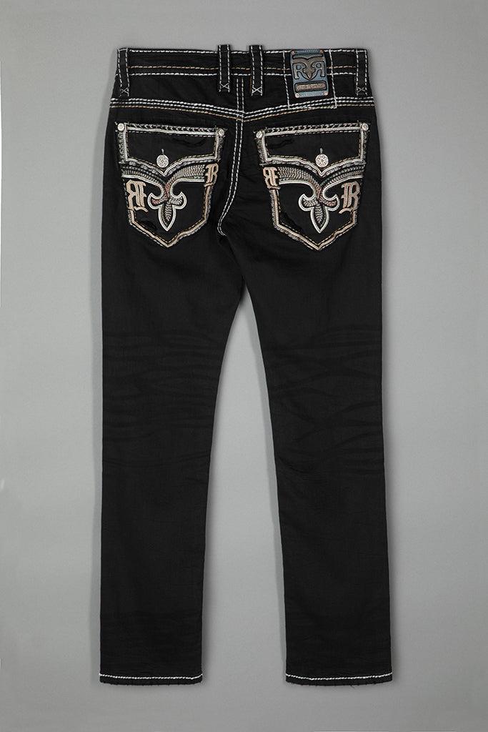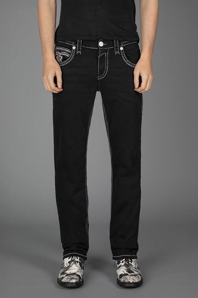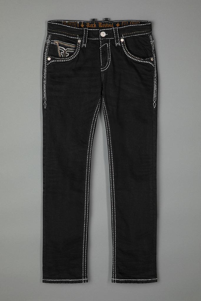 Ermias Straight Jeans by Rock Revival with a straight silhouette crafted in an overdye wash, designed in Los Angeles. Premium stretch denim for comfort and durability Signature inverted Fleur-de-Lis embroidery Custom pewter hardware and rivets Engraved 'Rock Revival' leather waist patch