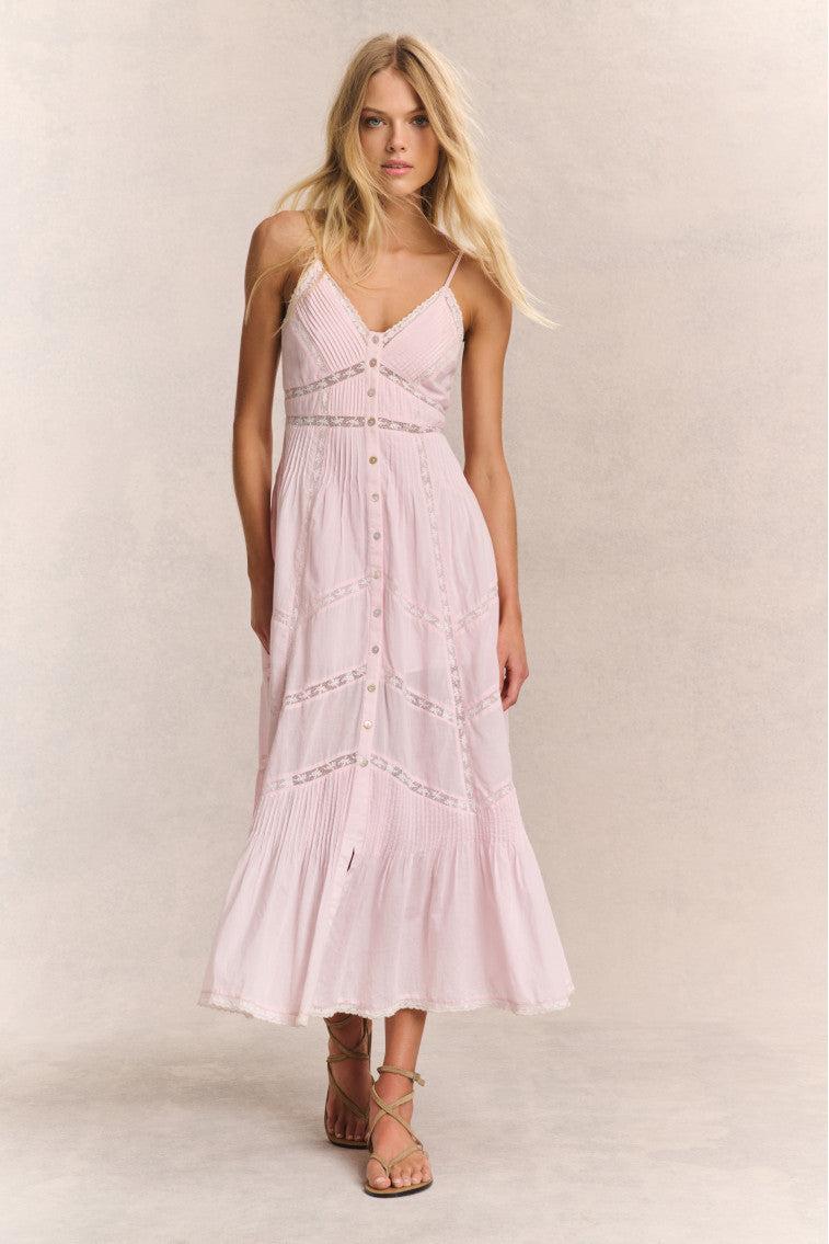 Introducing the Esilda Dress. Timeless and effortlessly chic, this airy cotton midi begins with spaghetti straps above a v-neckline that sits above a fitted waist yoke that descends to a center front placket with buttons. This piece has a smocked back for easy and comfortable wear.