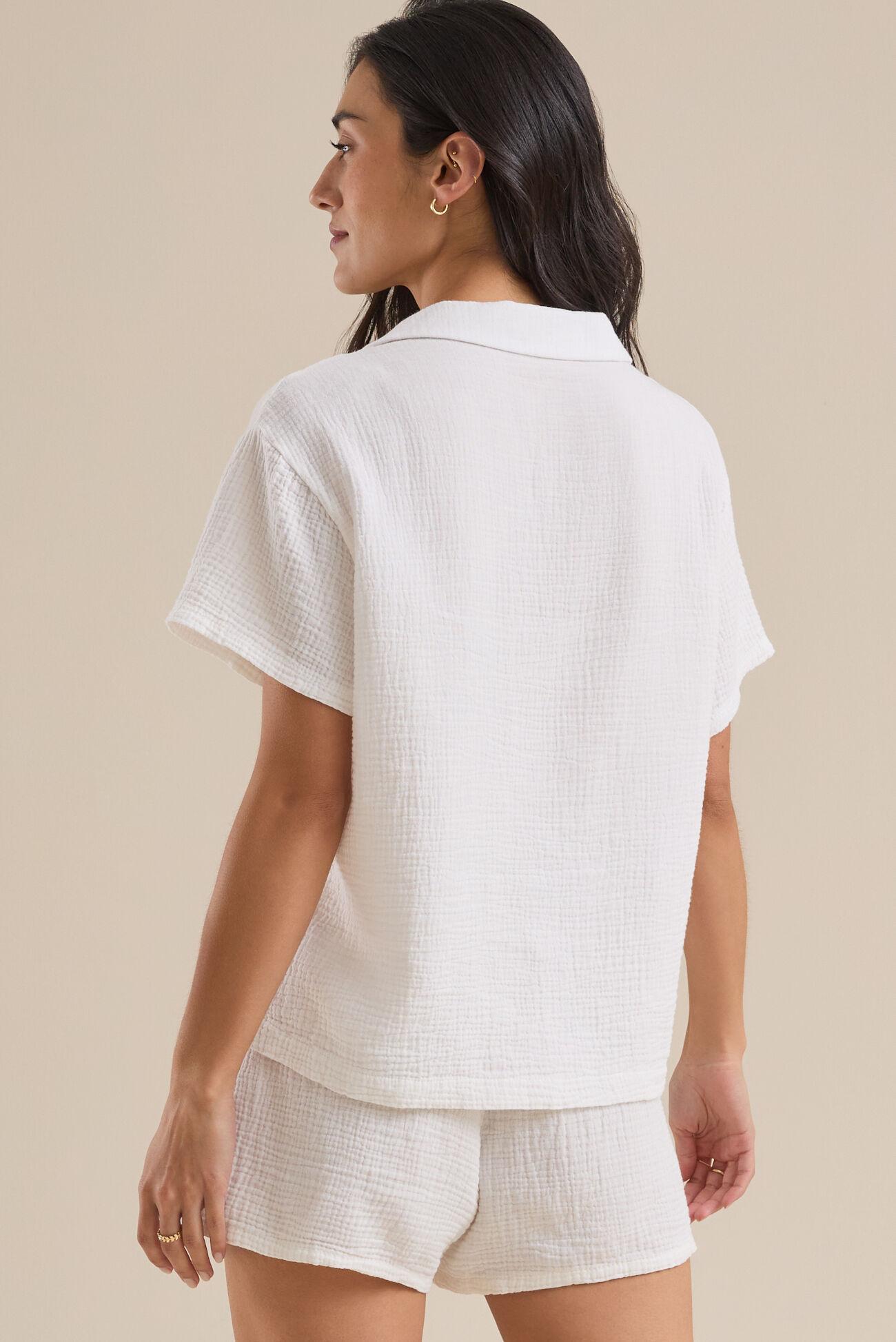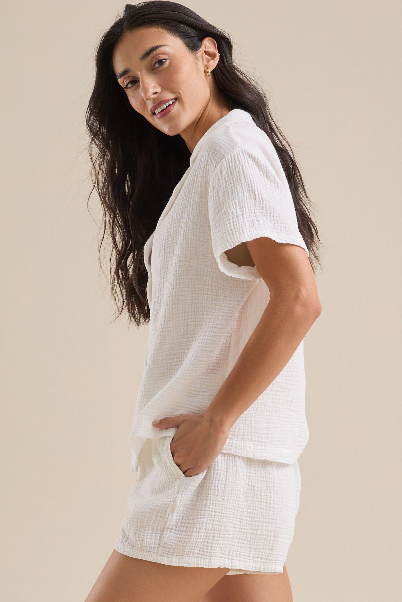 Crafted from lightweight, airy bubble gauze, this button-up shirt offers effortless, year-round style. The relaxed fit drapes perfectly, while the subtle texture adds a touch of dimension. Layer it over a tank for breezy days or wear it solo for a relaxed take on tailored dressing.