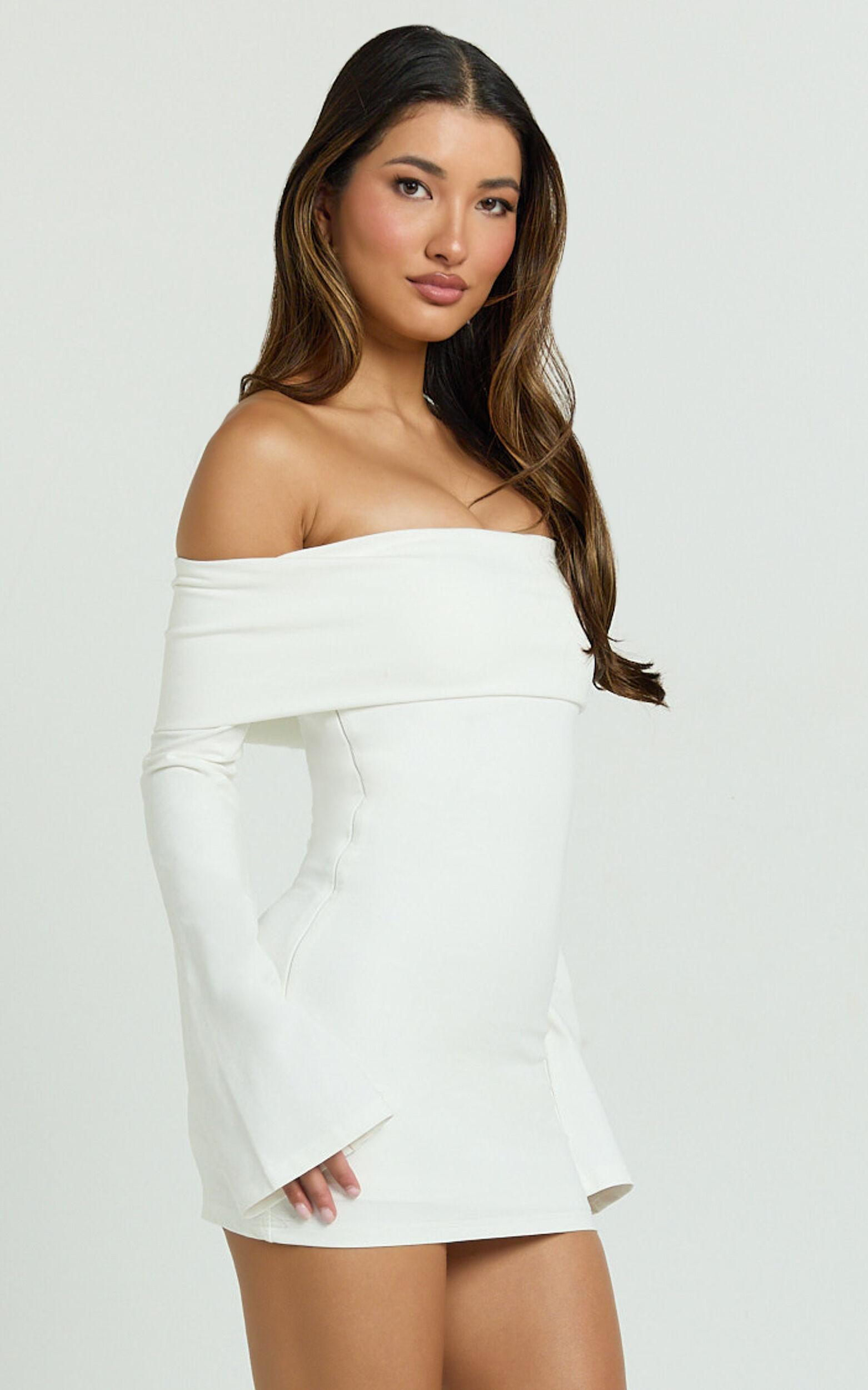 Esme Mini Dress - Off Shoulder Wide Sleeve Fitted Skirt Dress in Off White