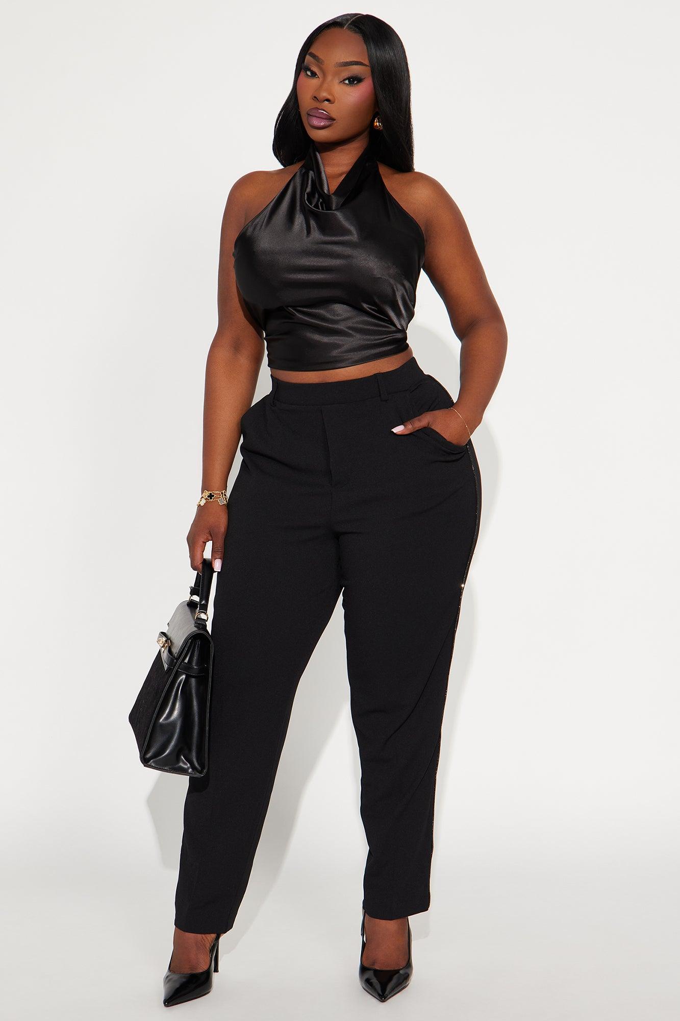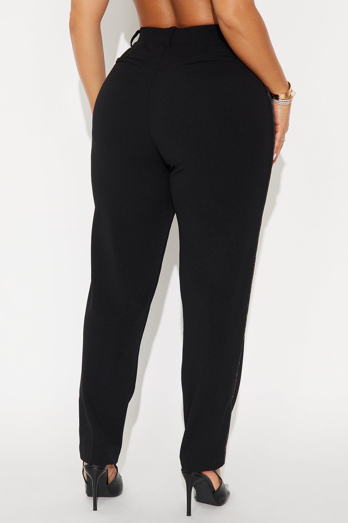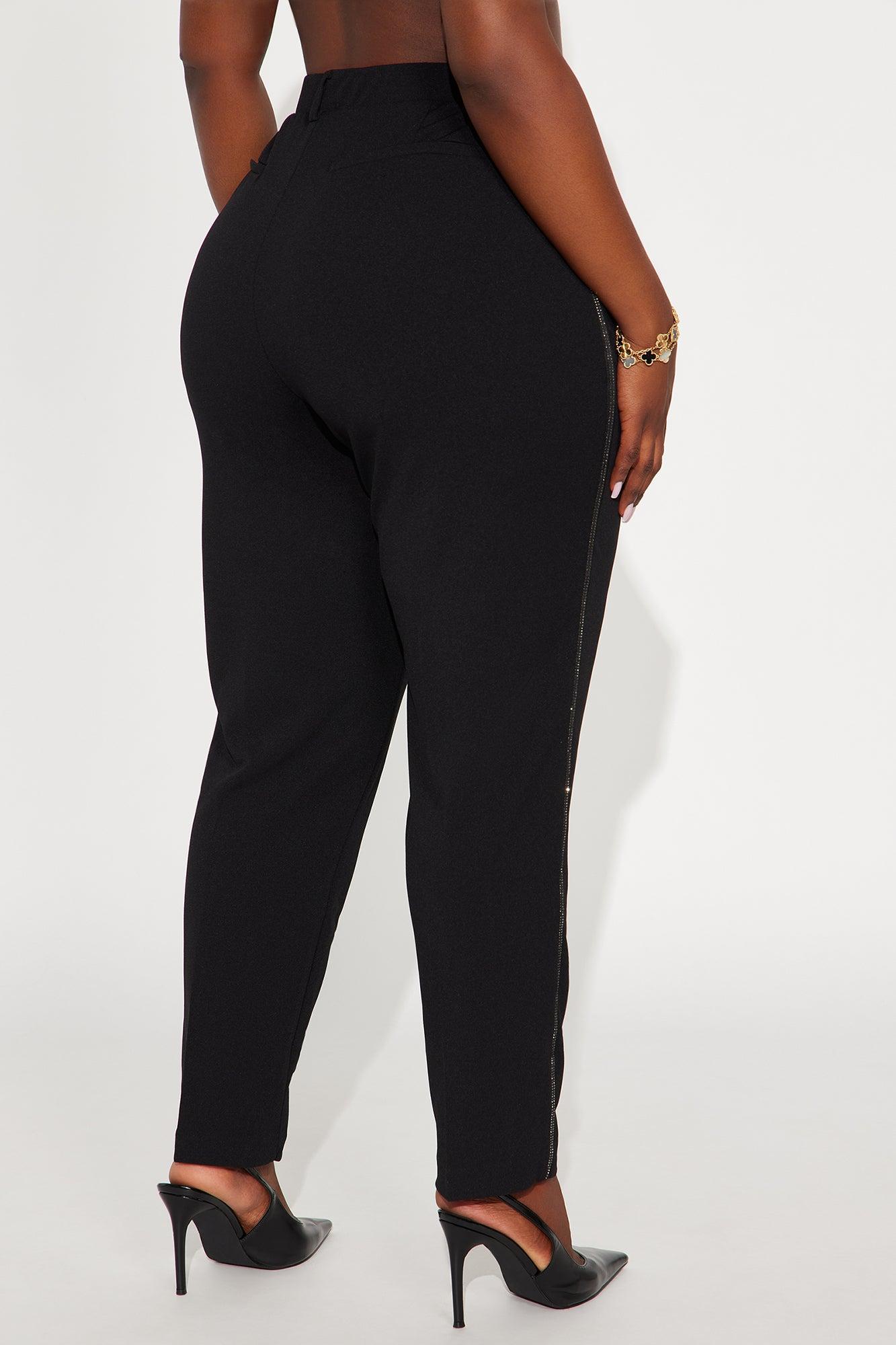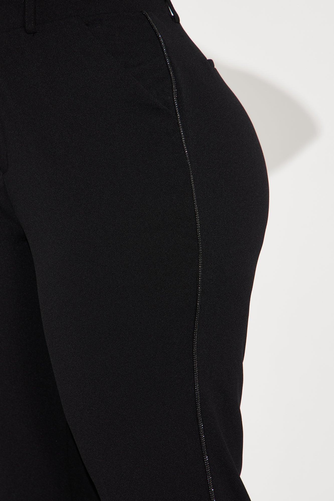 Available In Black. Trouser Pant Elastic Waistband Mid Rise Crepe Knit Rhinestone Trim 29" Inseam Pockets Stretch 95% Polyester 5% Spandex Imported