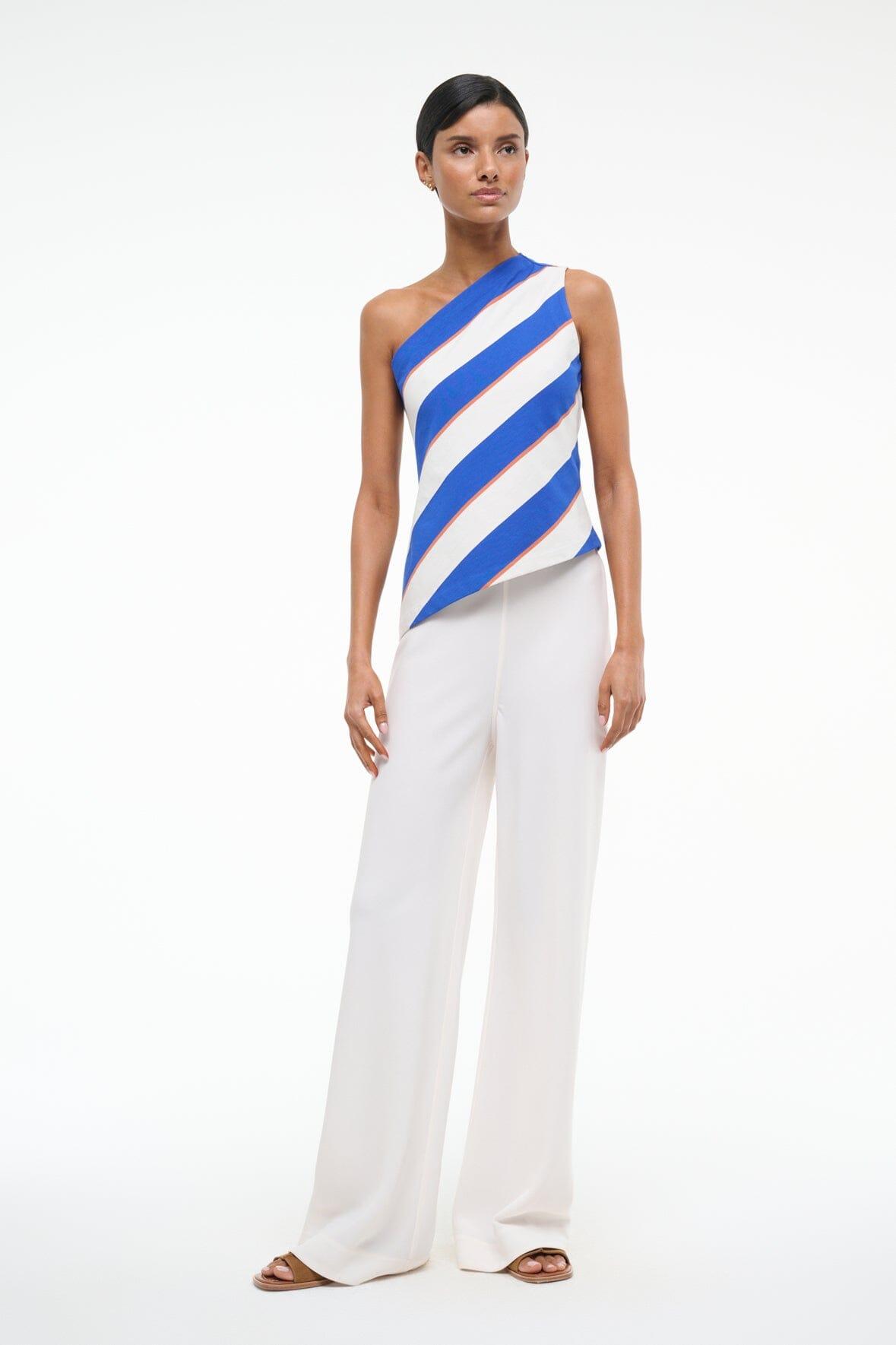 The Esme Top is a one shoulder sleeveless jersey top, featuring an asymmetrical hem, in our seasonal rugby stripe.