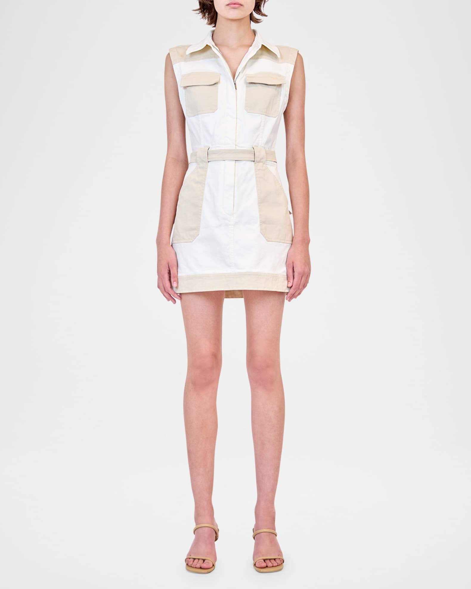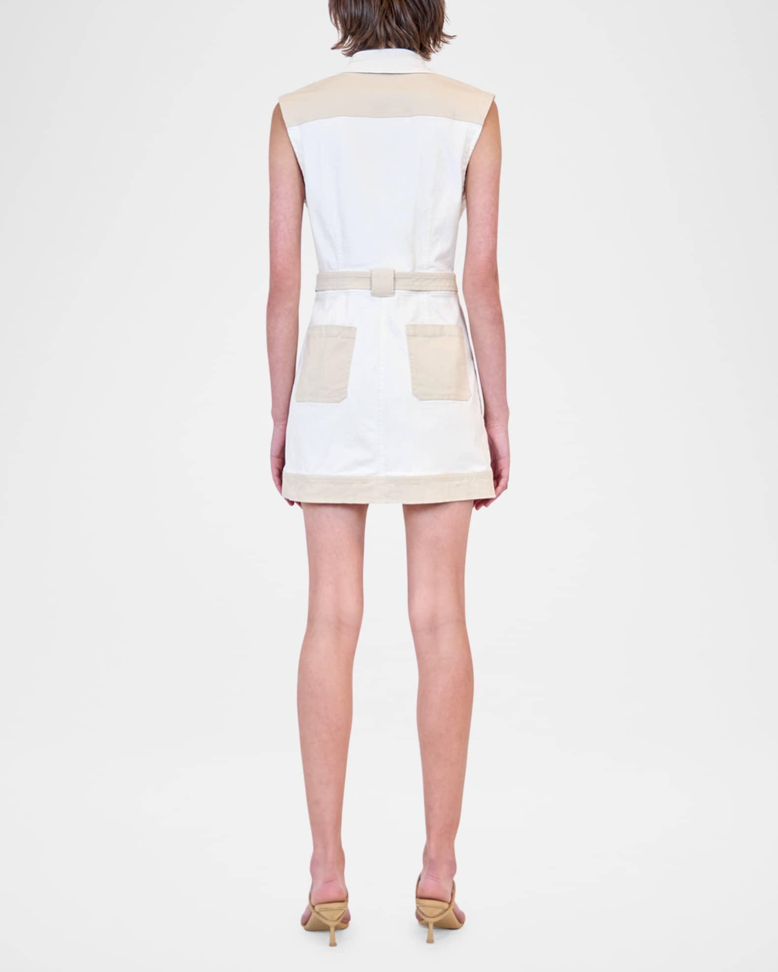 SIMKHAI "Esmee" two-tone utility-inspired mini dress with a belted waist Point collar Sleeveless Dual chest pockets Front and back patch pockets Shirtdress silhouette Hem falls above the knee Concealed zip-front Cotton/viscose/elastane Dry clean Imported