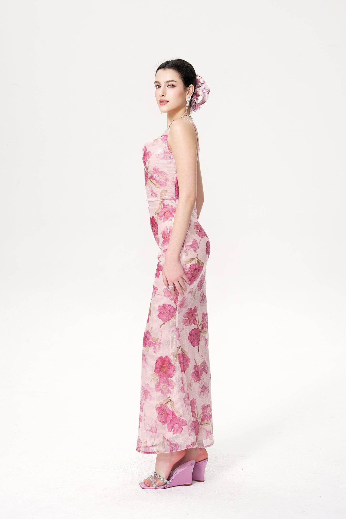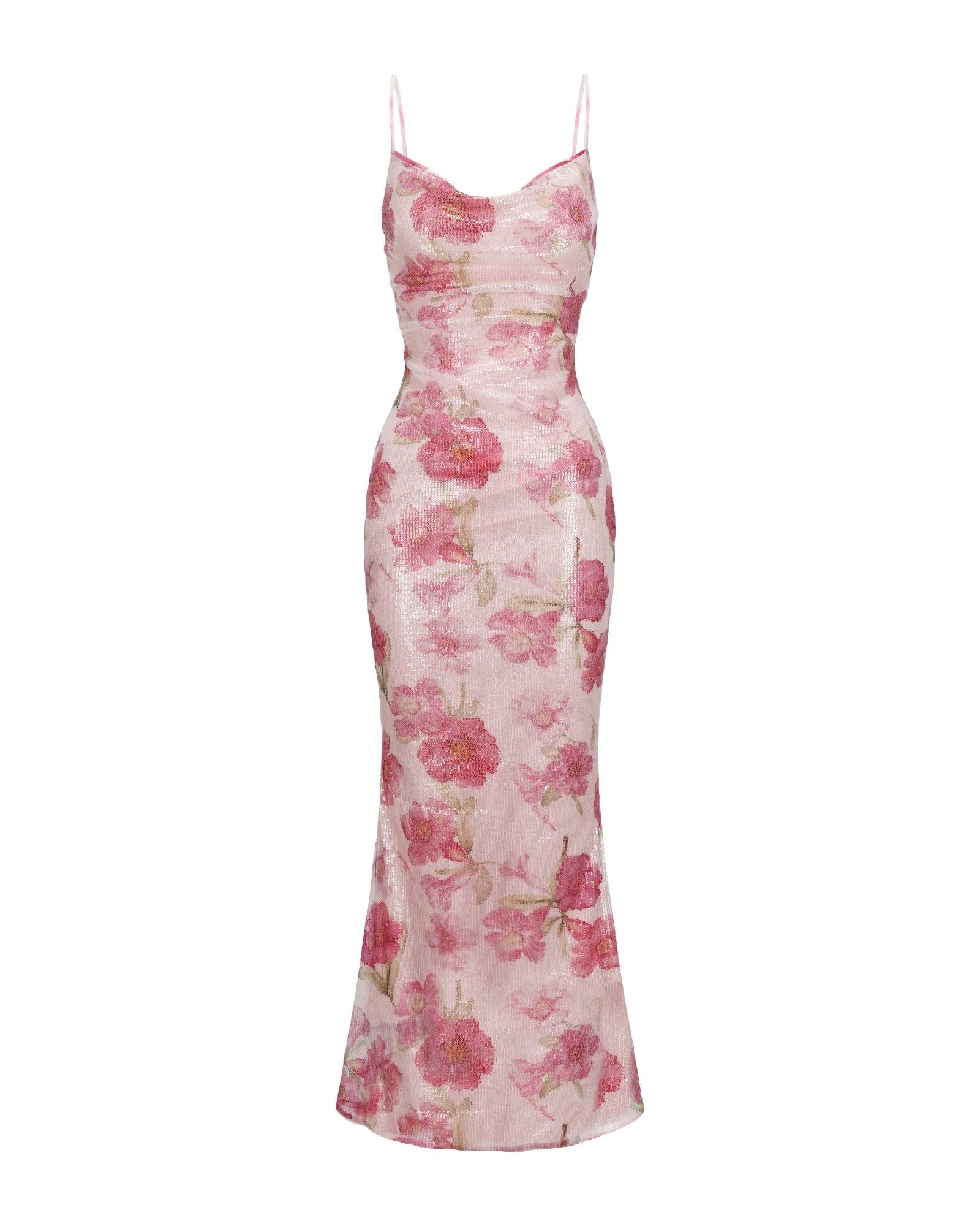 Features:Material: Elastic sequin fabric printed with NJ’s exclusive pomegranate floral pattern for a luminous, textured look.Fit: Slim silhouette with natural waist folds for a flattering but comfortable fit.Design: Sparkly sequined suspender dress with a fishtail hem that moves beautifully.Details: Adjustable shoulder straps and hidden side zipper for a perfect fit.Styling: This romantic sparkling maxi dress is perfect for evening events, parties, and special occasions.