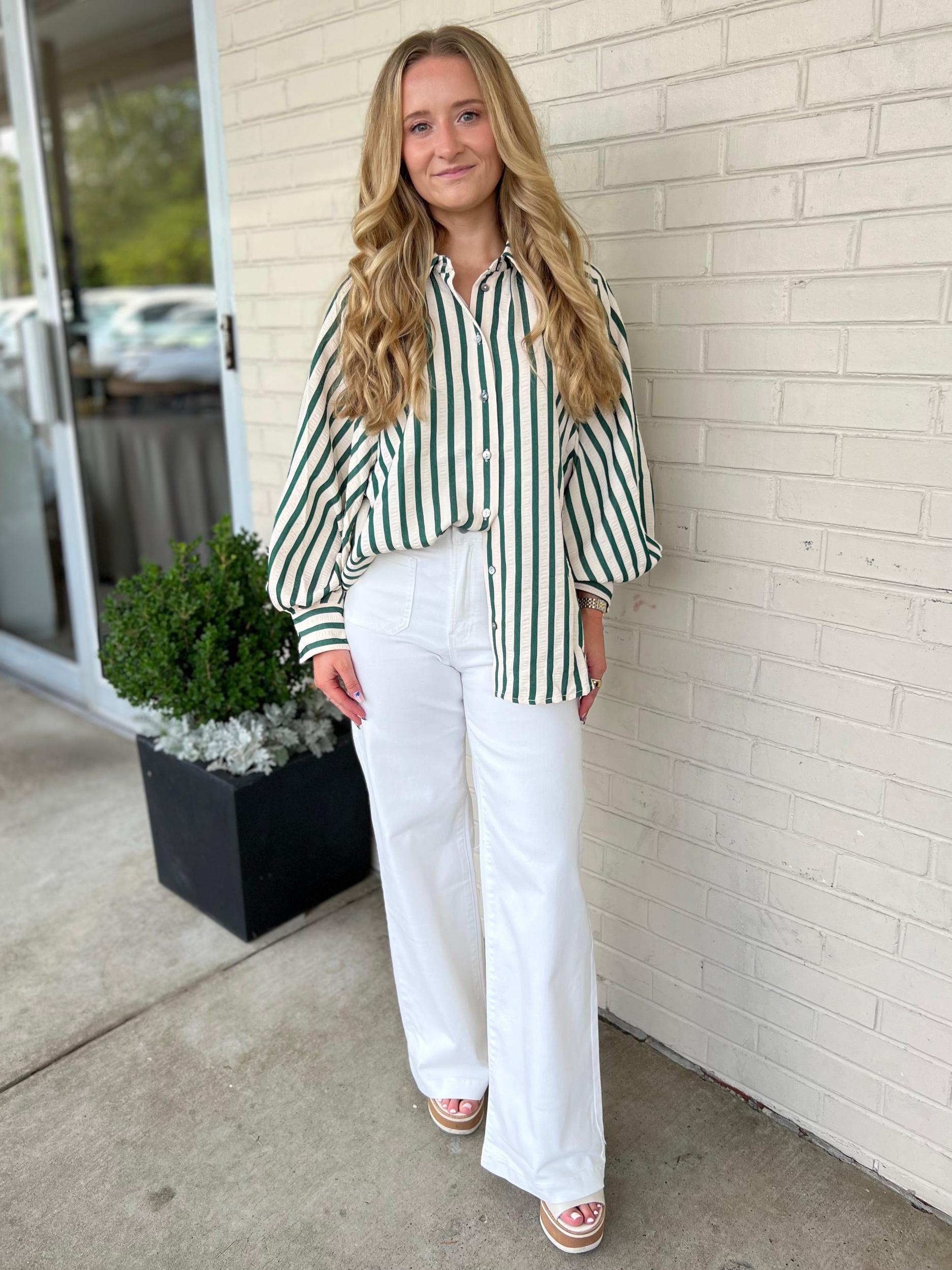 The Esmerelda Top brings a playful twist to your wardrobe with its stripe-patterned fabric and breezy dolman sleeves. Lightweight and woven for comfort, this unlined shirt features a classic collar and button front, perfect for layering or wearing solo. Its non-sheer design keeps things easy and effortless, making it your go-to for casual days with a fun flair.