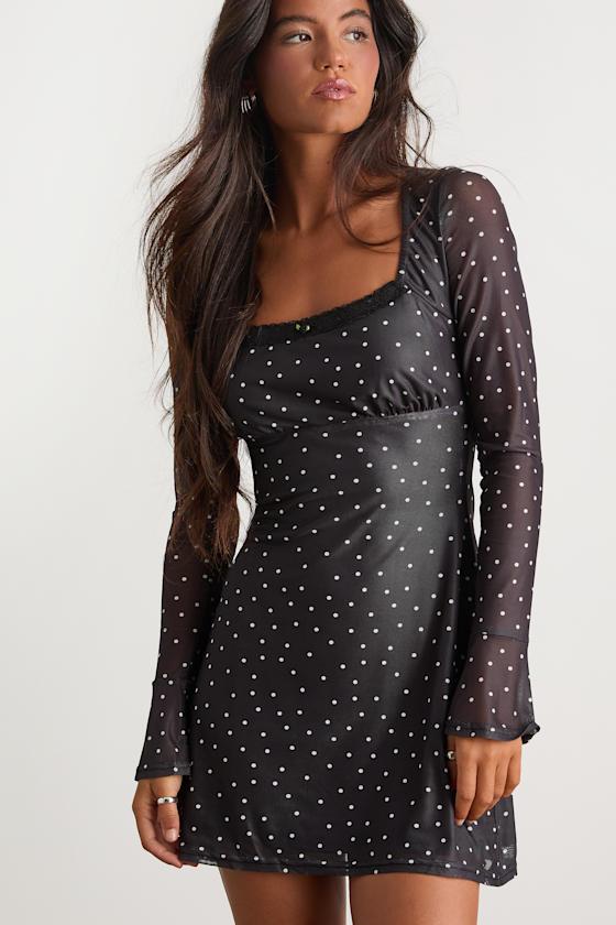 You'll be the biggest catch of the season in the Lulus Especially Adored Black Polka Dot Long Sleeve Mini Dress! A classic white polka dot print adorns stretchy mesh as it shapes a square neckline with lacy trim and a rosette detail, all framed by long sleeves with elastic at the shoulders and flared cuffs. Fitted bodice boasts an empire waist that continues into a figure-skimming A-line skirt with a mini hem. A top loop-button closure secures atop a keyhole cutout at the back. Hidden back zipper/clasp.