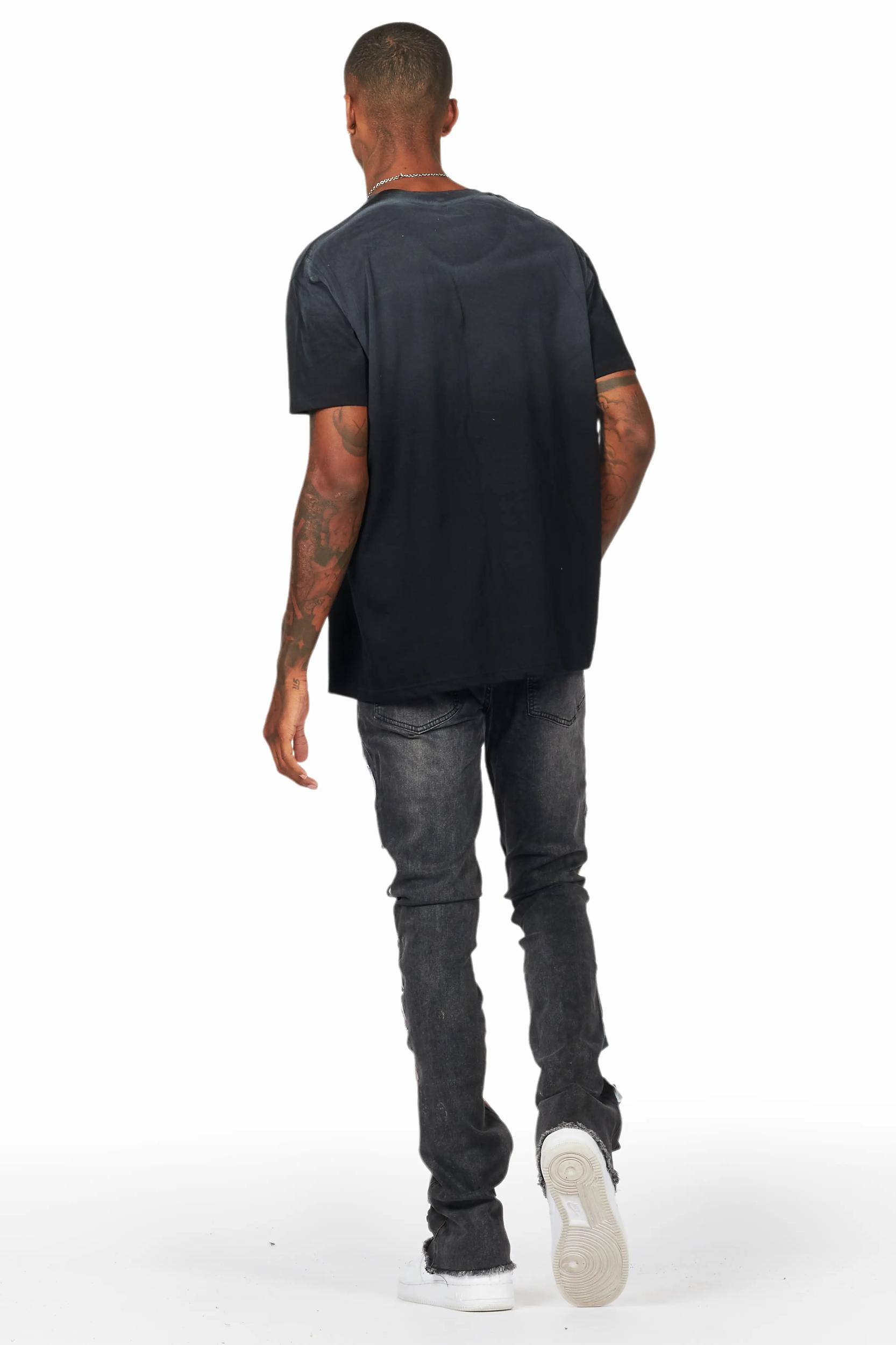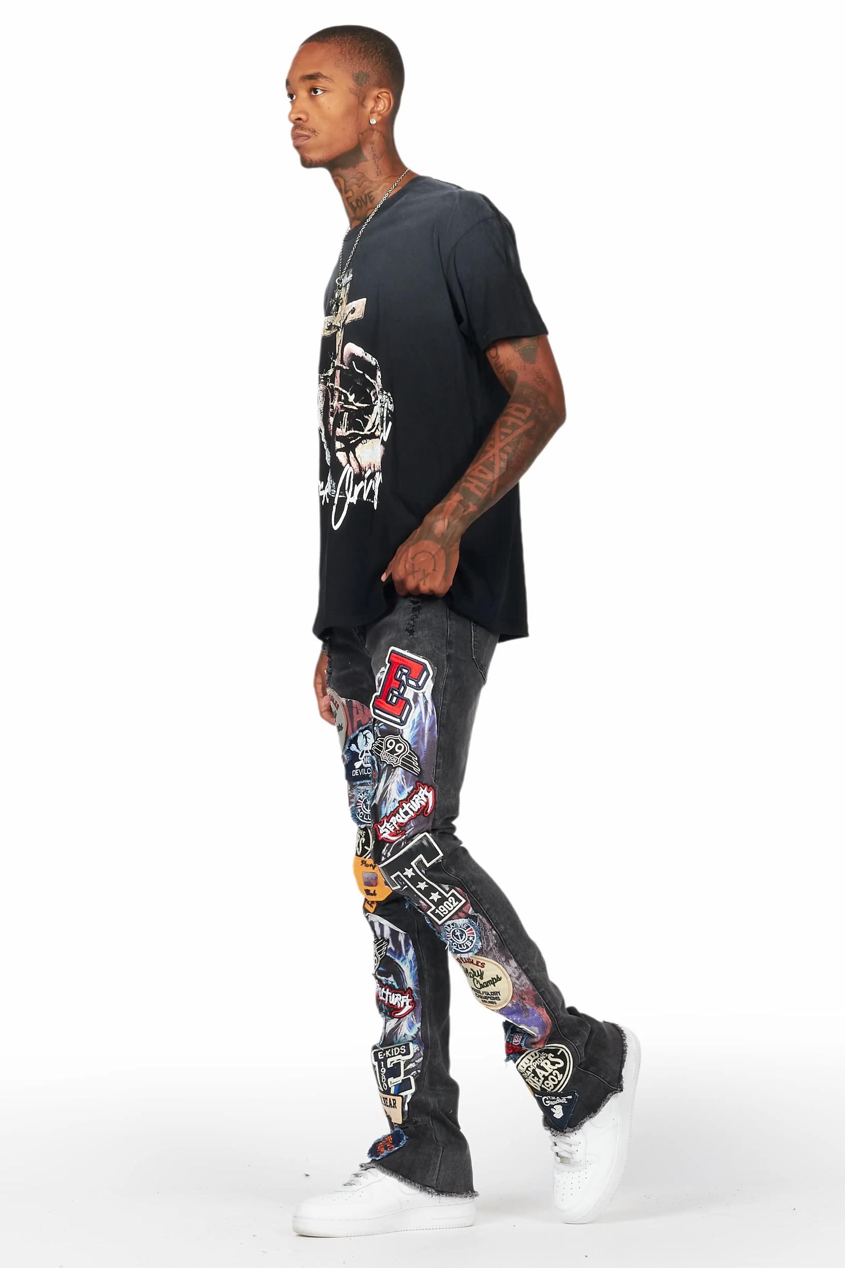 An urban stacked flare denim jean for men in black. Designed with organic cotton and extra long legs for an essential streetwear style. Zip fly with button closure 5-pocket build Distressed detailing Bootcut silhouette Stacked construction Custom patchwork Raw edges Flared leg openings 35.75" seams *NOTE: These jeans are purposefully designed with extra long legs so the fabric properly bunches at the hem, creating the stacked flare style.