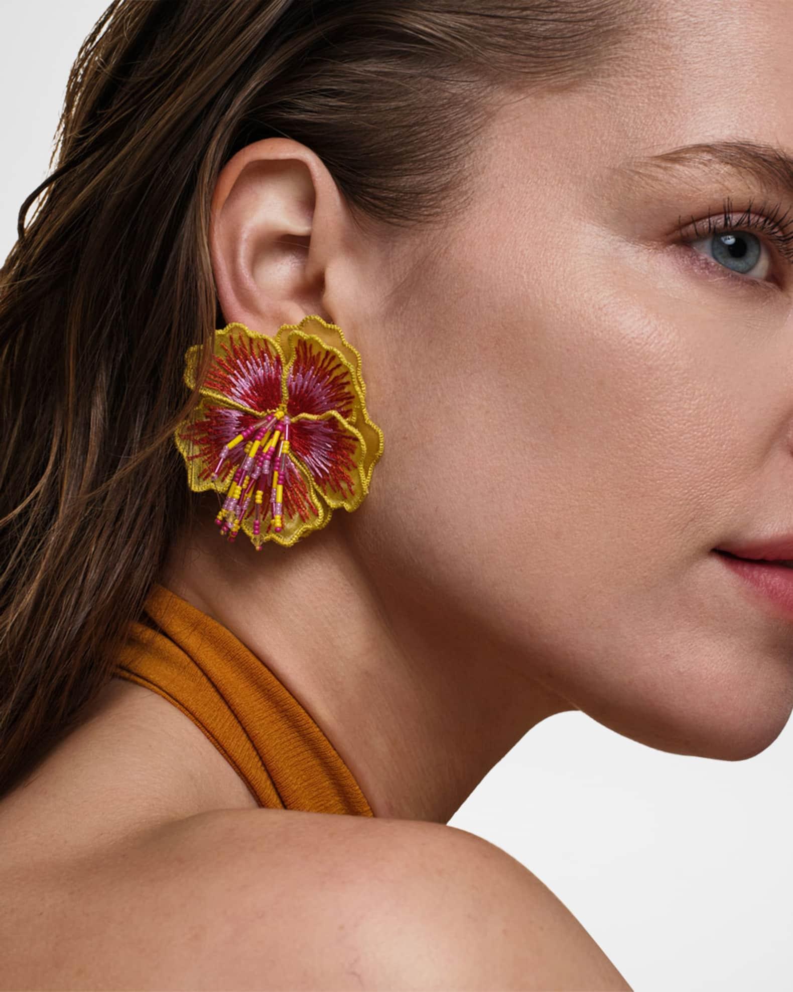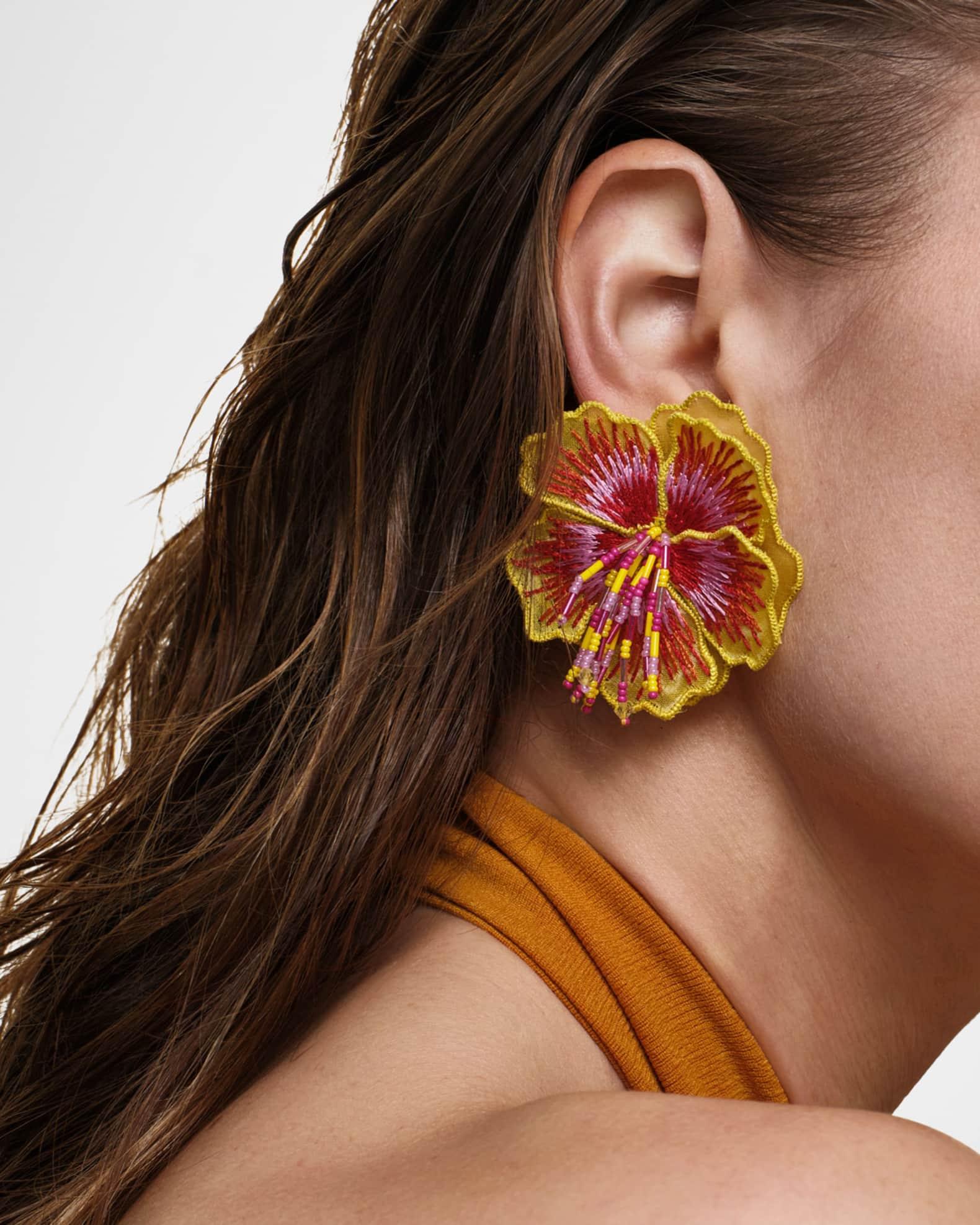 Mignonne Gavigan dazzling hibiscus stud earrings inspired by Mallorca's tropical gardens Approx. 1.9"L Silk organza base 14-karat gold-plated brass hardware Polyester and silk threads Glass bugle and seed beads Genuine leather backing Stainless steel post backs for pierced ears Professional cleaning recommended Imported