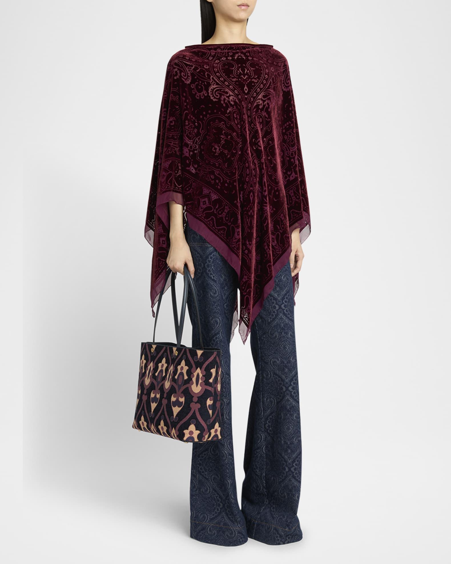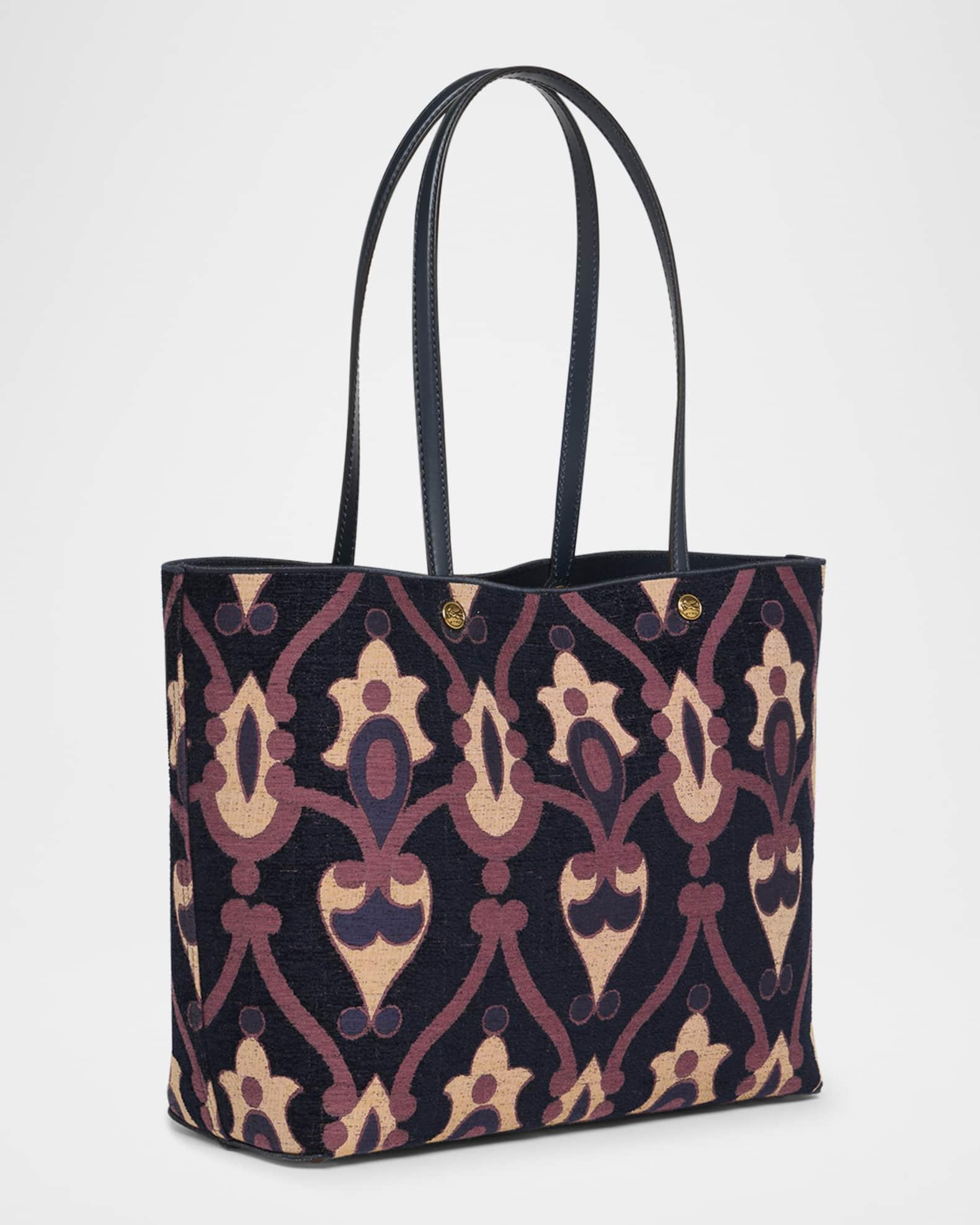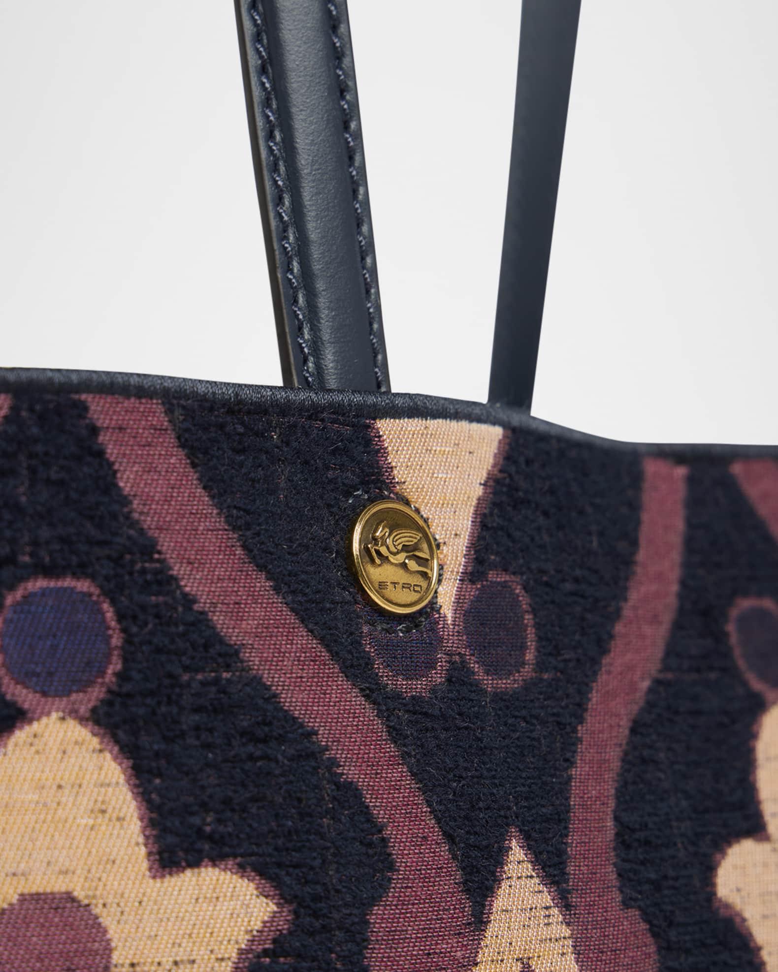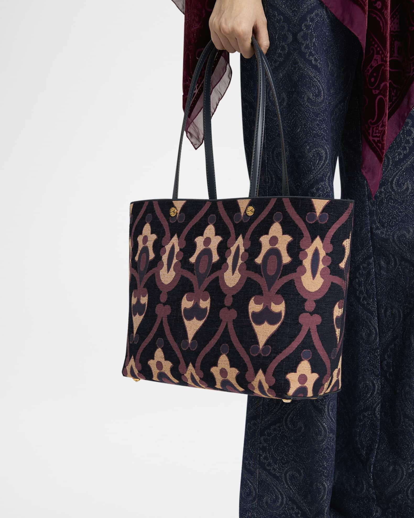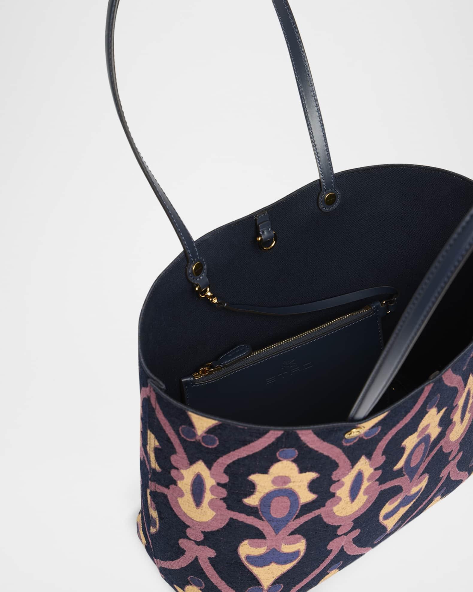 Made of jacquard chenille, the Etro "Essential" shopper tote bag is finished with leather details and raised gold-tone metal Pegaso symbols Flat shoulder straps Open top with push lock closure Interior, removable zip-top pouch Feet protect the bottom of the bag Approx. 11"H x 13"W x 5.5"D Made in Italy