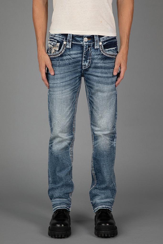 Custom silver buttons and rivets decoration throughout. Inverted Fleur de Lis back pockets embellished with orange stitching, beige and white leather. Hand whiskers and distressing on front legs. "Rock Revival" metal engraved on brown and white snake print leather patch on the belt loop. Designed with care and creativity in Los Angeles, California.