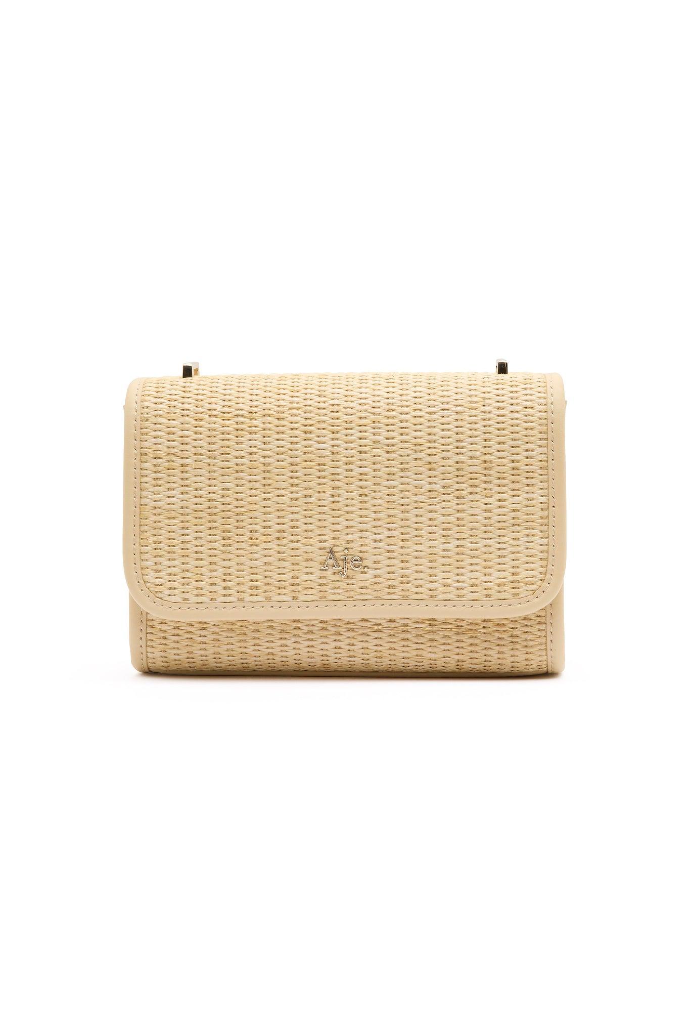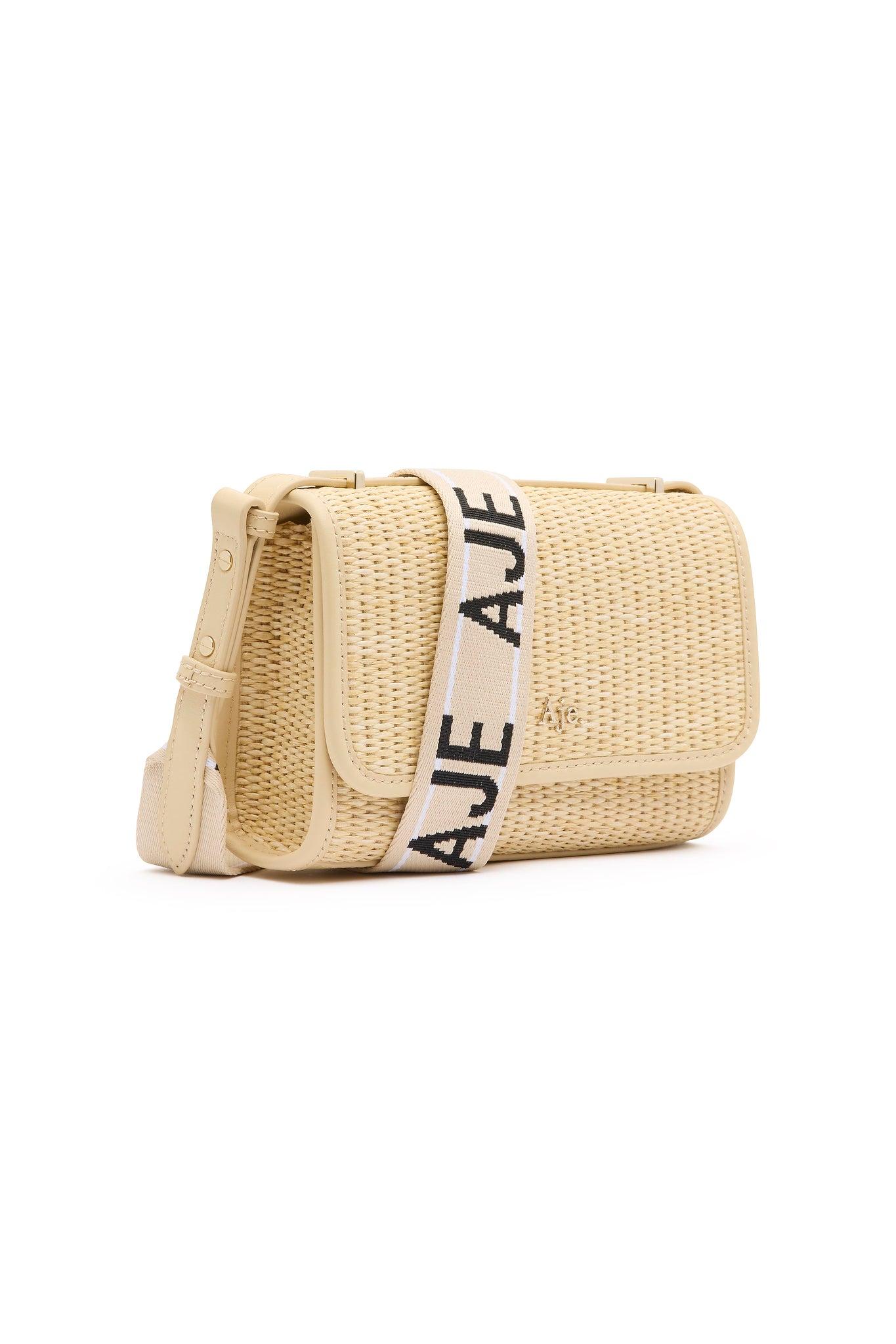 PRODUCT DETAILS Woven crossbody bag Adjustable woven logo crossbody strap Gold logo hardware Concealed magnetic flap closure Internal zip pocket on back wall Cotton twill lining Shell: 100% Straw Lining: 100% Cotton Trim: 100% Leather Shop All Bags SIZE AND FIT Height 14cm Width 22.3cm Depth 11cm Strap Drop 82cm