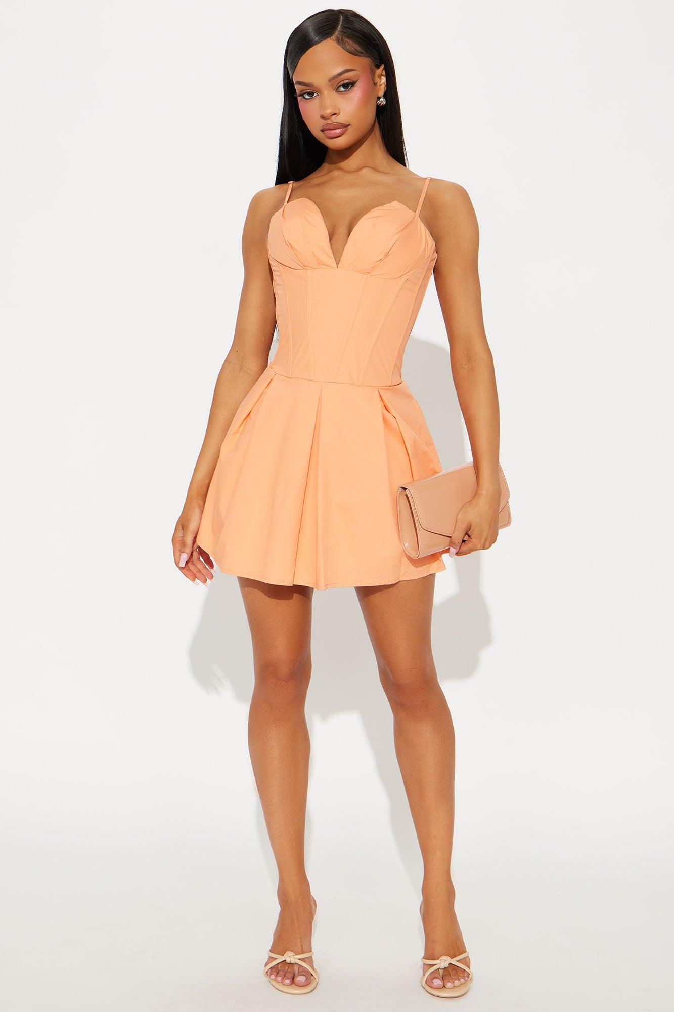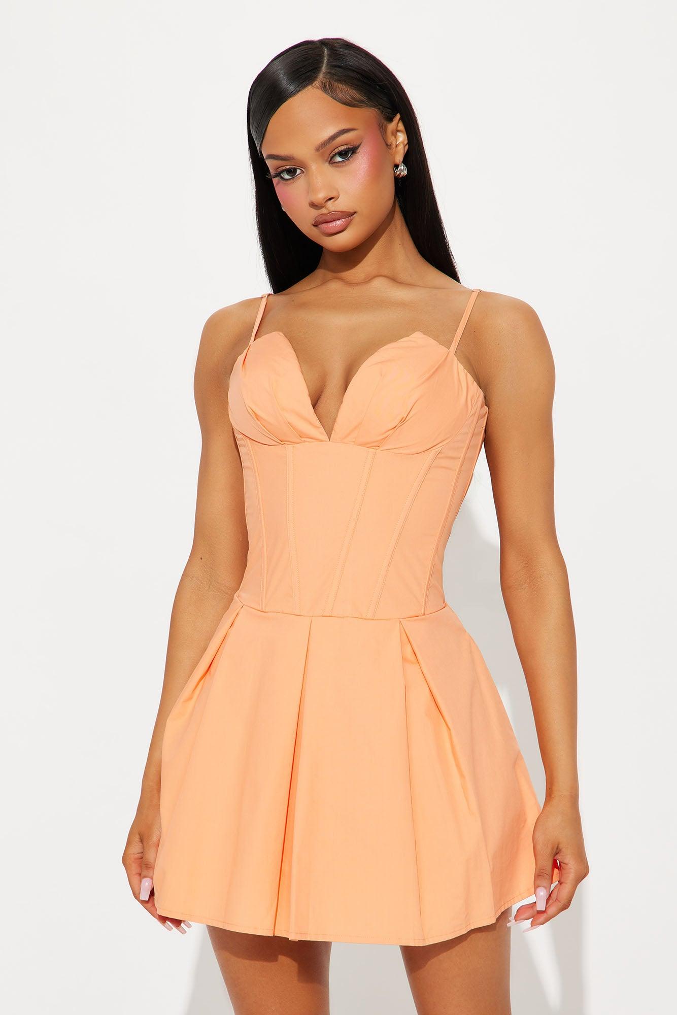 Available In Orange. Poplin Mini Dress Deep V-neck Padded Grip Tape Adjustable Spaghetti Straps Corset Waist Pockets Pleated Skirt Back Zipper Length Measured Flat = 32" Shell: 100% Cotton Contrast: 100% Polyester Lining: 97% Polyester 3% Spandex Imported